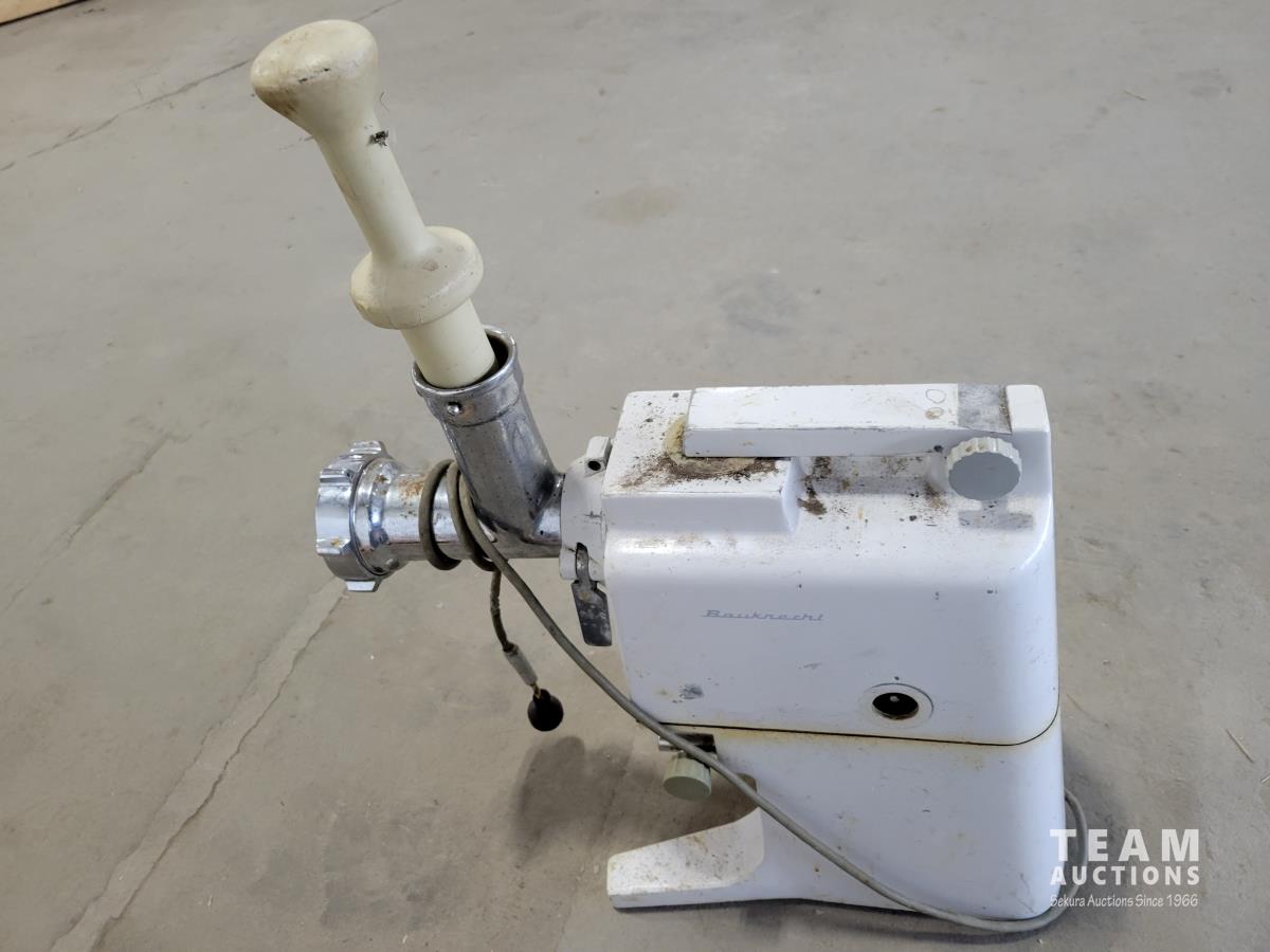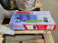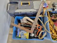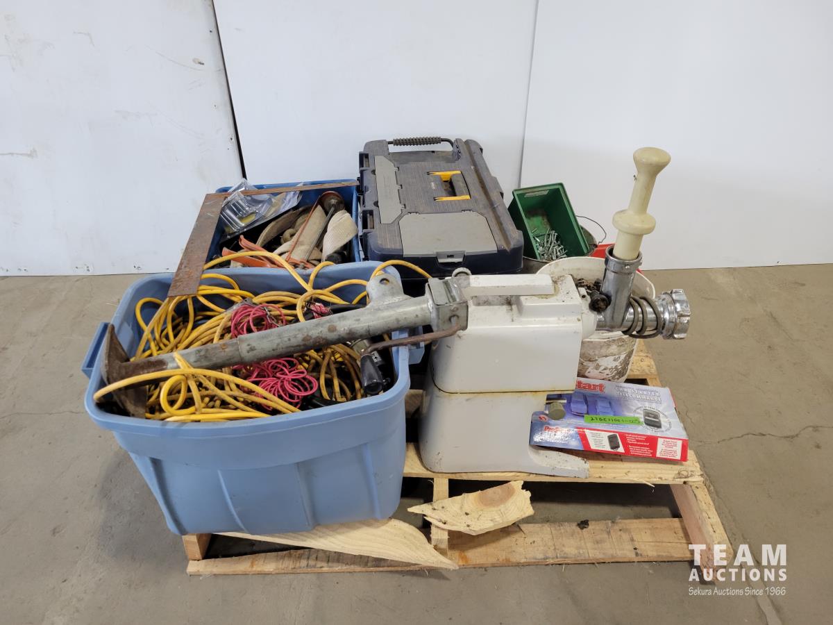 Prostart remote control car starter, vintage Baukrecht meat grinder, trailer jack, qty of extension cords, 3 pieces tool hanger set, qty of hand tools and various hardware