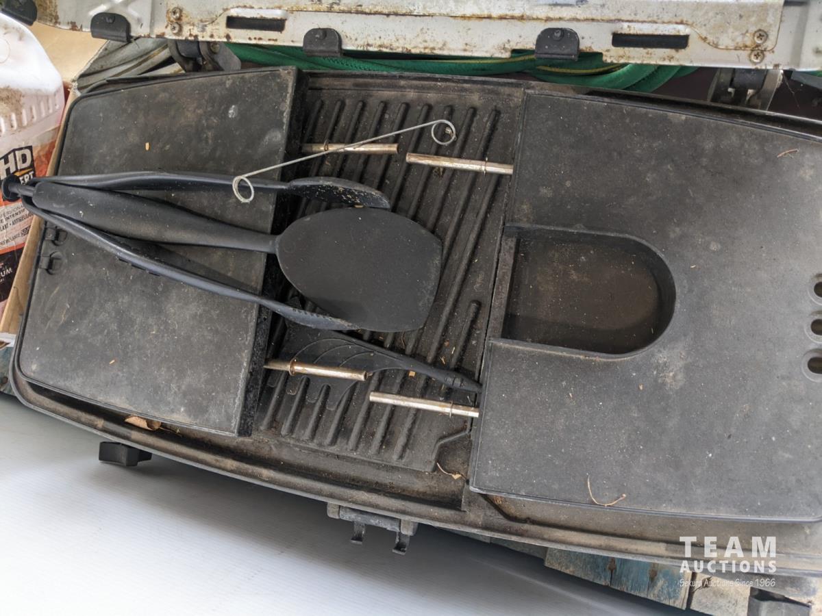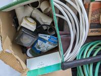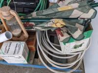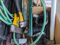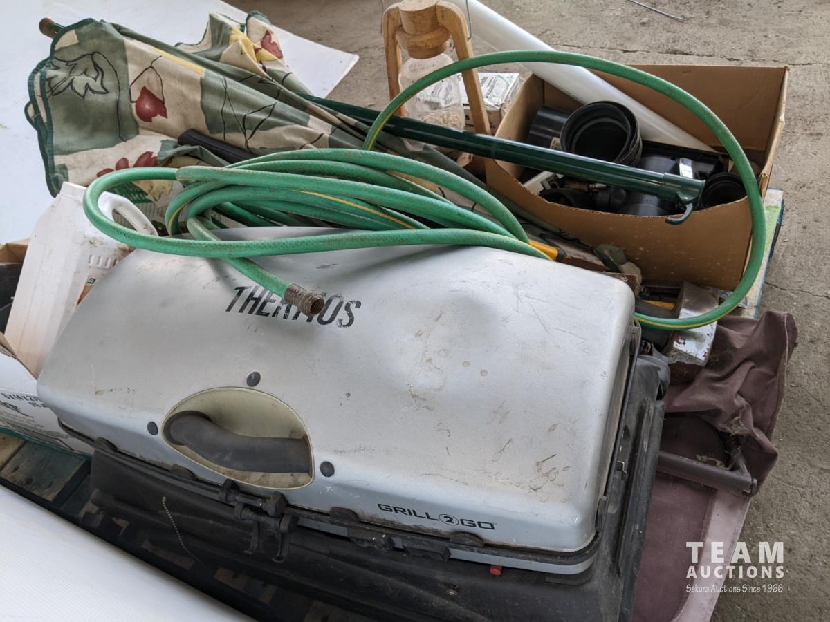 Grill, umbrella, hoses and axes