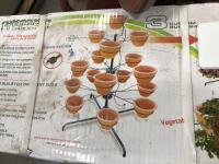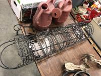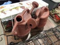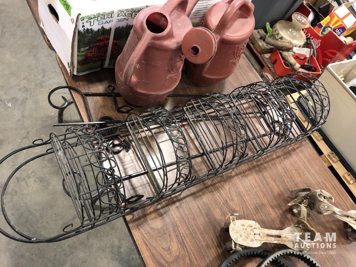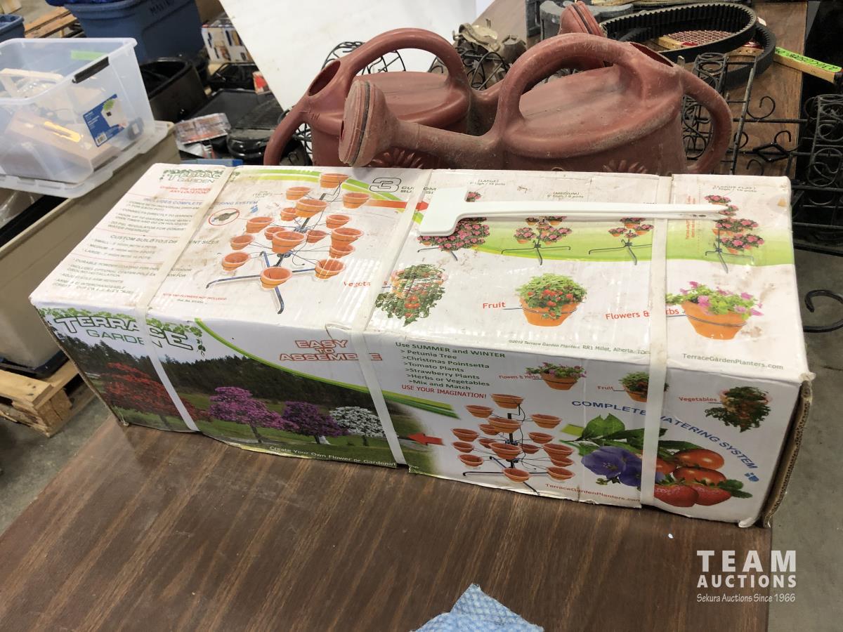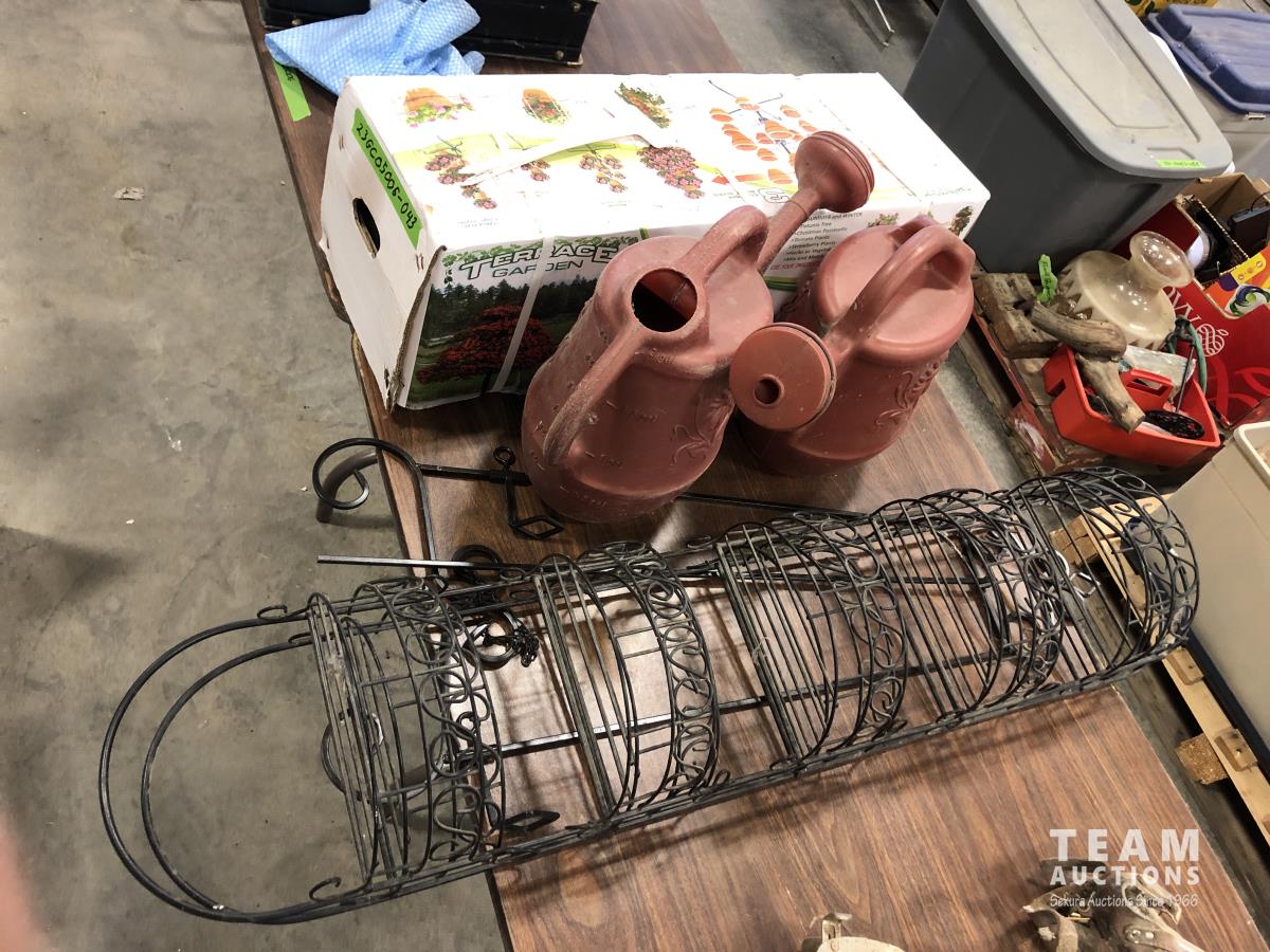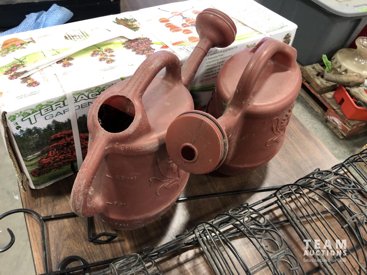Terrace garden (pot stand and pots), (2) watering cans, (2) wire garden ornaments and metal tripod stand