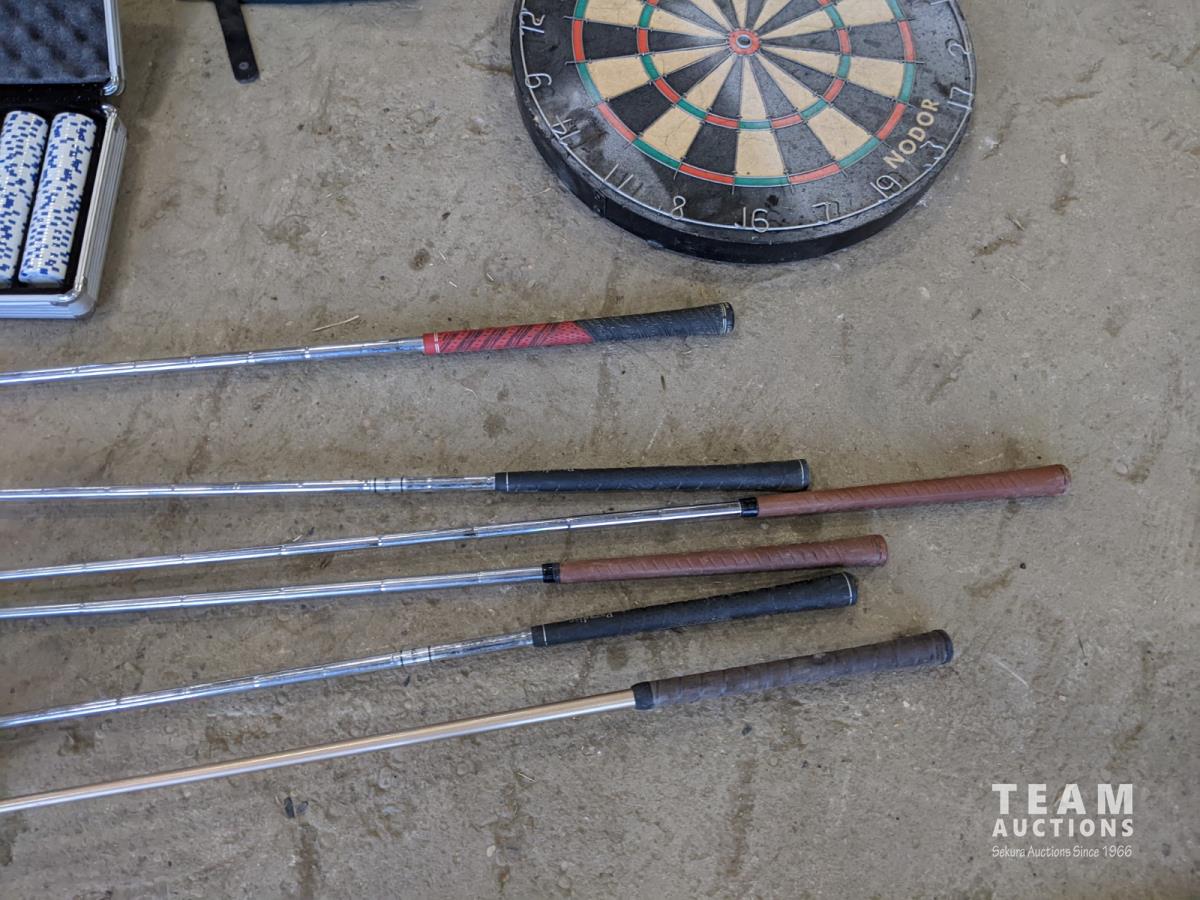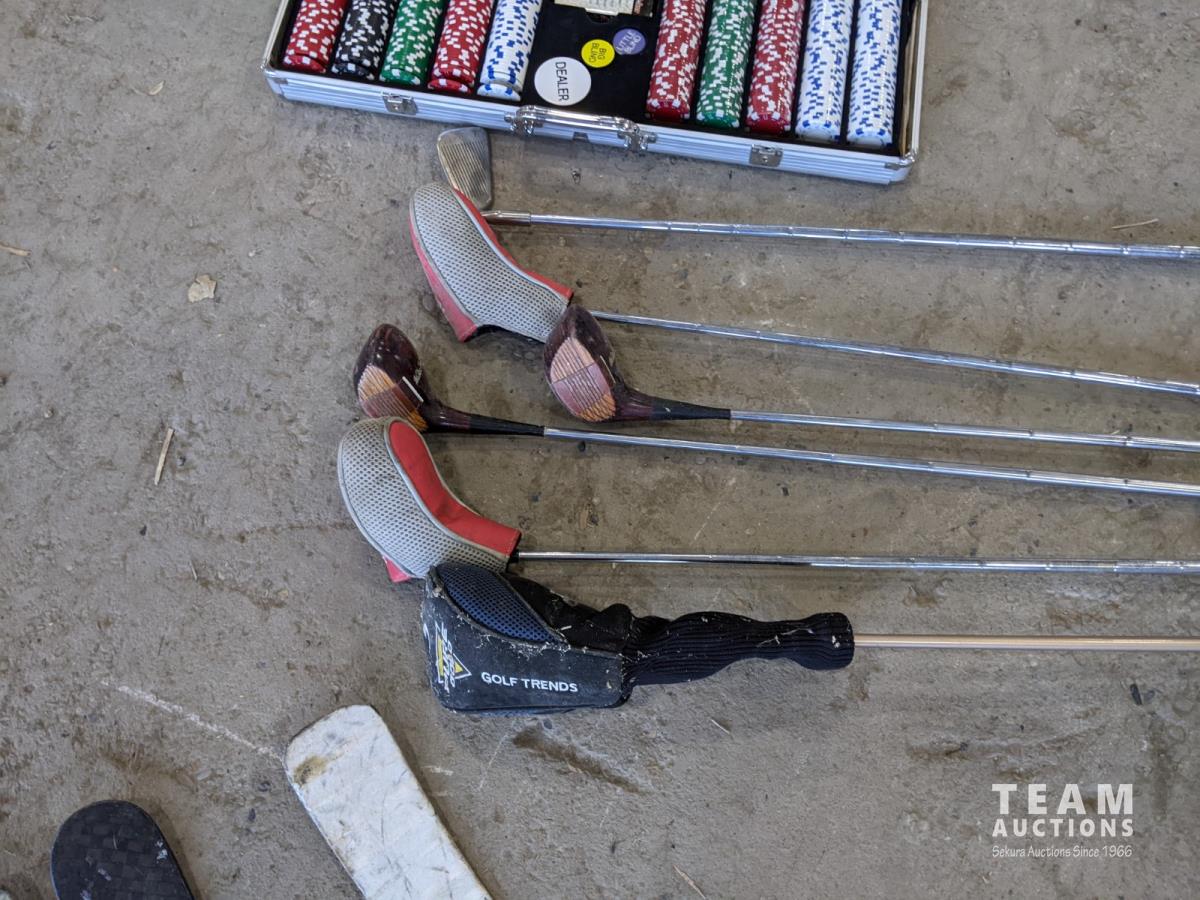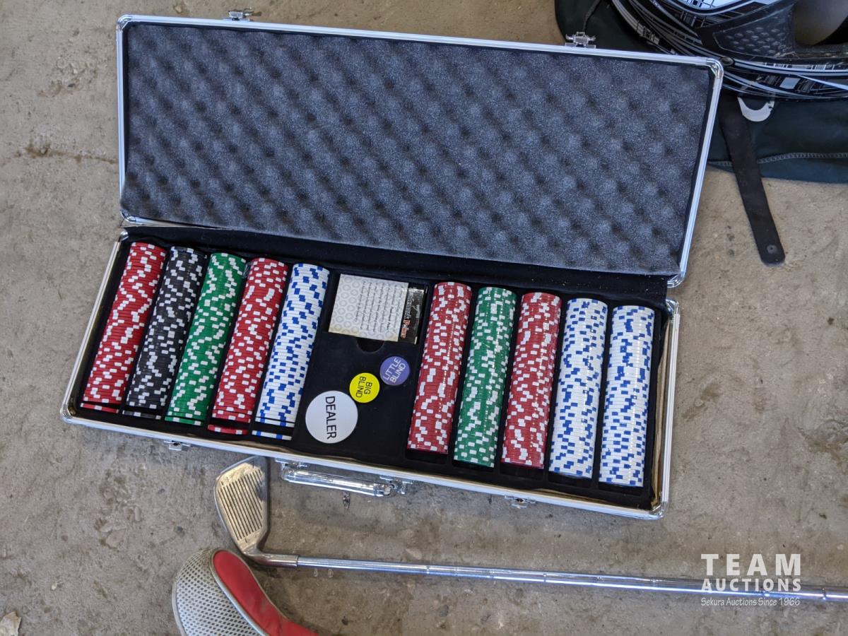 Poker set, dart board, golf clubs, hockey sticks and size xxl helmet
