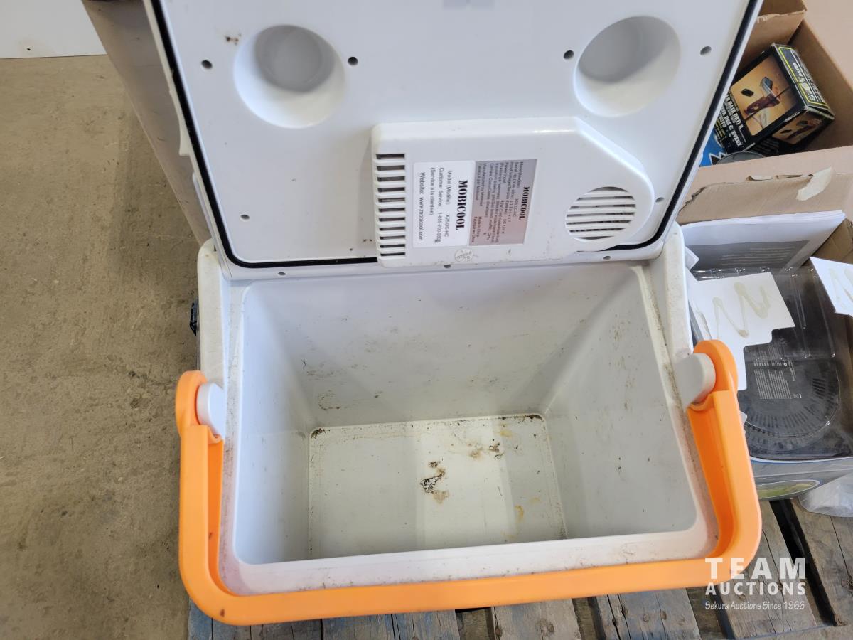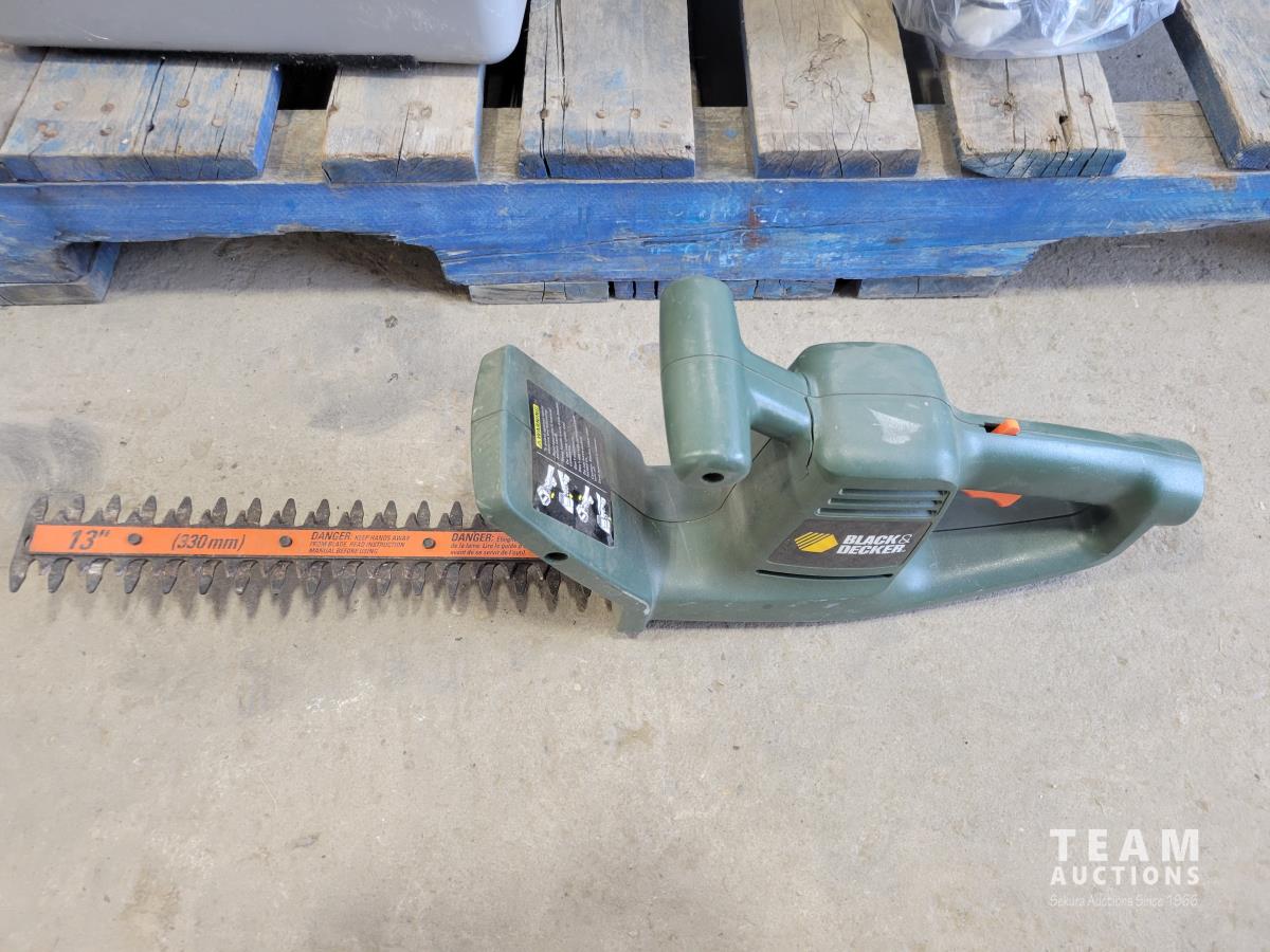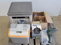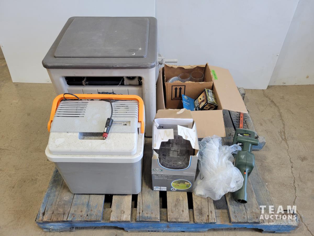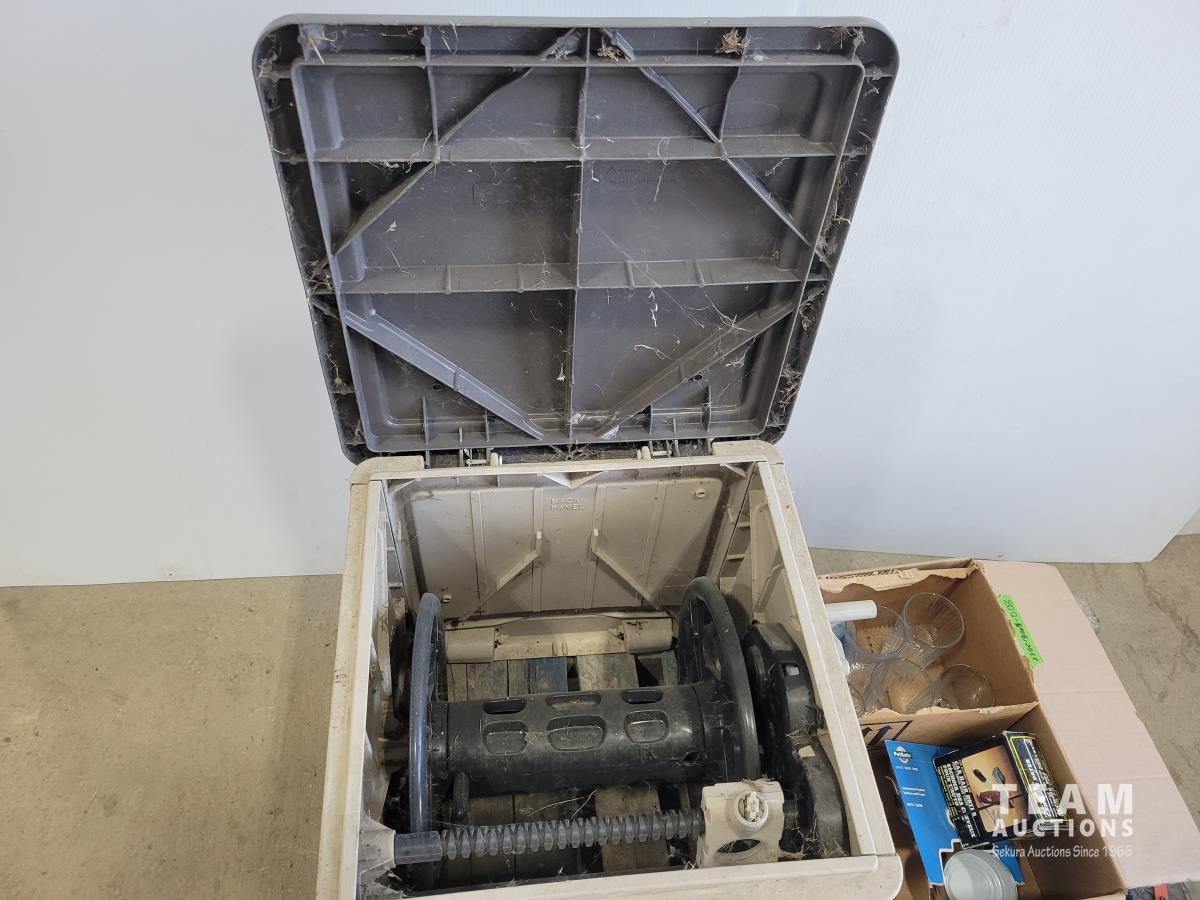 Deck hose reel, Mobicool electric cooler, Black & Decker 13 inch electric hedge trimmer, Pet Safe stay and play wireless fence, car hair dryer and (5) glasses