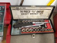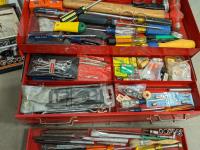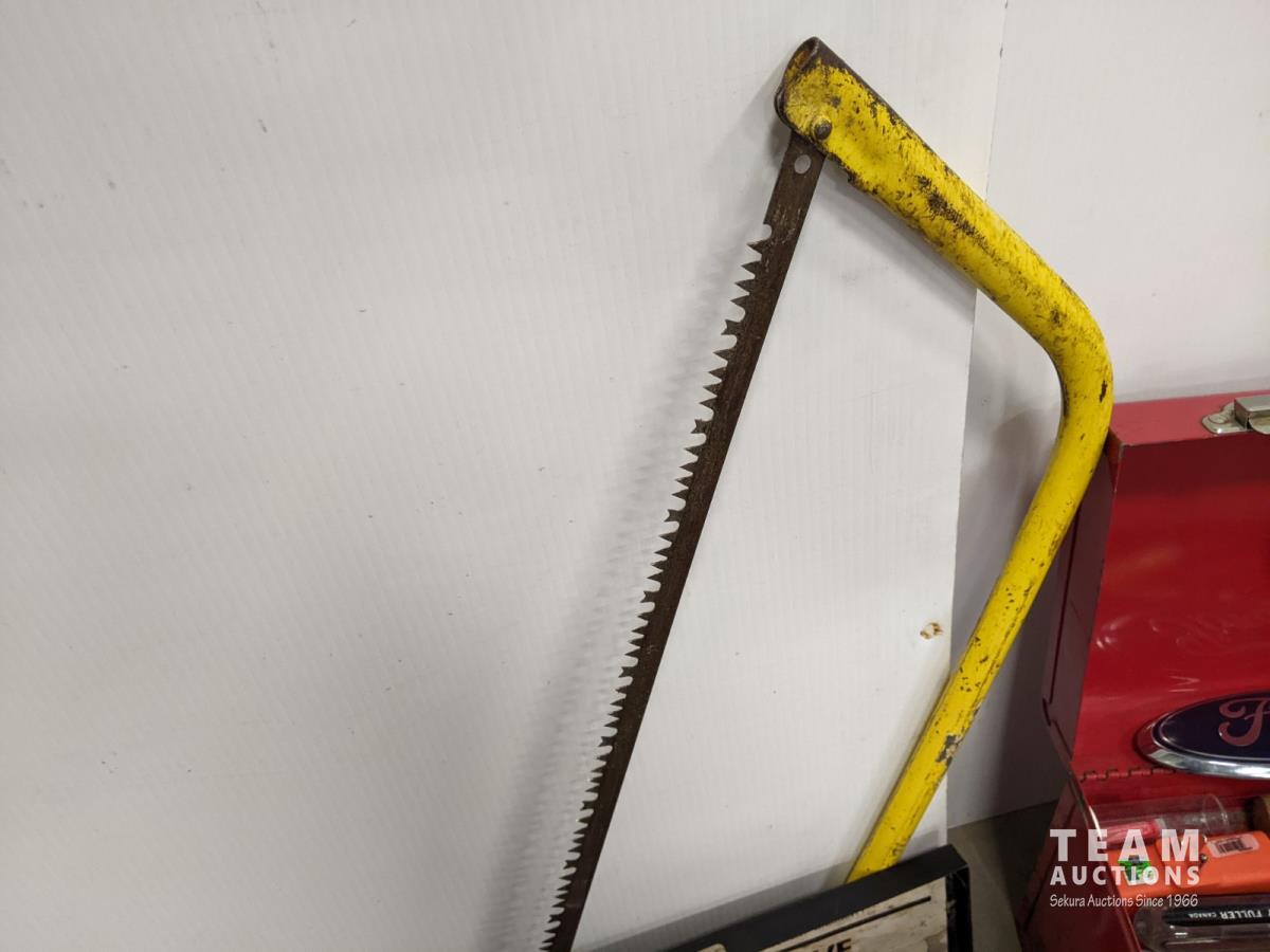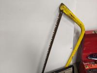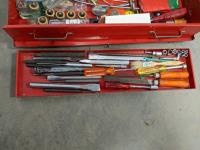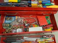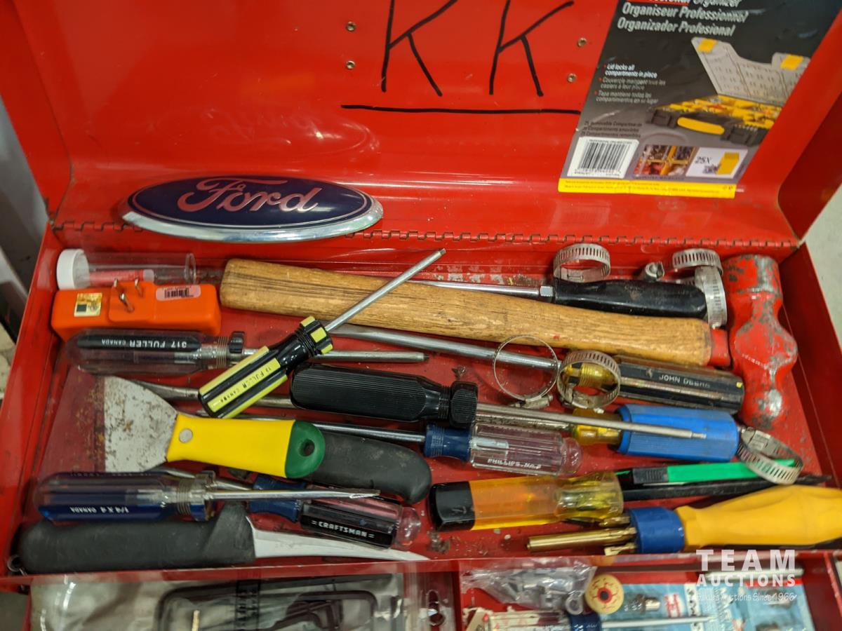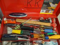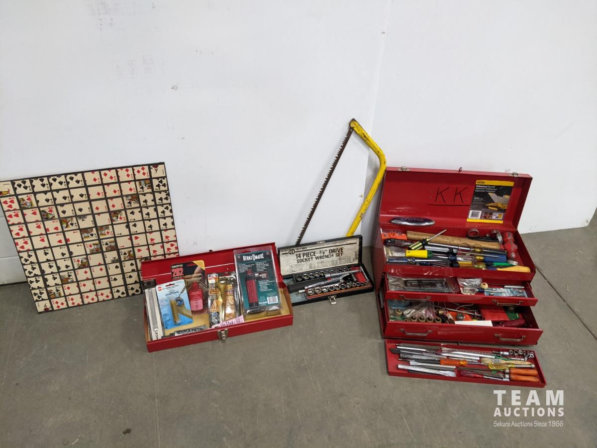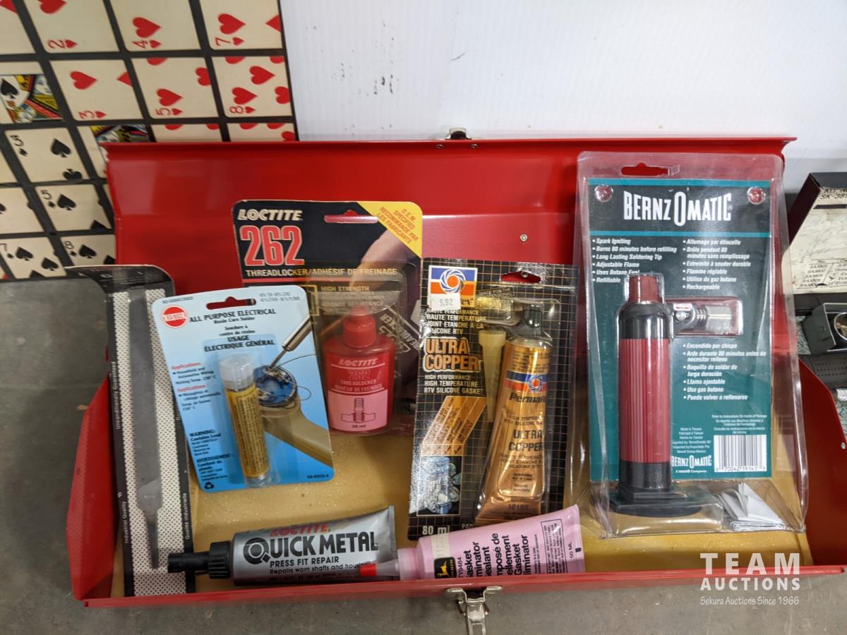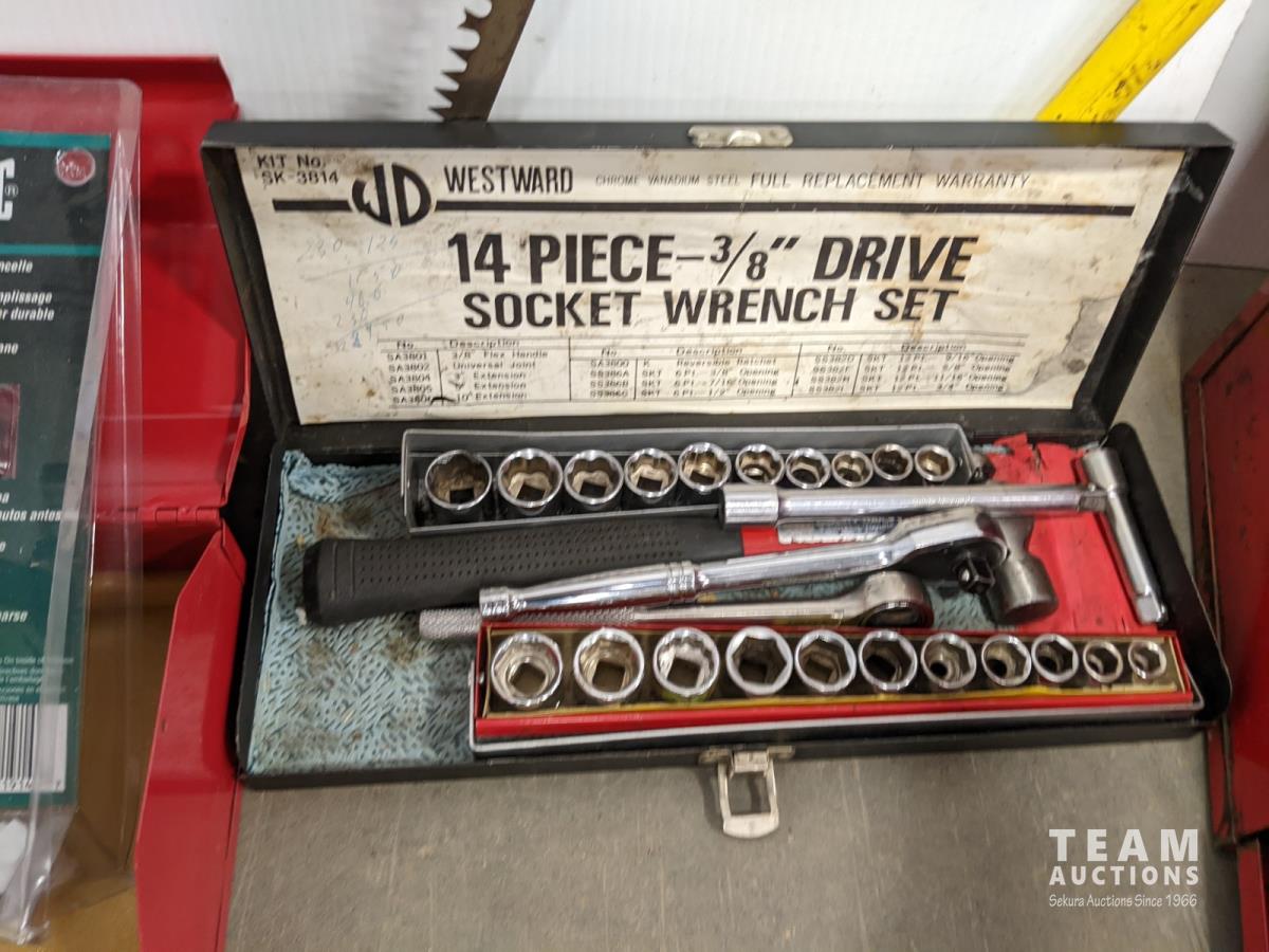 Tool box with bernzomatic, loctite, file, 14 piece 3/8 inch drive socket wrench set, tool box with assorted tools (screwdrivers, fuses, files, hammer), poster and hand saw