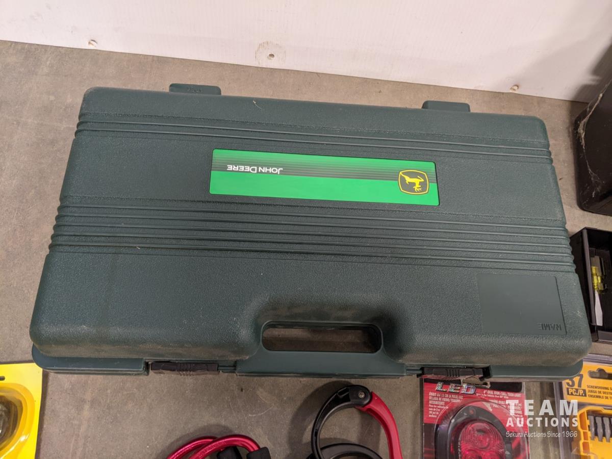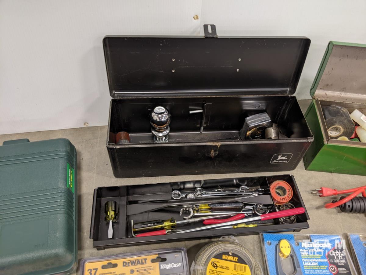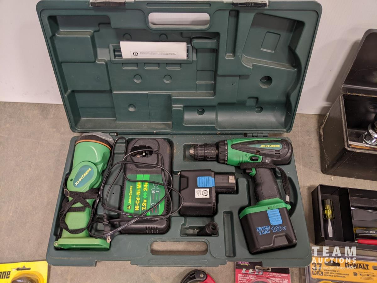 John Deere 18v drill and flashlight, battery charger, tool boxes with assorted tools, clamps, Dewalt 37 bit set and trouble light