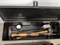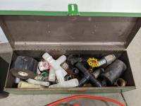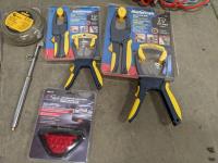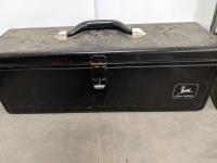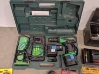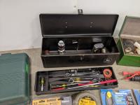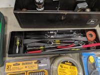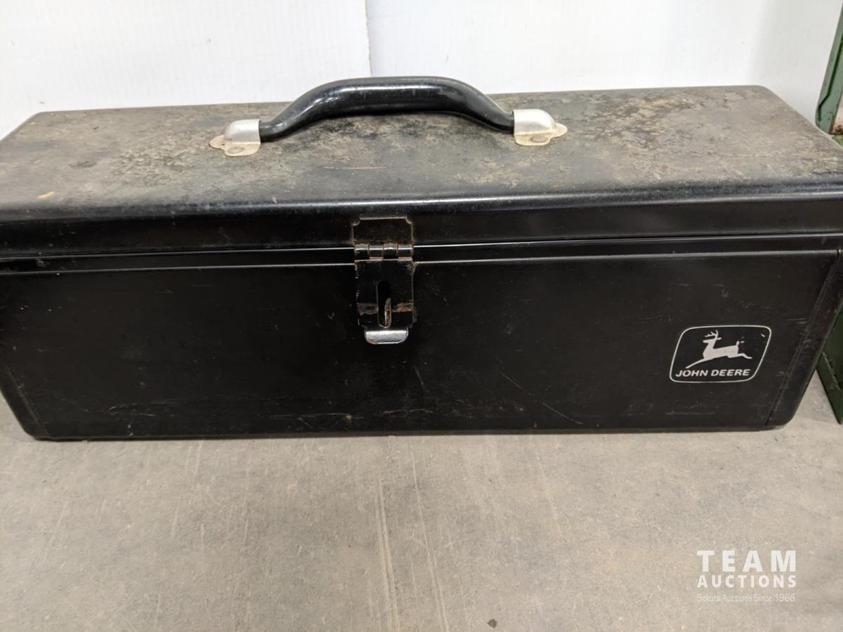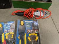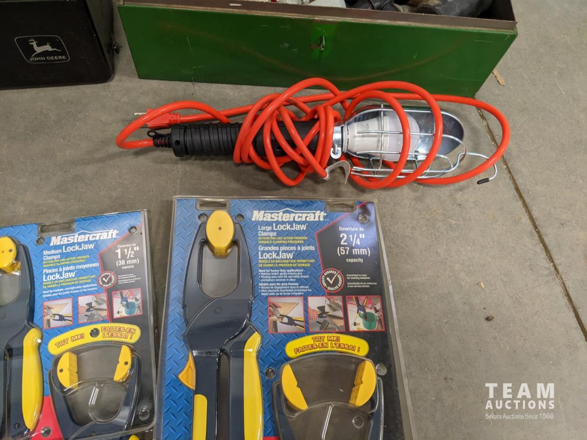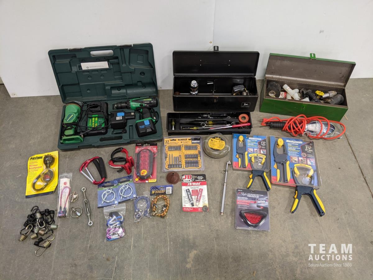 John Deere 18v drill and flashlight, battery charger, tool boxes with assorted tools, clamps, Dewalt 37 bit set and trouble light