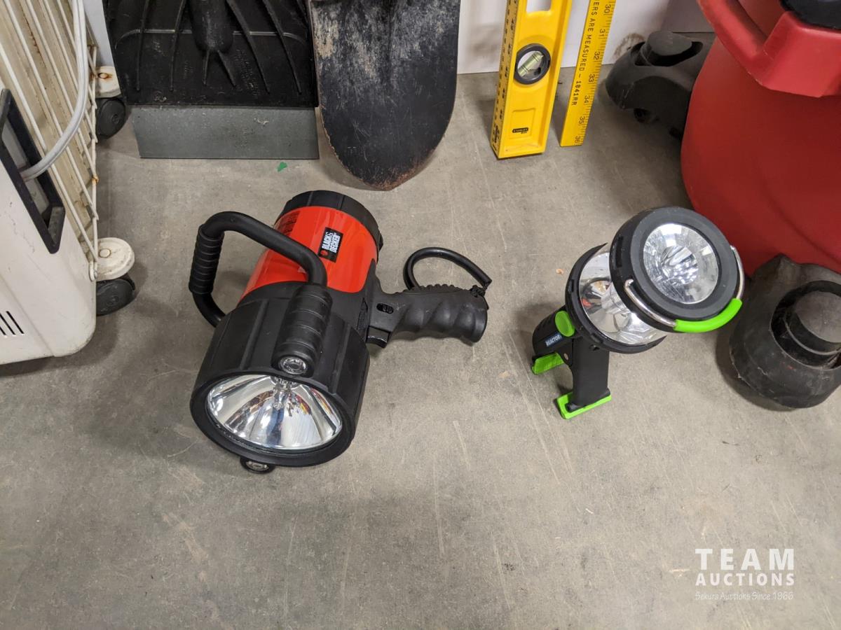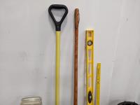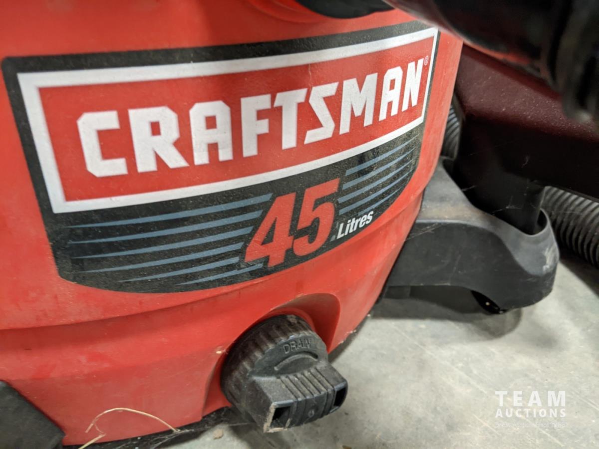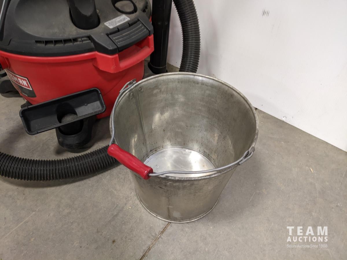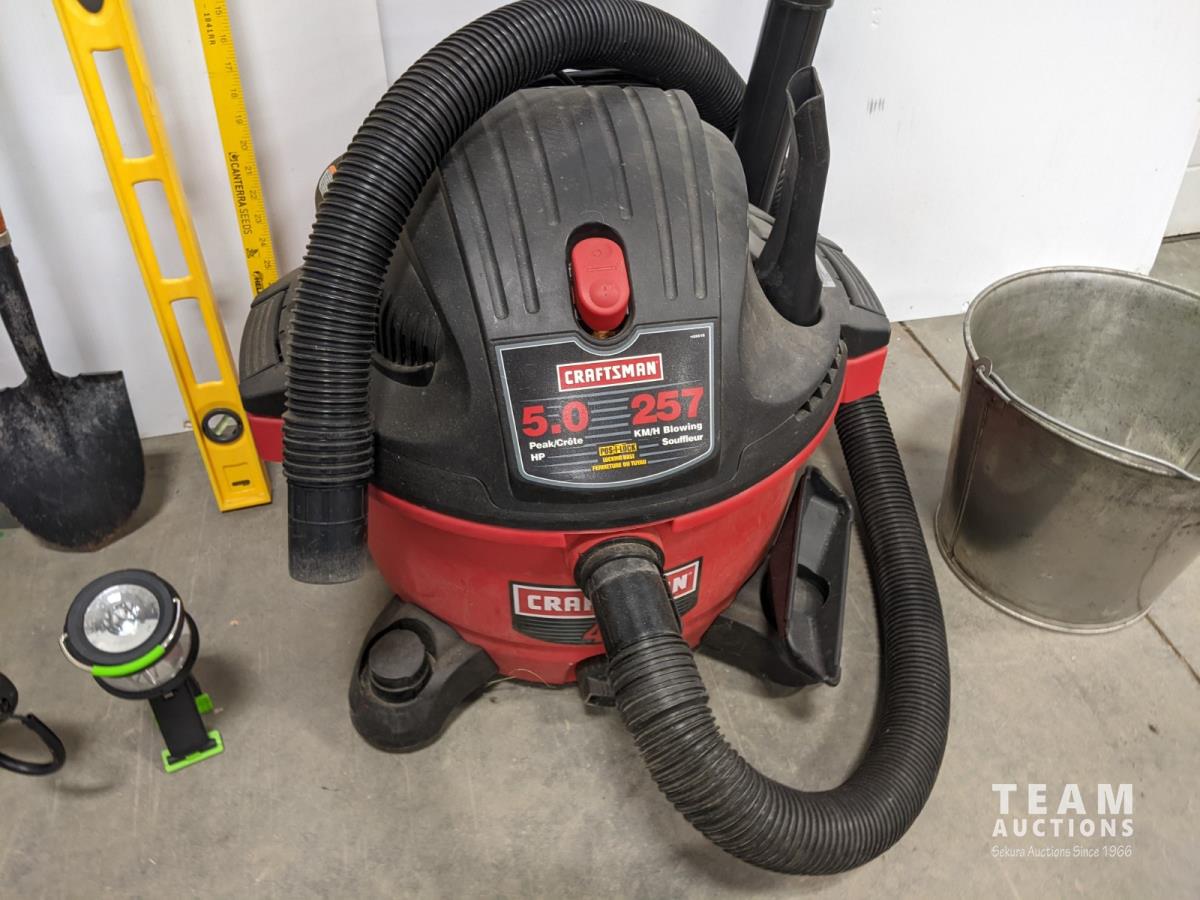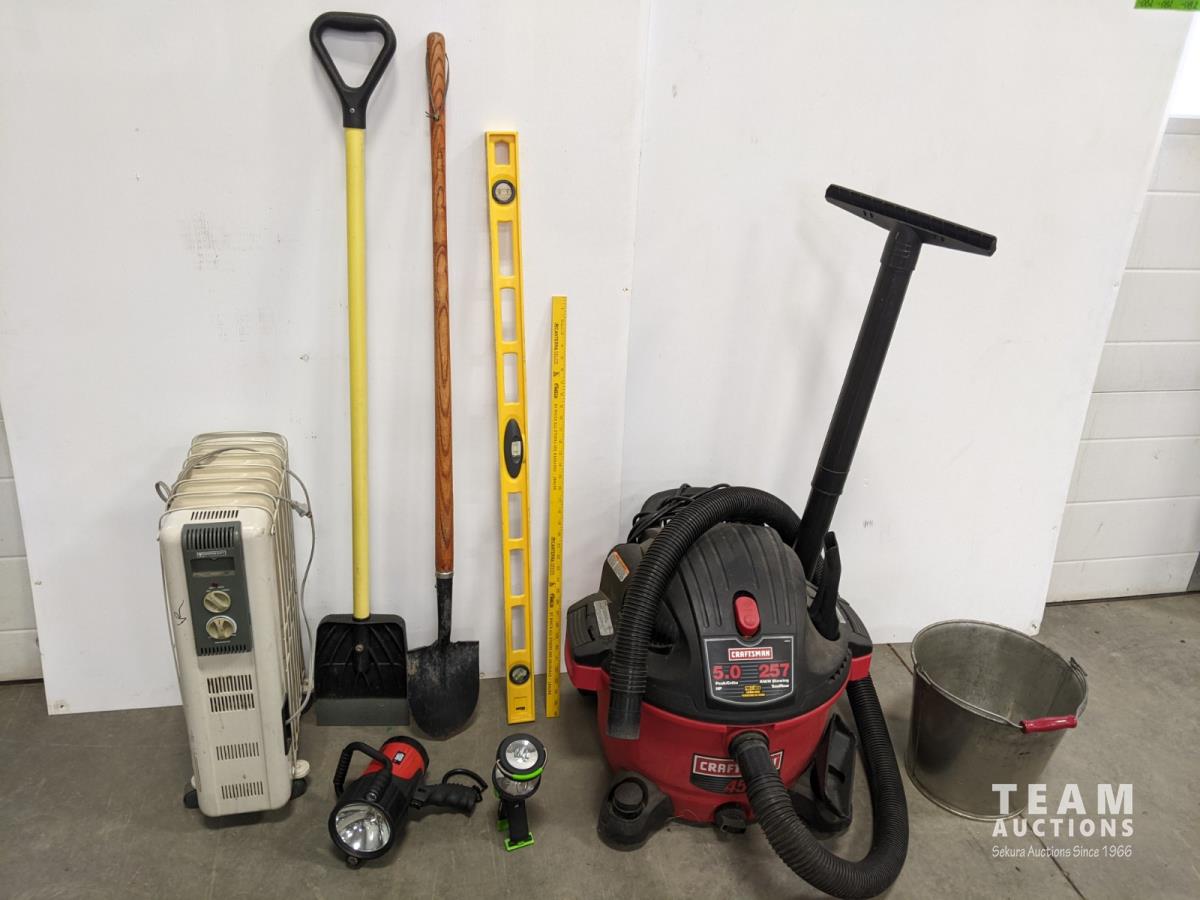Craftsman 45 liter shop vac 5.0 HP, level, meter stick, shovel, ice pick, flashlights, portable heater and pail