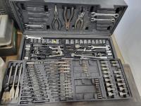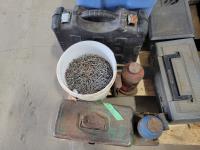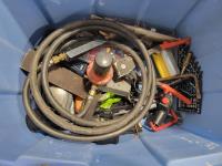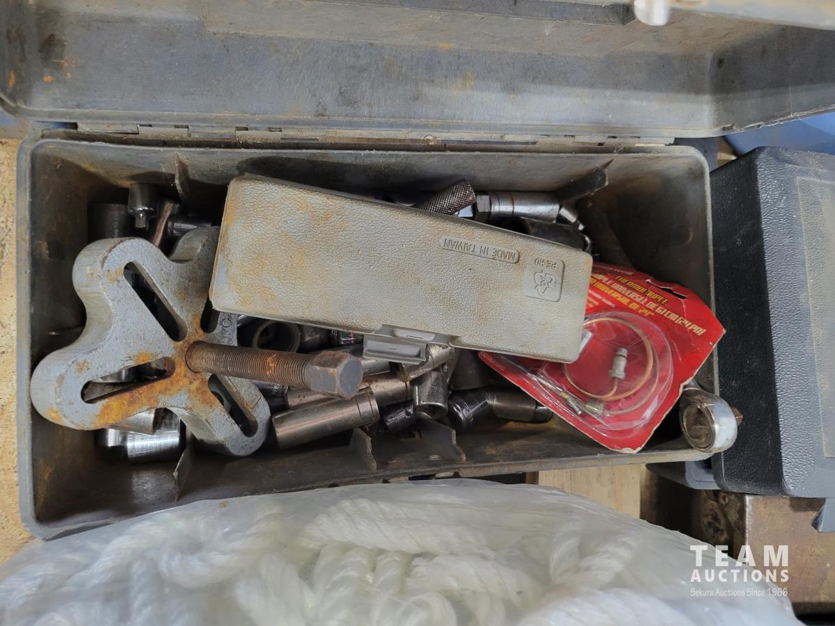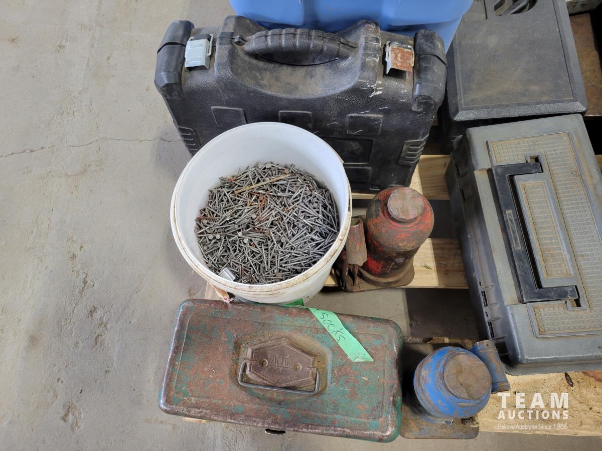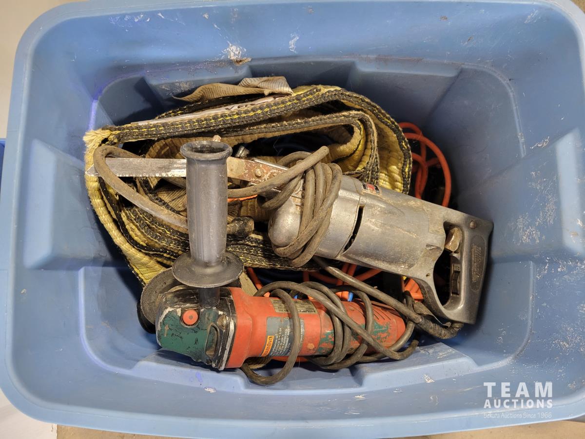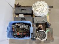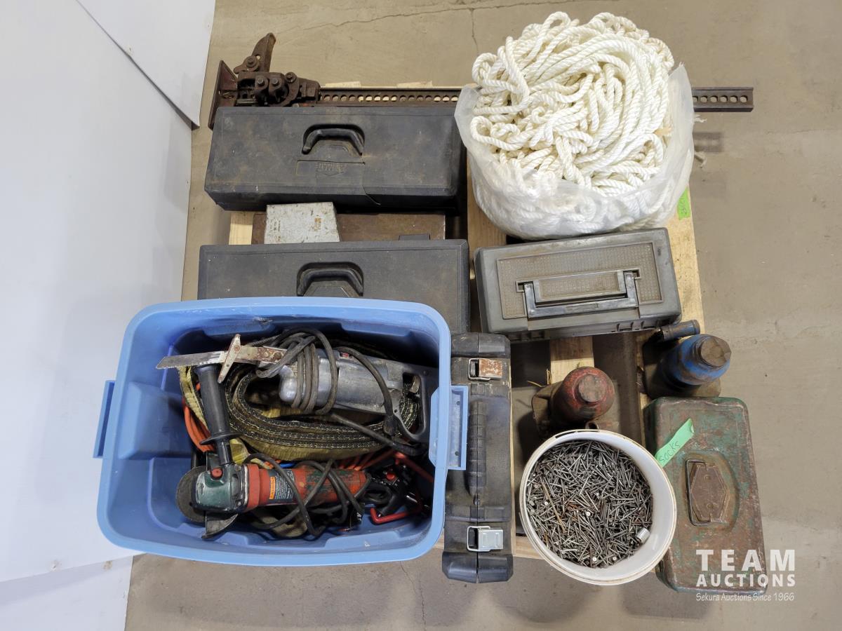Jackall, qty of rope, (2) bottle jacks, Home shop 18v cordless drill, tow rope, Hilti 5 inch angle grinder and socket set