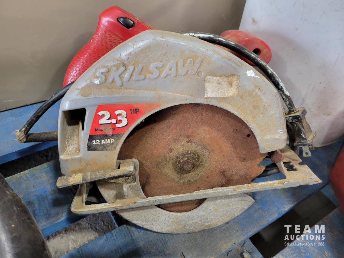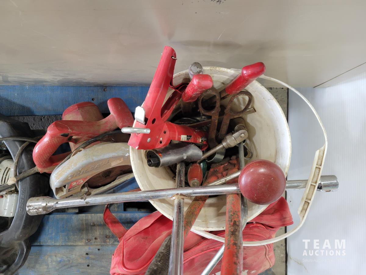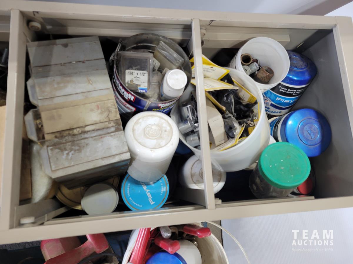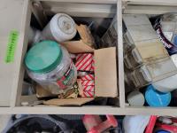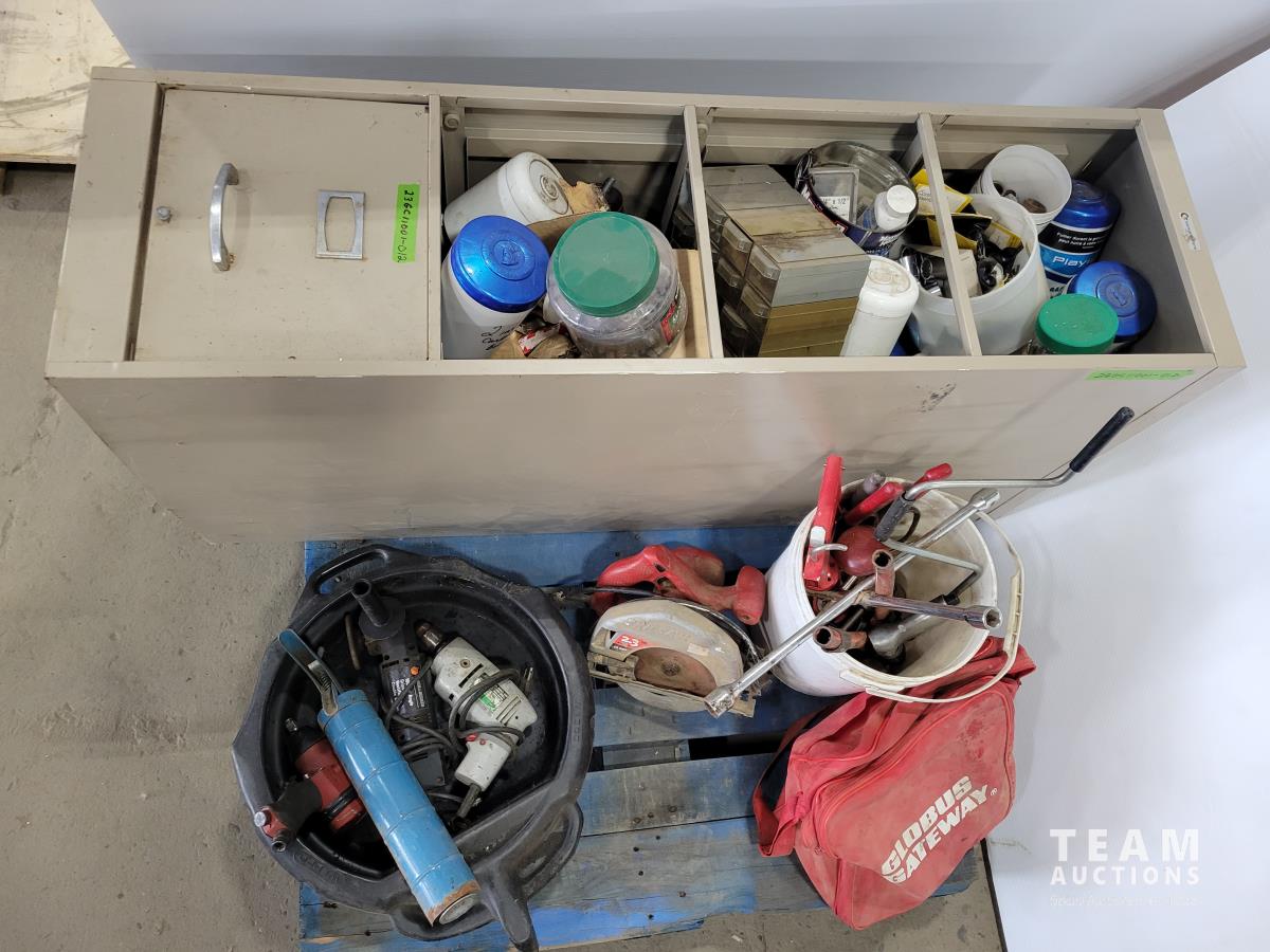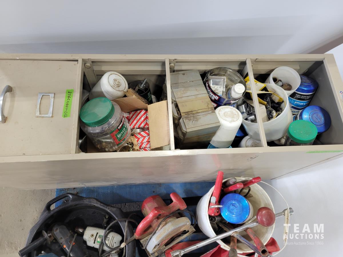 Filing cabinet with contents, various hardware, westward bearings, bolt cutters, grease guns, oil drain pan, Skil saw, samona 1/2" air impact wrench and black & decker 100mm angle grinder