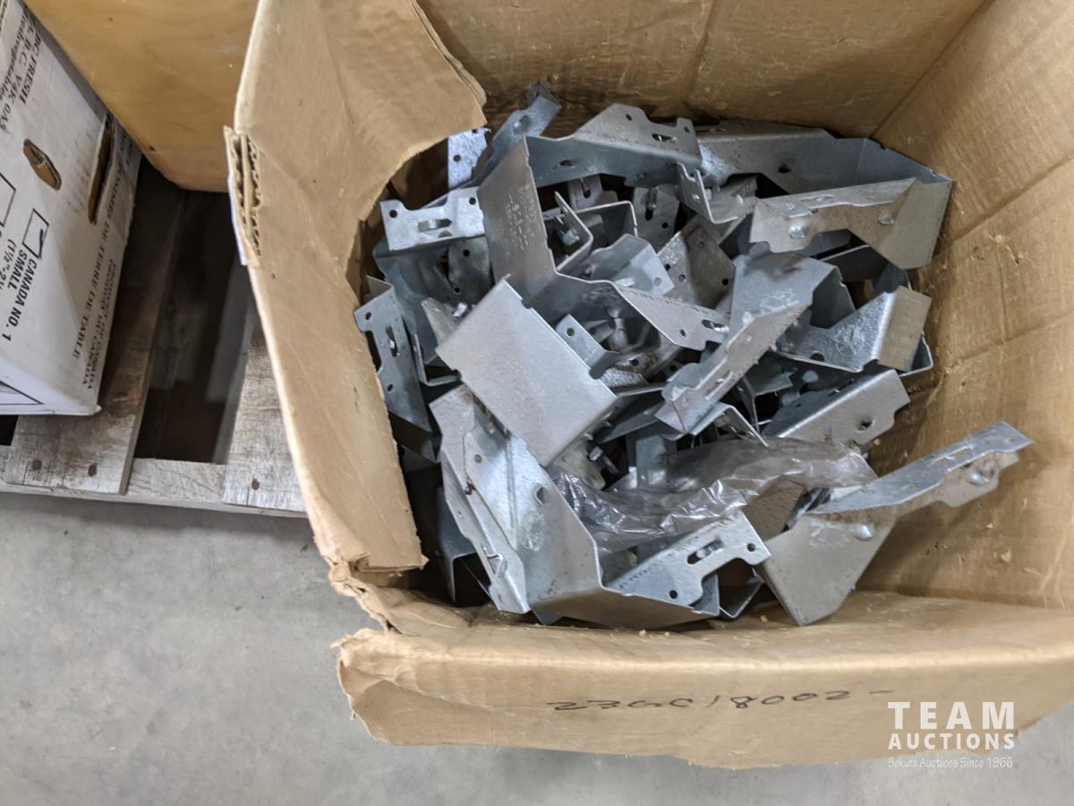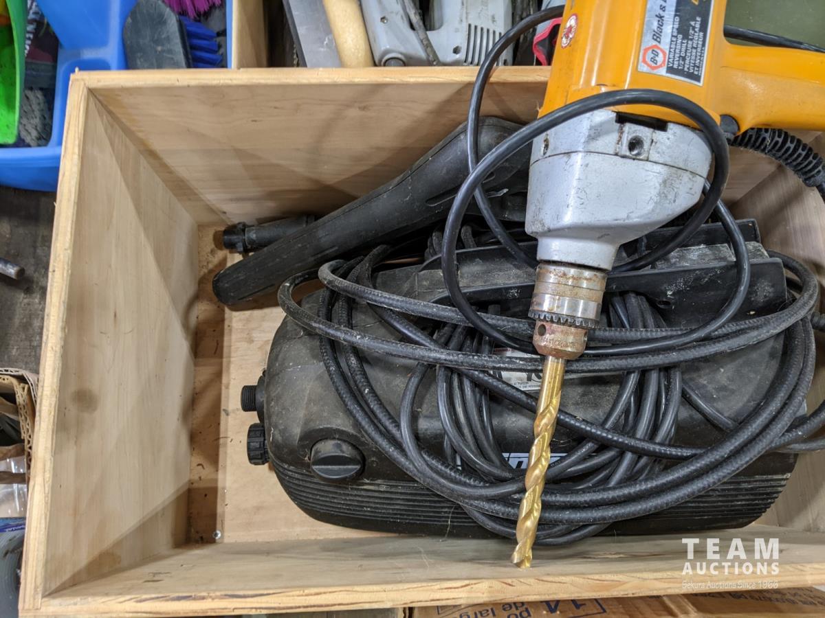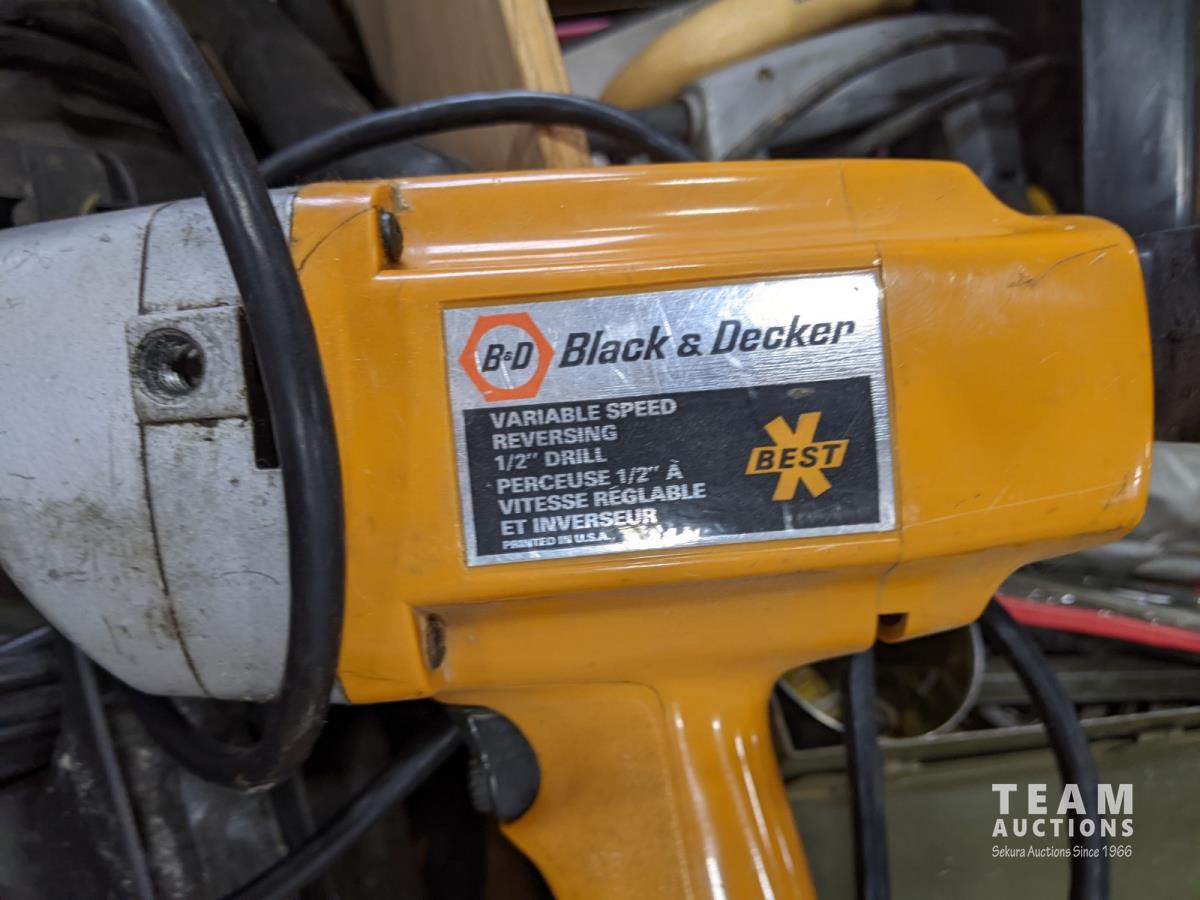 Various tools and hardware, Black & Decker 1/2 inch drill, framing brackets and hand tools