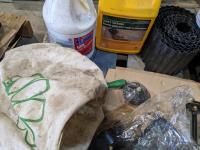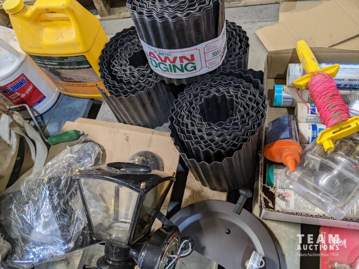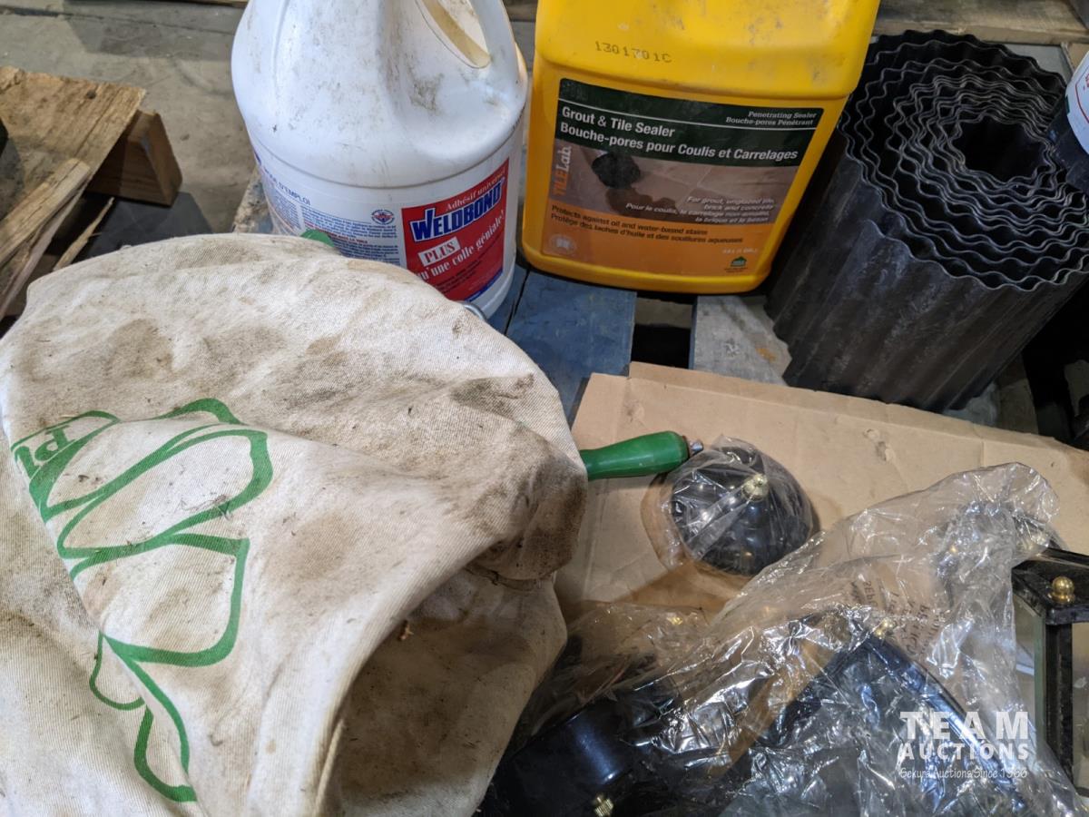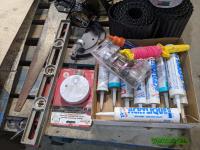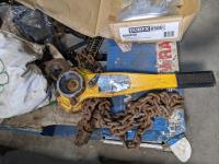 Chain come-a-long, saw, level, (4) rolls plastic lawn edging, grout and tile sealer, etc