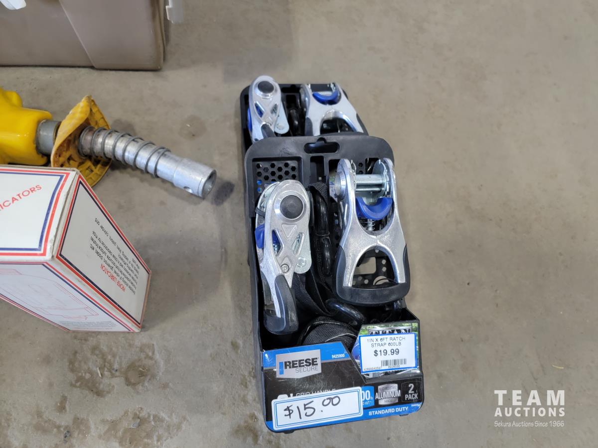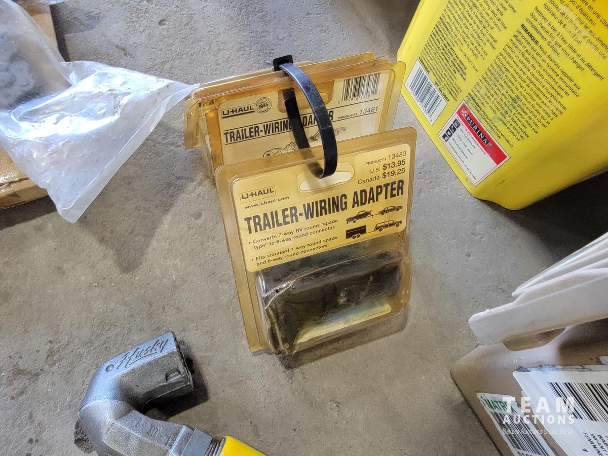 Trailer wiring adaptors, heavy duty battery cables, Quaker State oil, fuel nozzle, ratchet straps