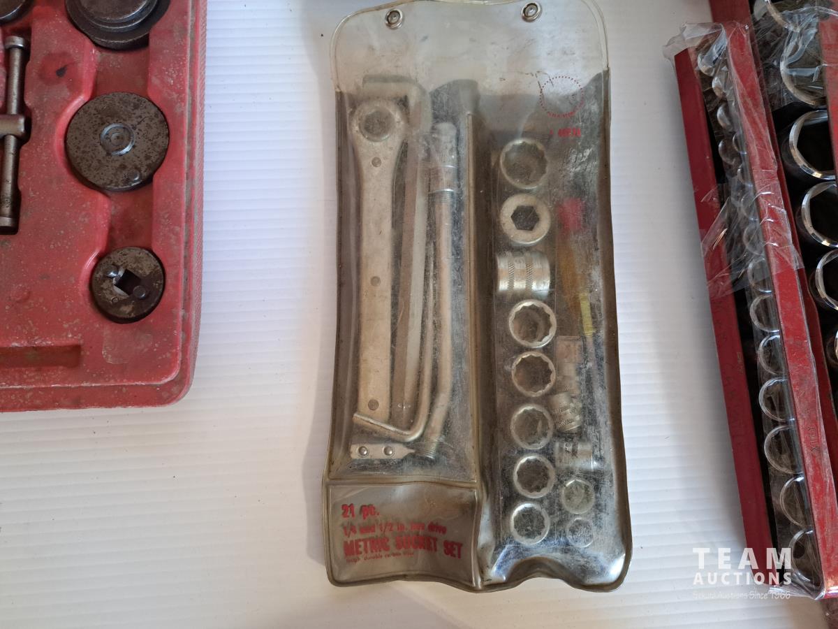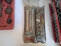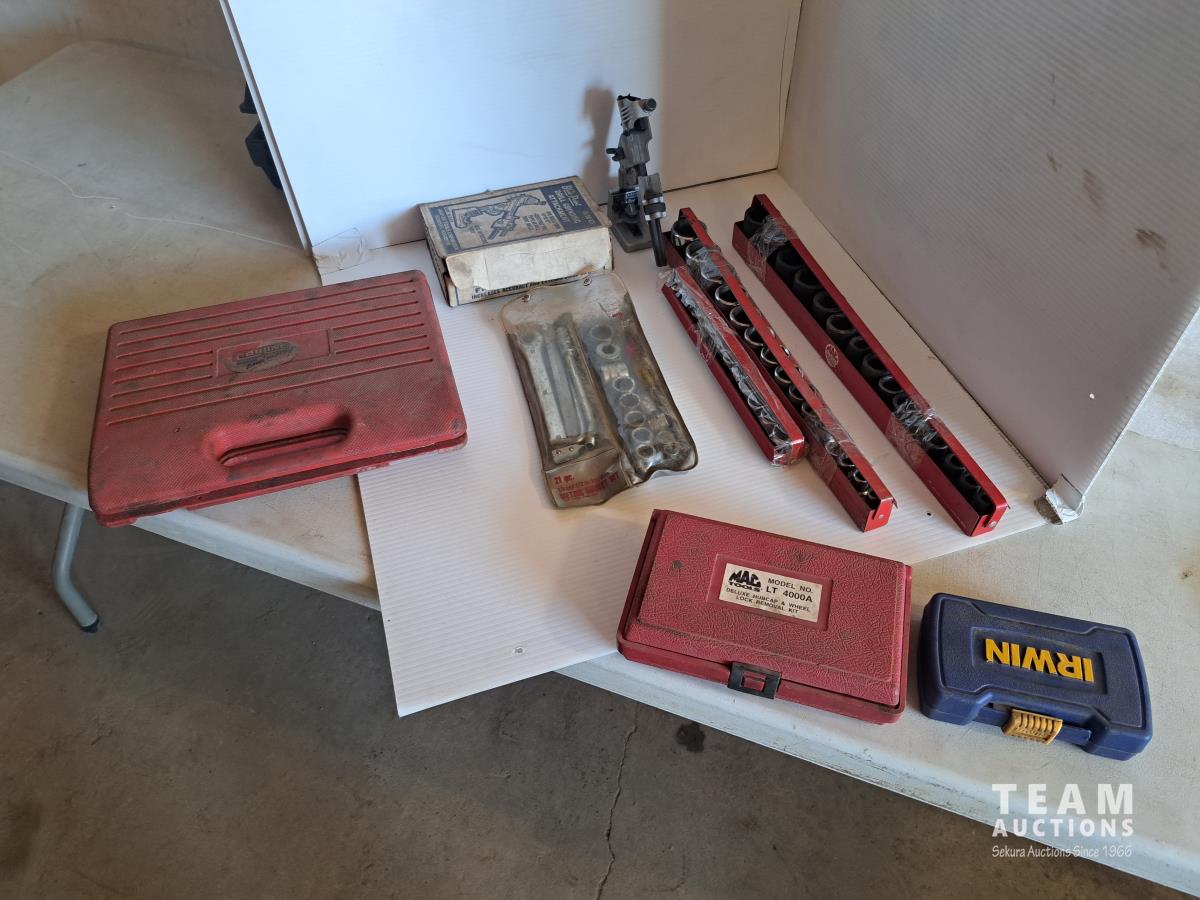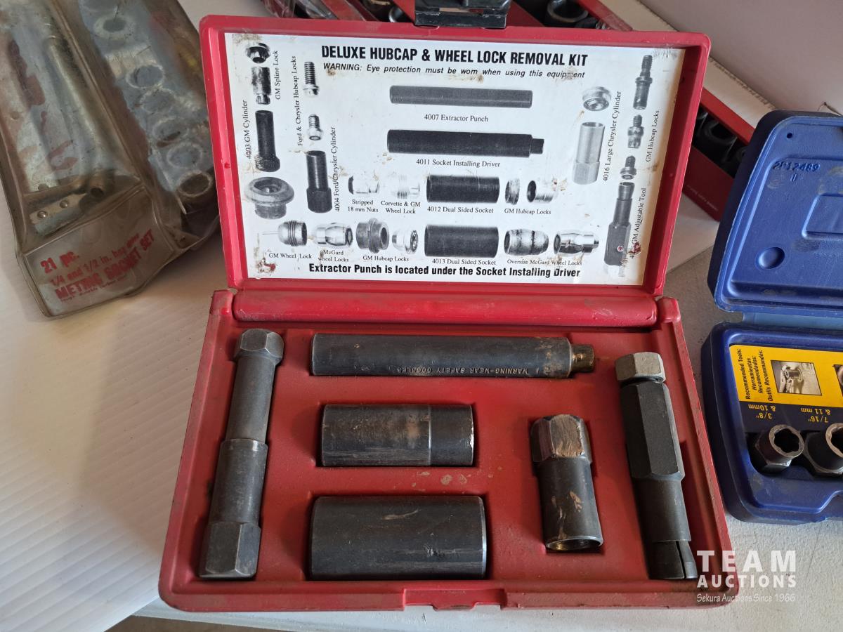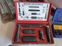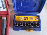 Mastercraft tap and die set, brake pad & caliper wind back kit, assorted sockets, deluxe hubcap and wheel lock removal kit, 21 piece metric socket set, drill grinding attachment and Irwin socket set bolt grip extractor