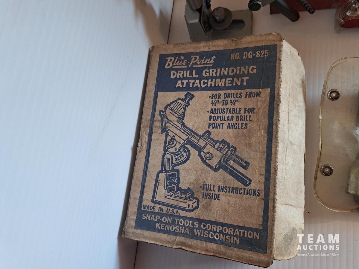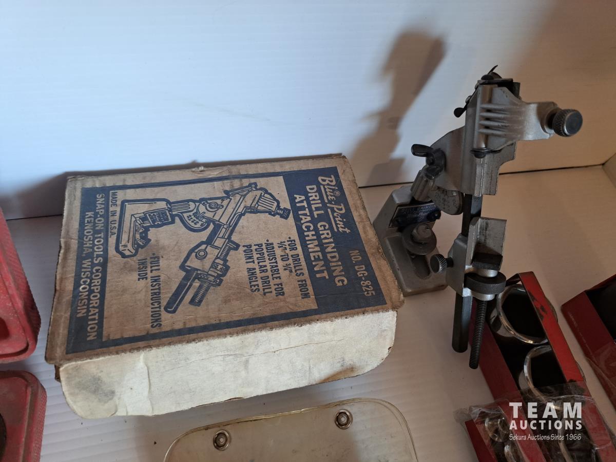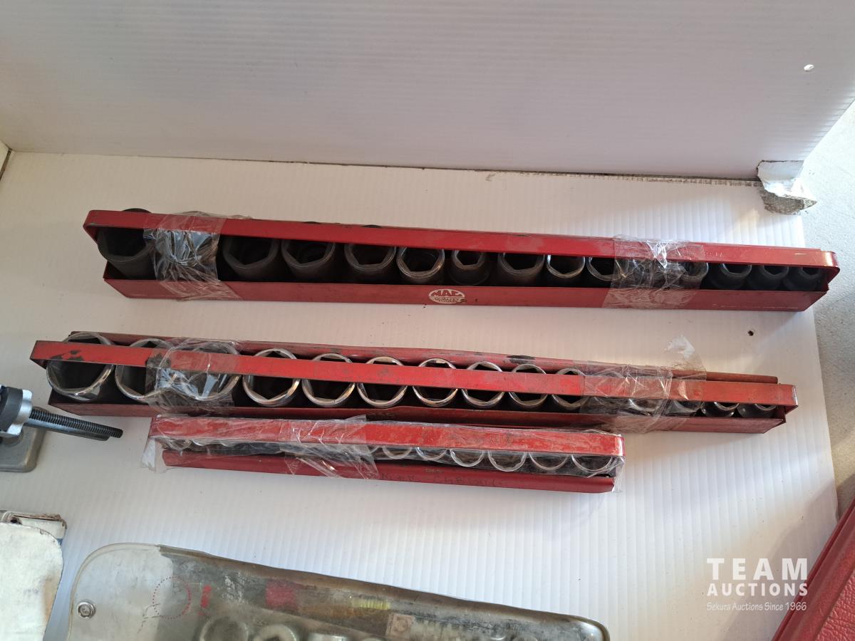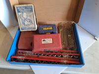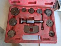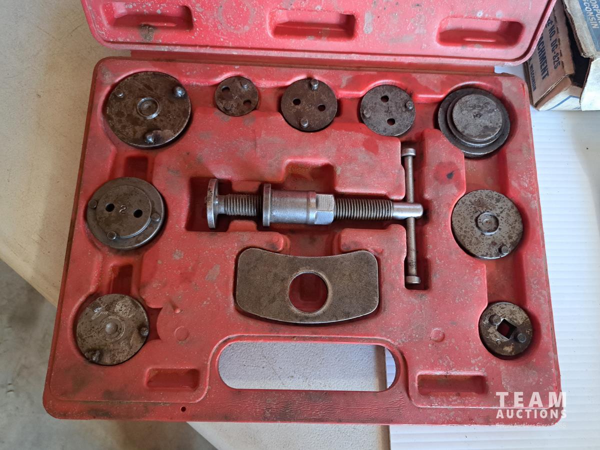 Mastercraft tap and die set, brake pad & caliper wind back kit, assorted sockets, deluxe hubcap and wheel lock removal kit, 21 piece metric socket set, drill grinding attachment and Irwin socket set bolt grip extractor