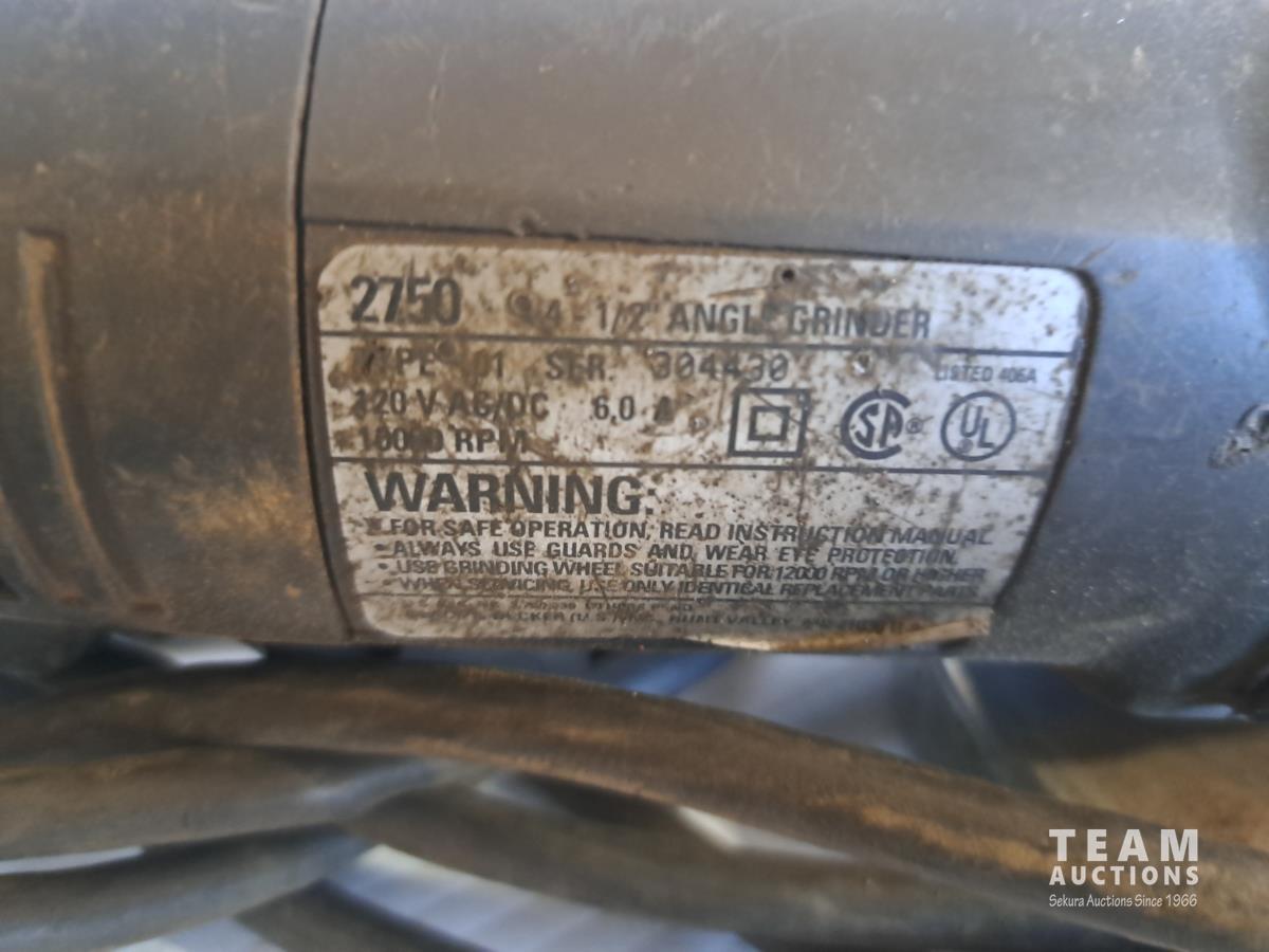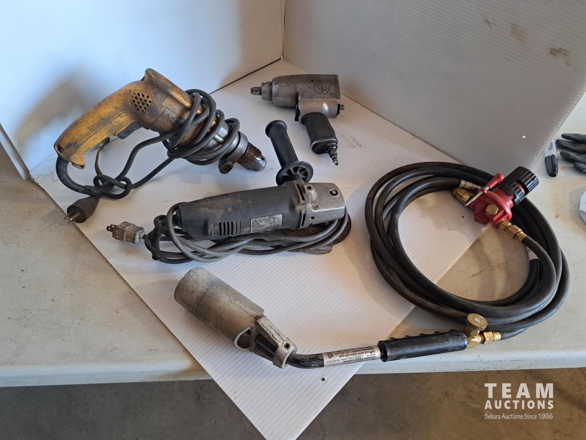 Tiger torch and (2) hose assembly, 4-1/8 inch angle grinder, Dewalt drill and 1/2 inch drive air impact wrench