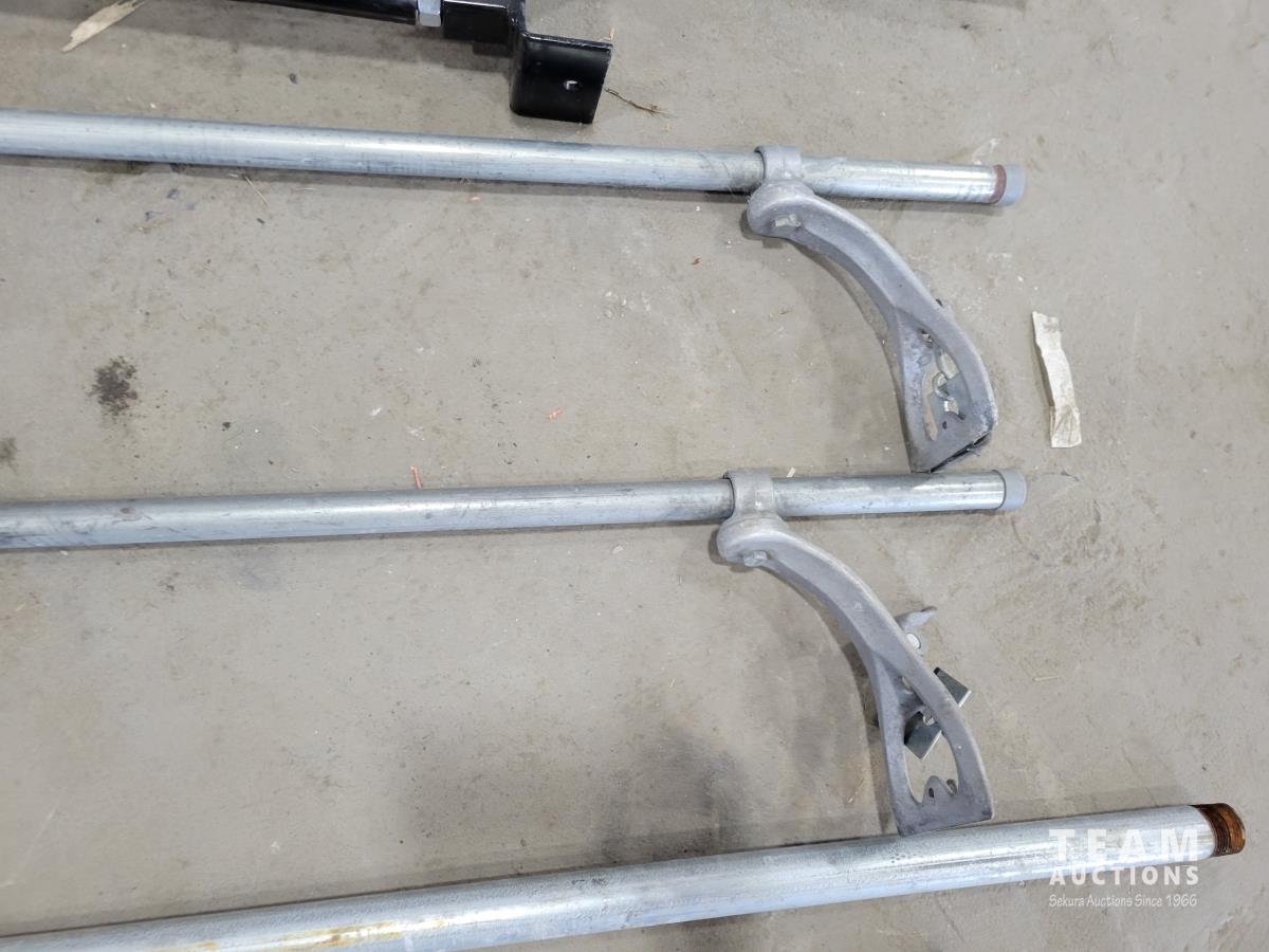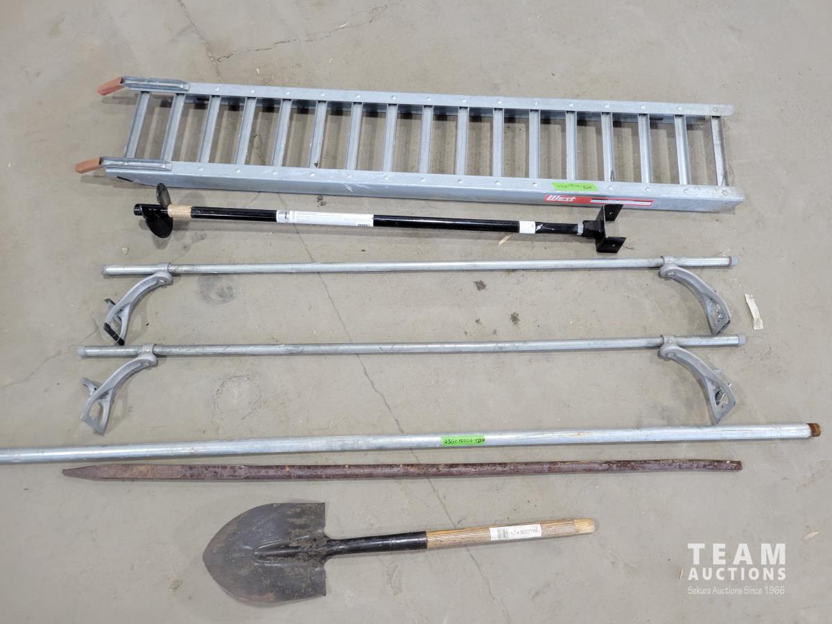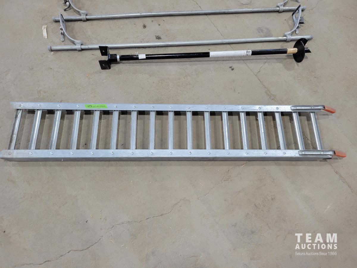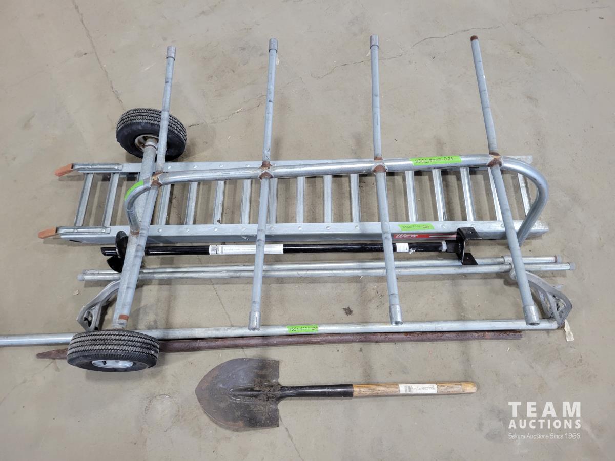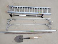 Pylex 50 inch deck post holder, shovel (missing handle), car roof racks, ramp, 64 inch pry bar, 7 ft pipe, pull cart