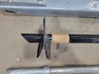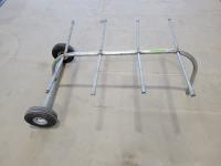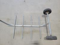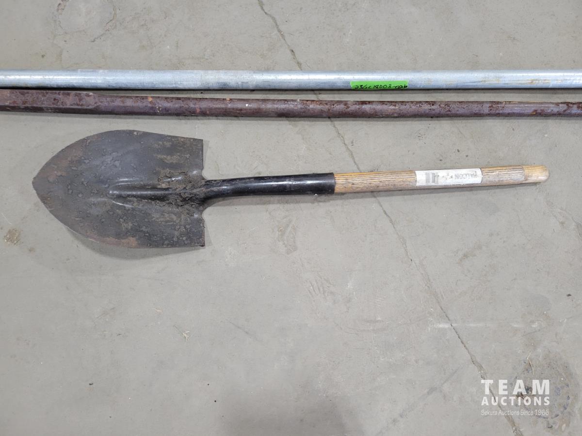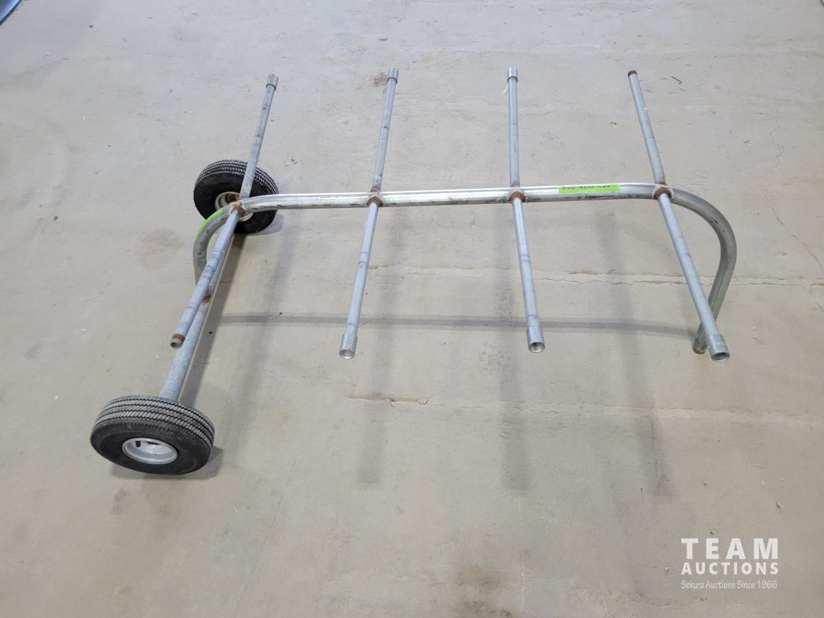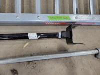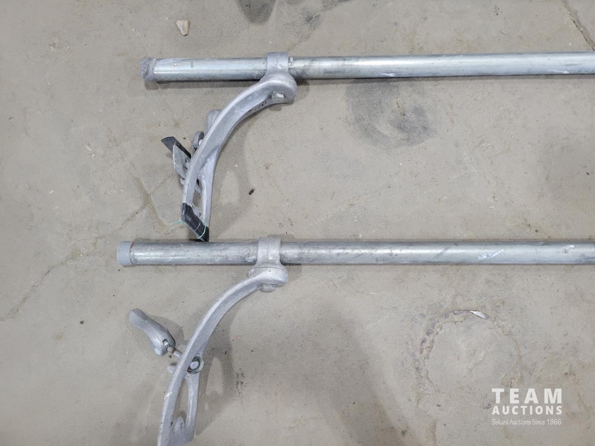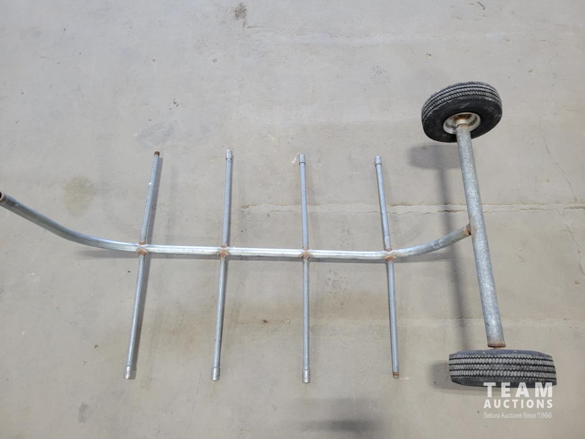 Pylex 50 inch deck post holder, shovel (missing handle), car roof racks, ramp, 64 inch pry bar, 7 ft pipe, pull cart