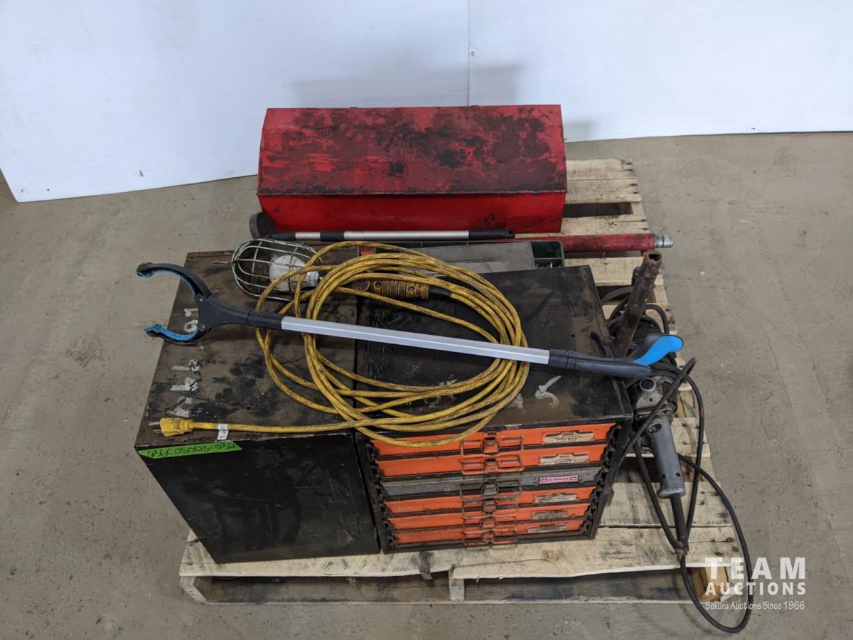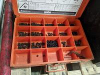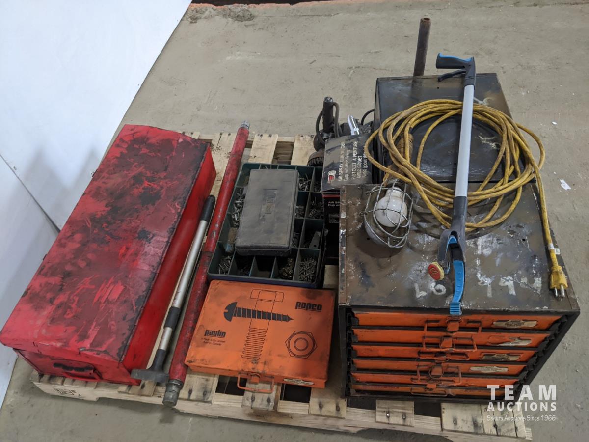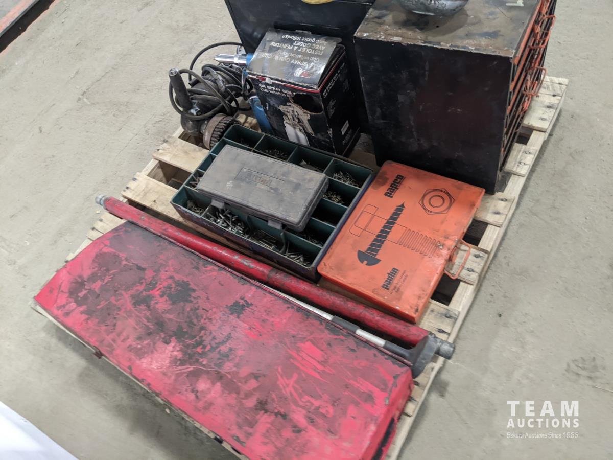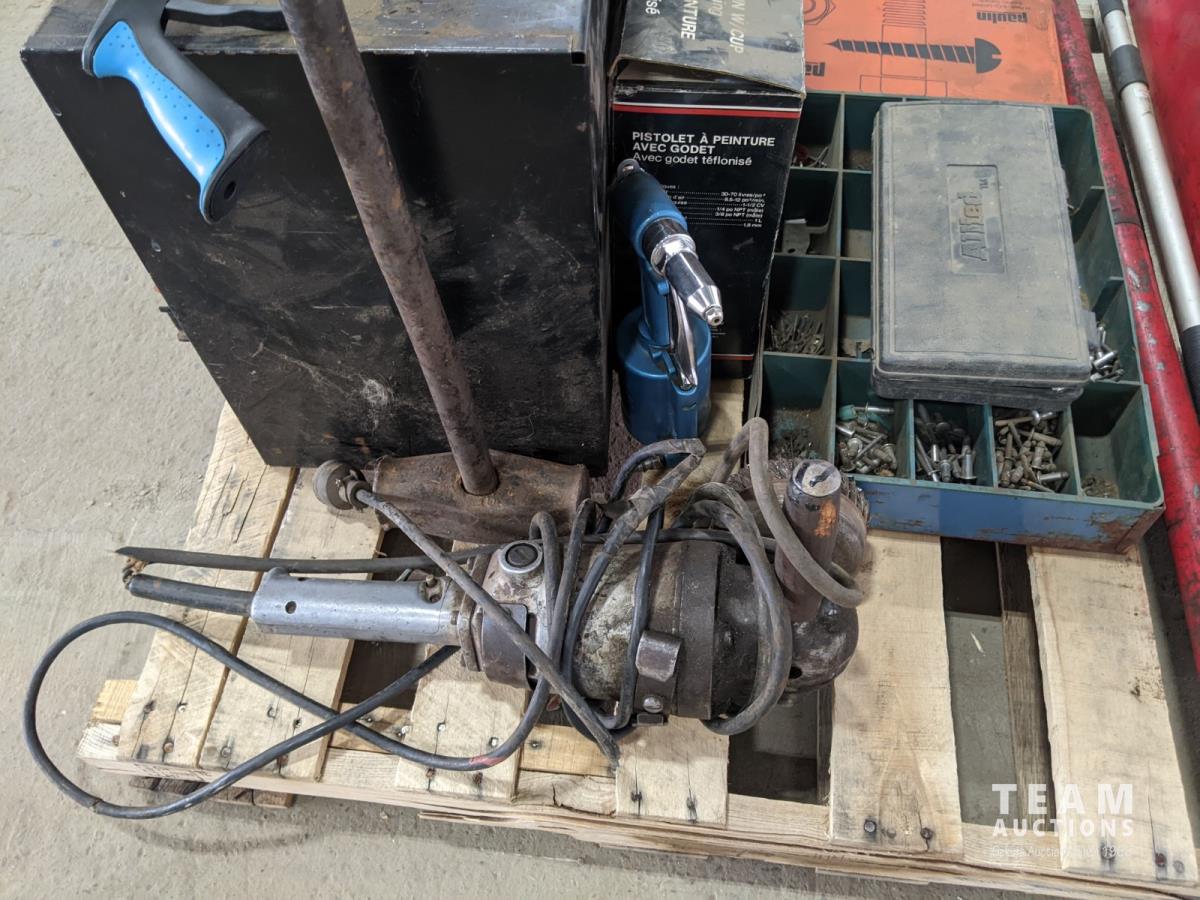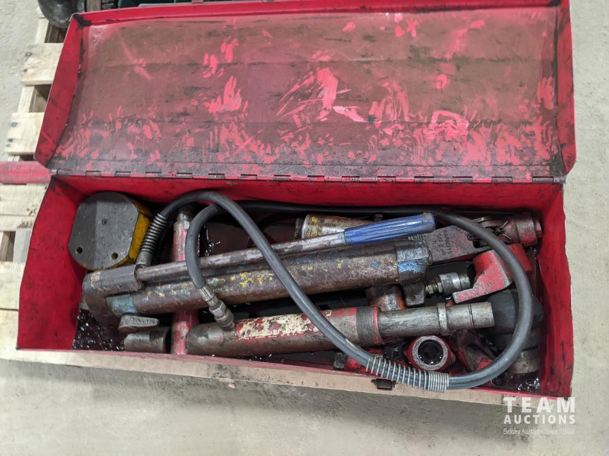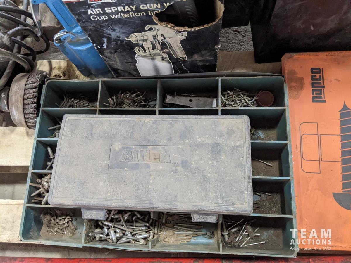 Hydraulic Porta Power, bolt bin with contents, paint sprayer and rivets
