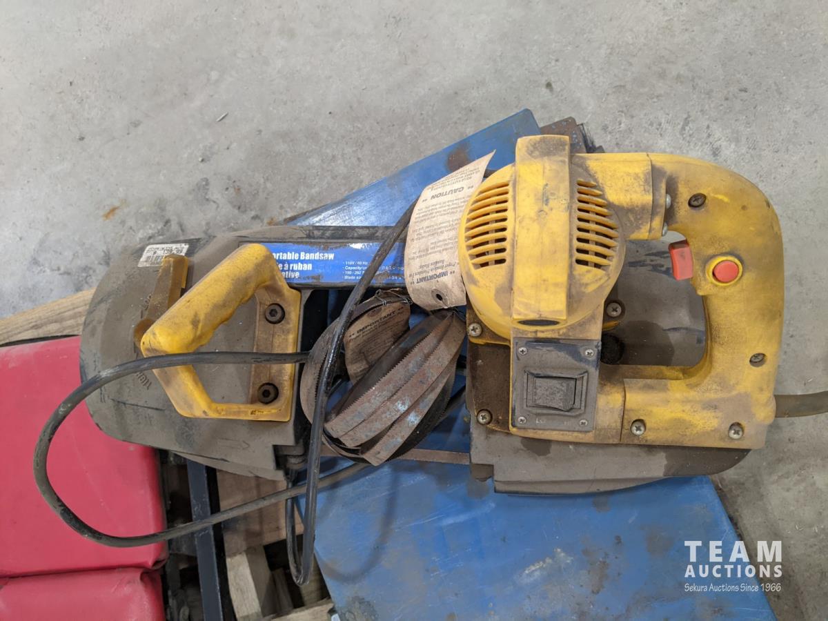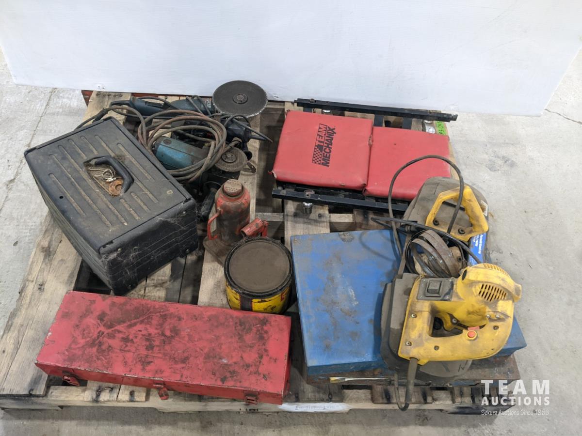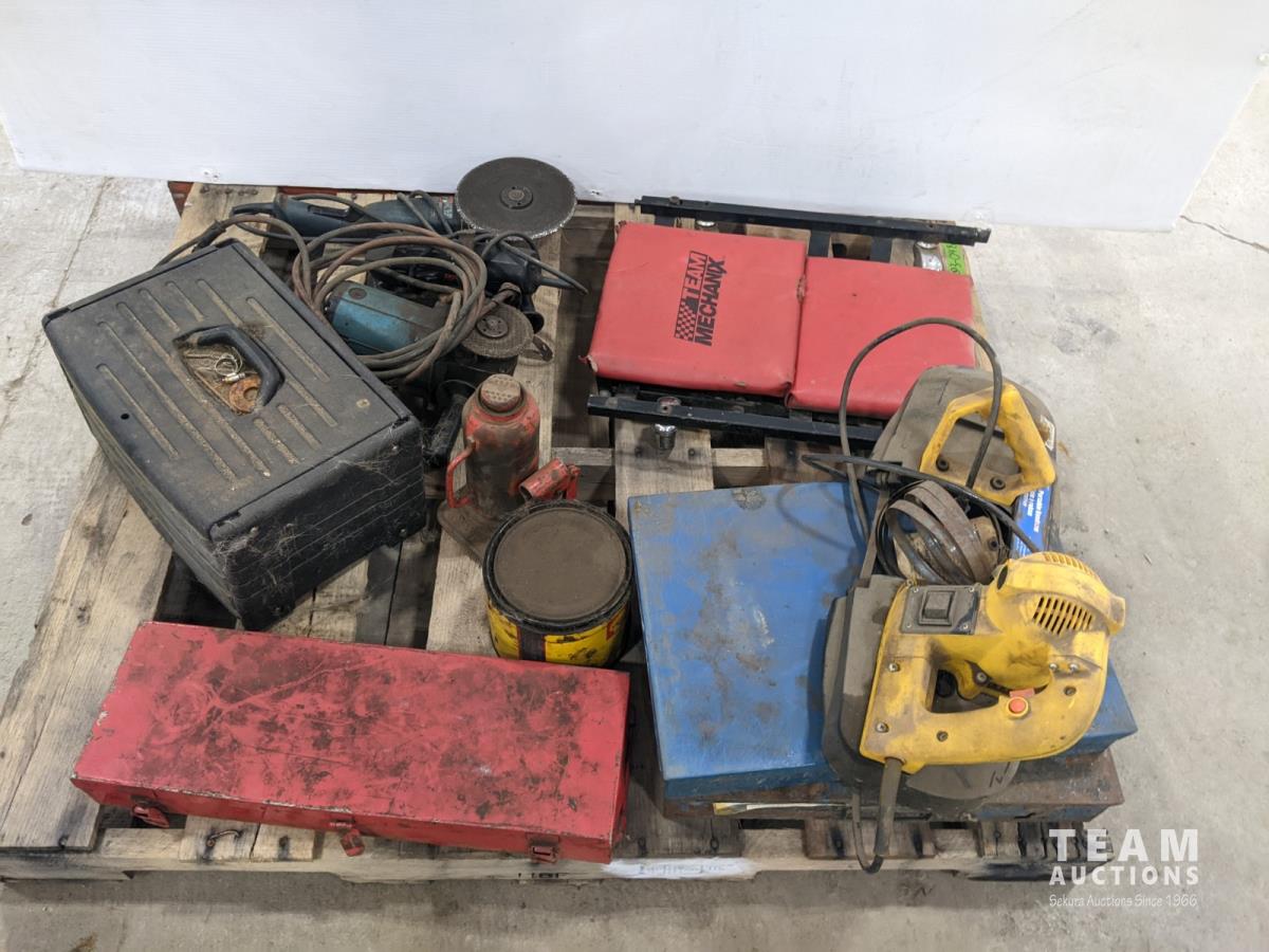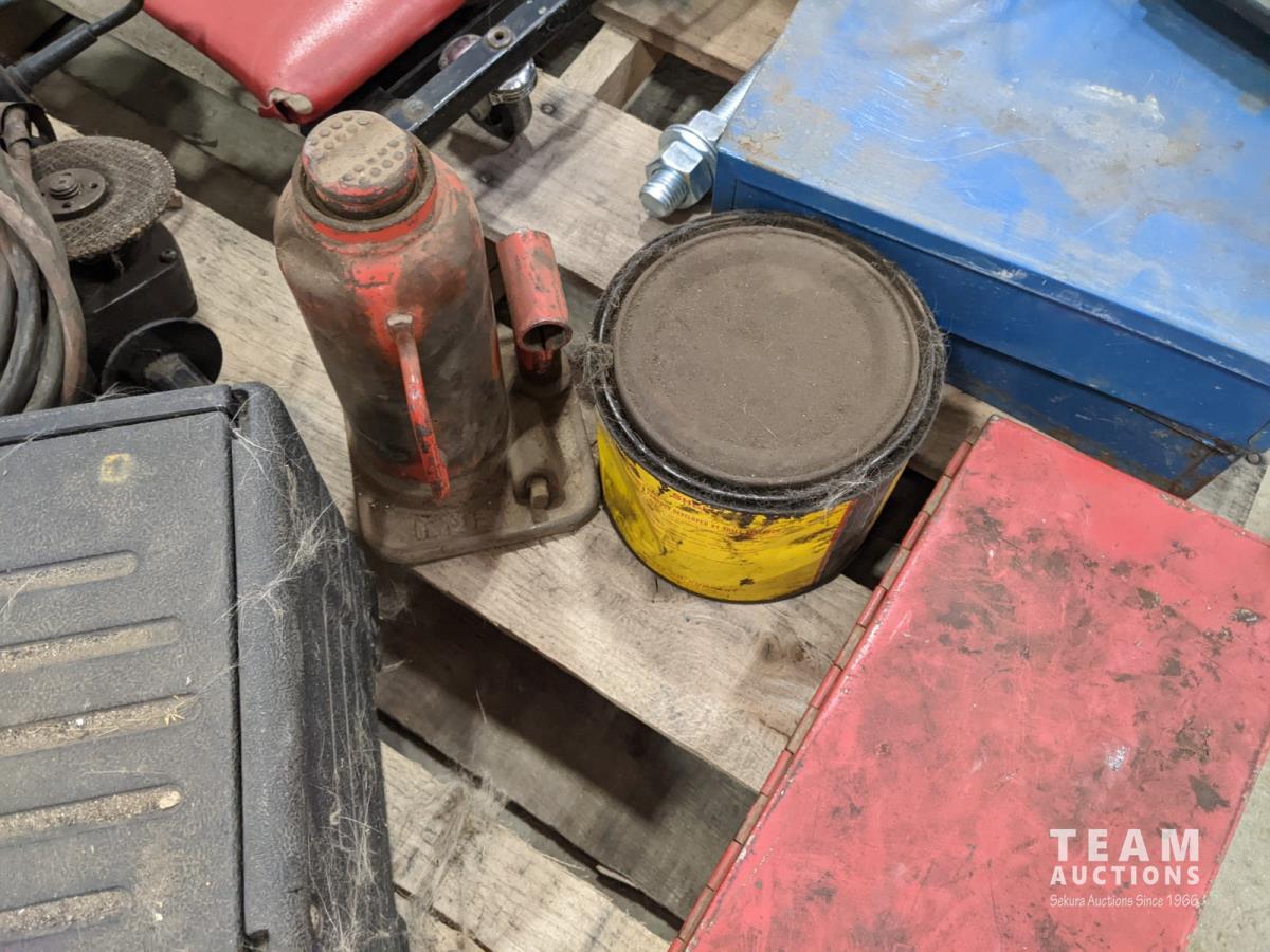 Storage bins, socket set, bottle jack, angle grinder and Powerfist bandsaw