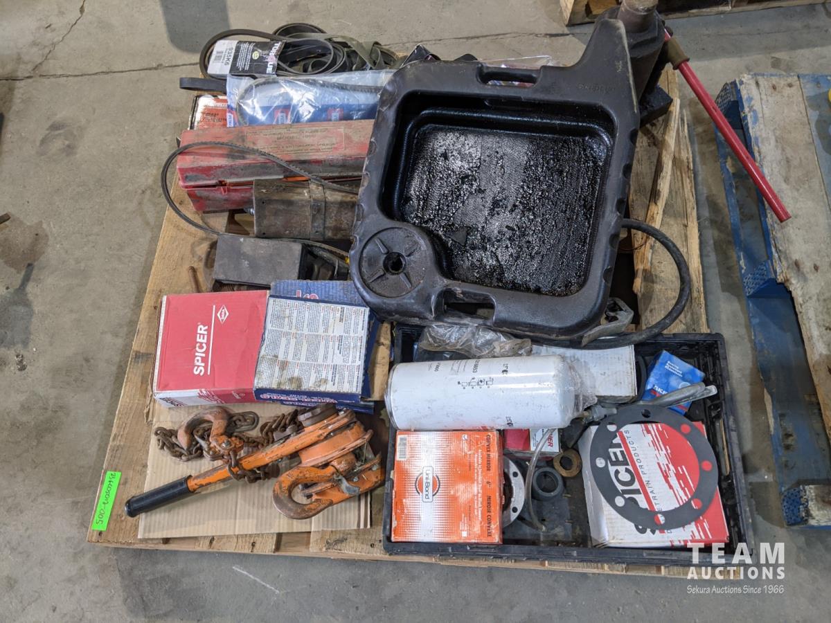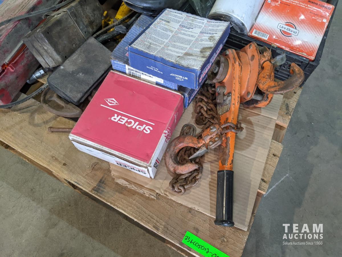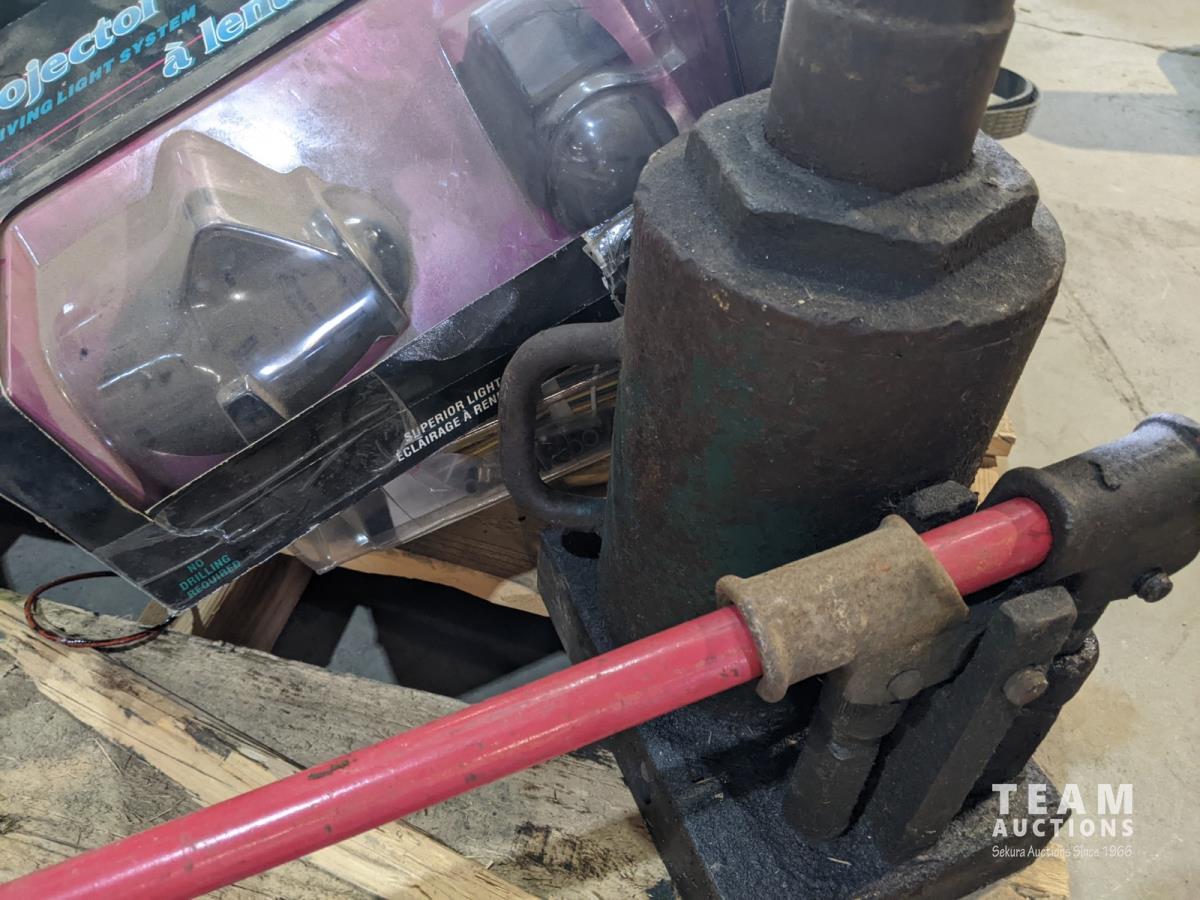 Chain hoist, bottle jack, grease gun, porta power, belts, oil pan, etc