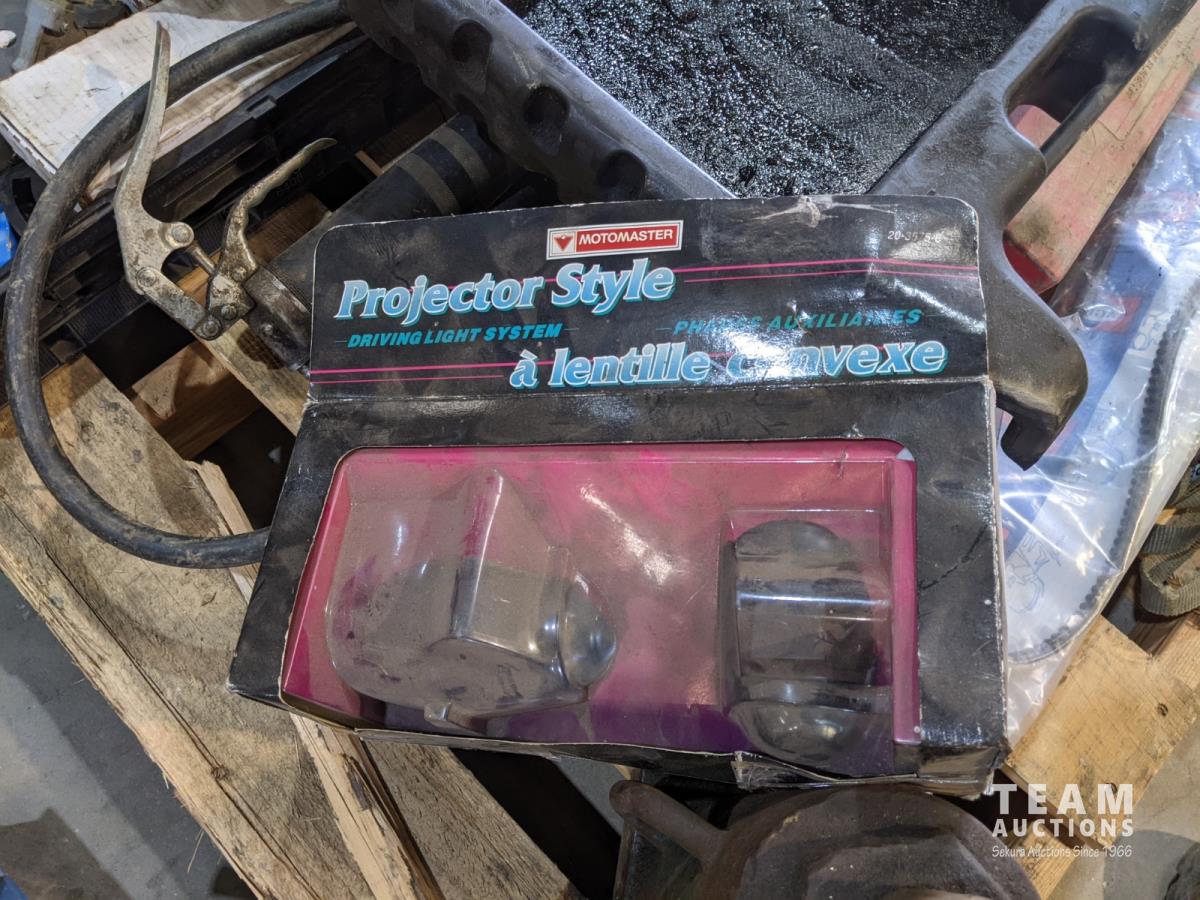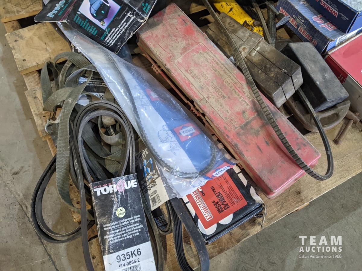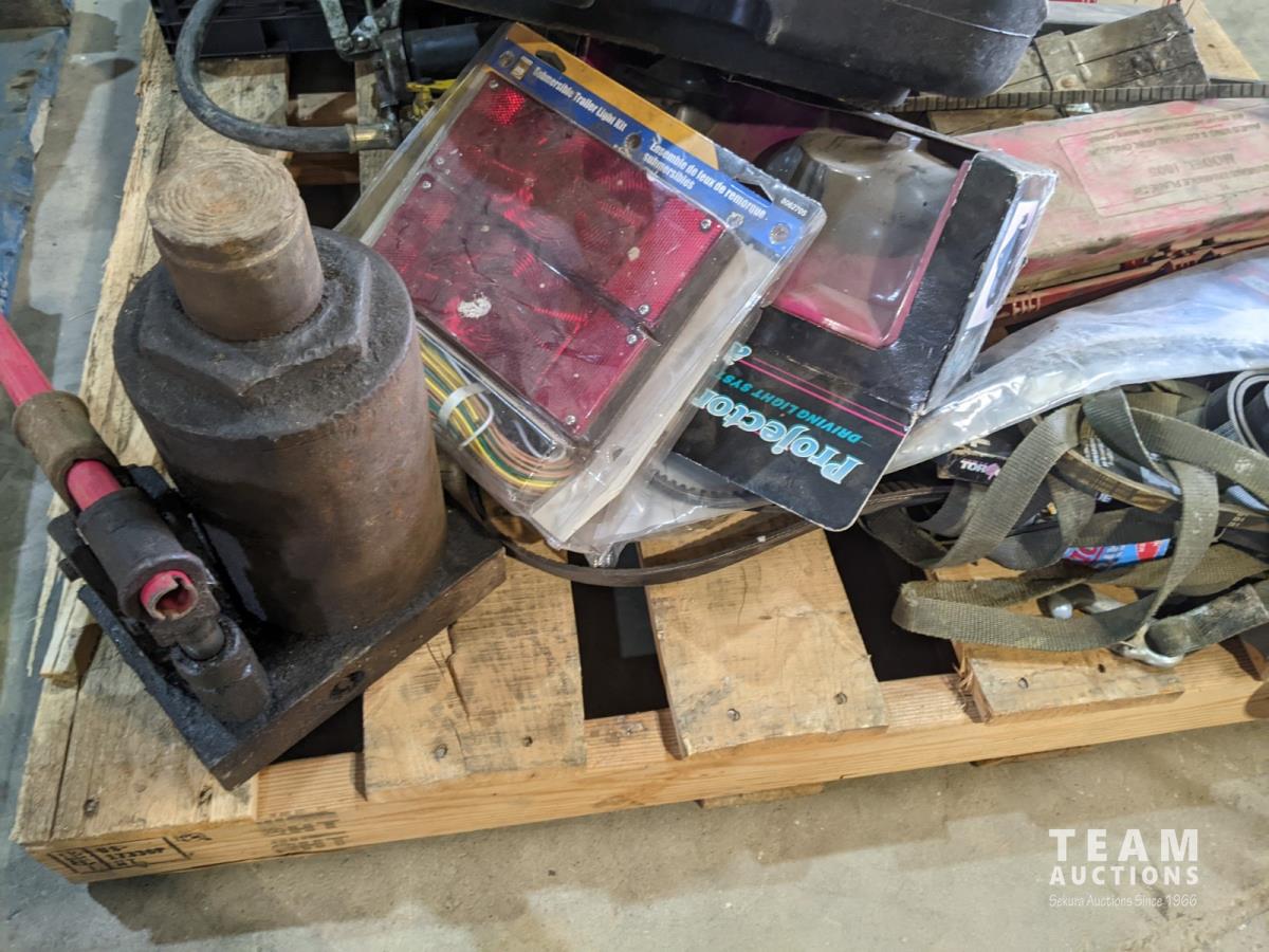 Chain hoist, bottle jack, grease gun, porta power, belts, oil pan, etc