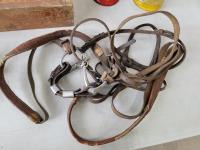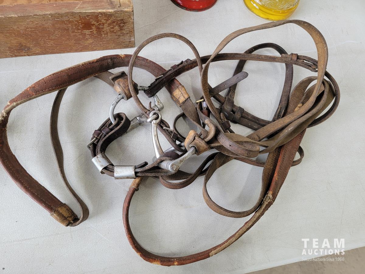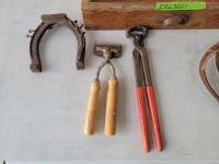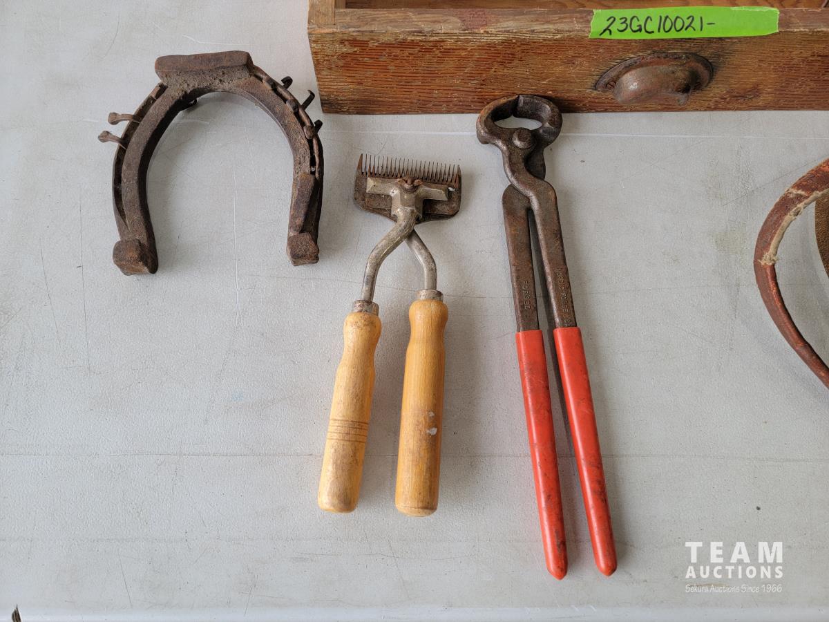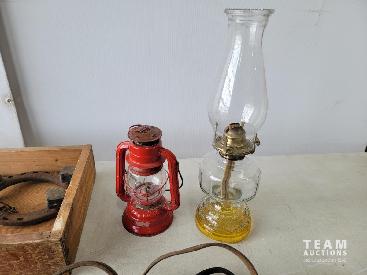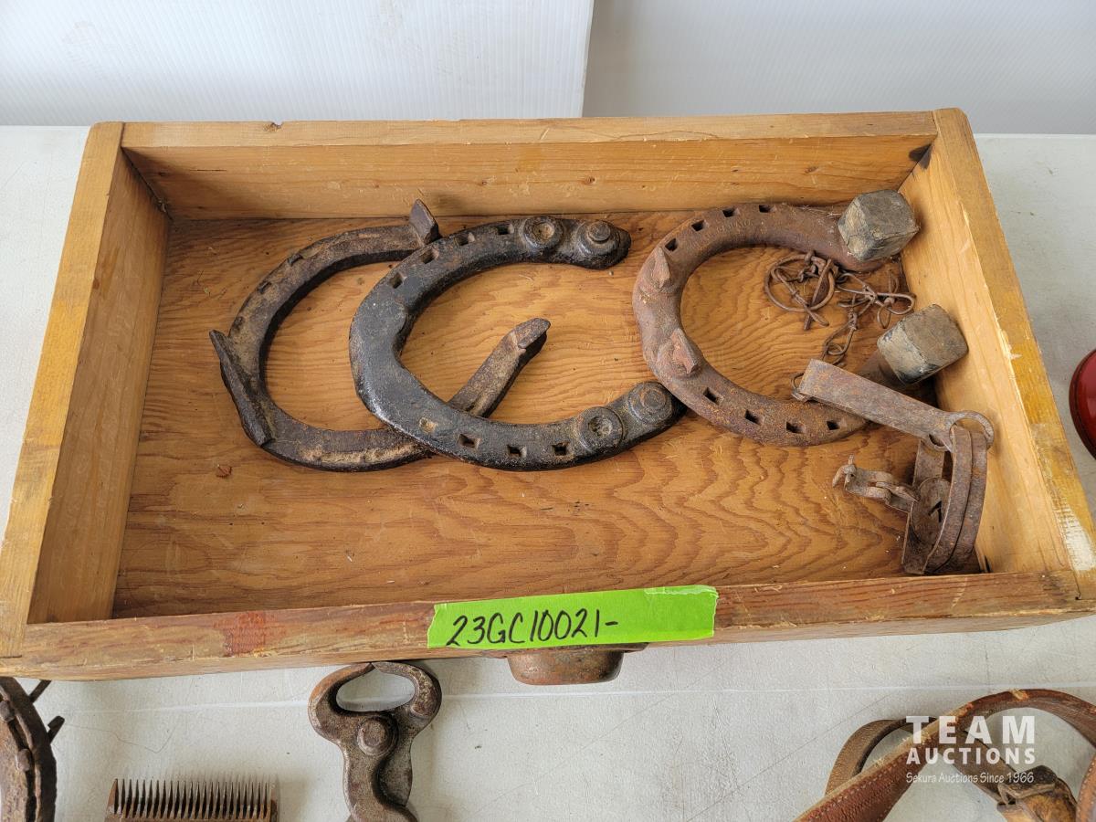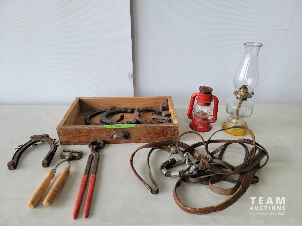 Wood box with horse bridle, horse shoes, horse brush, horse clipper, critter trap, red lantern and kerosene lamp