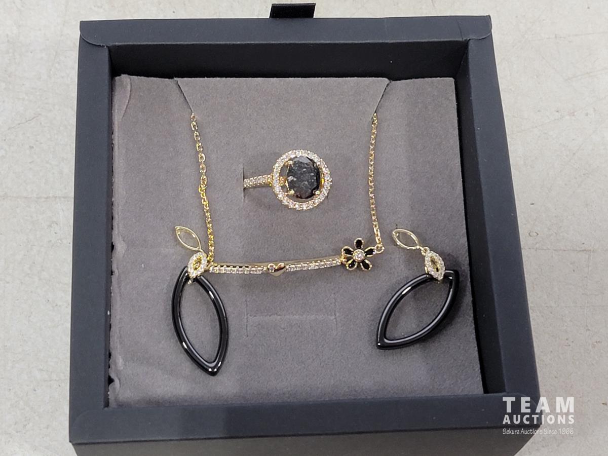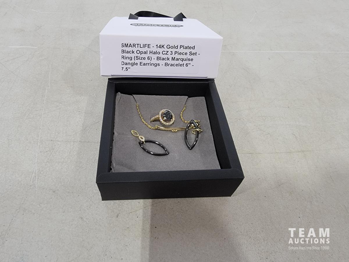 2188 Smartlife 14K Gold Plated Black Opal/ CZ Halo 3 Piece Set (Unused)