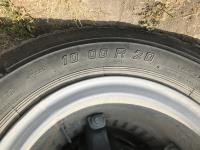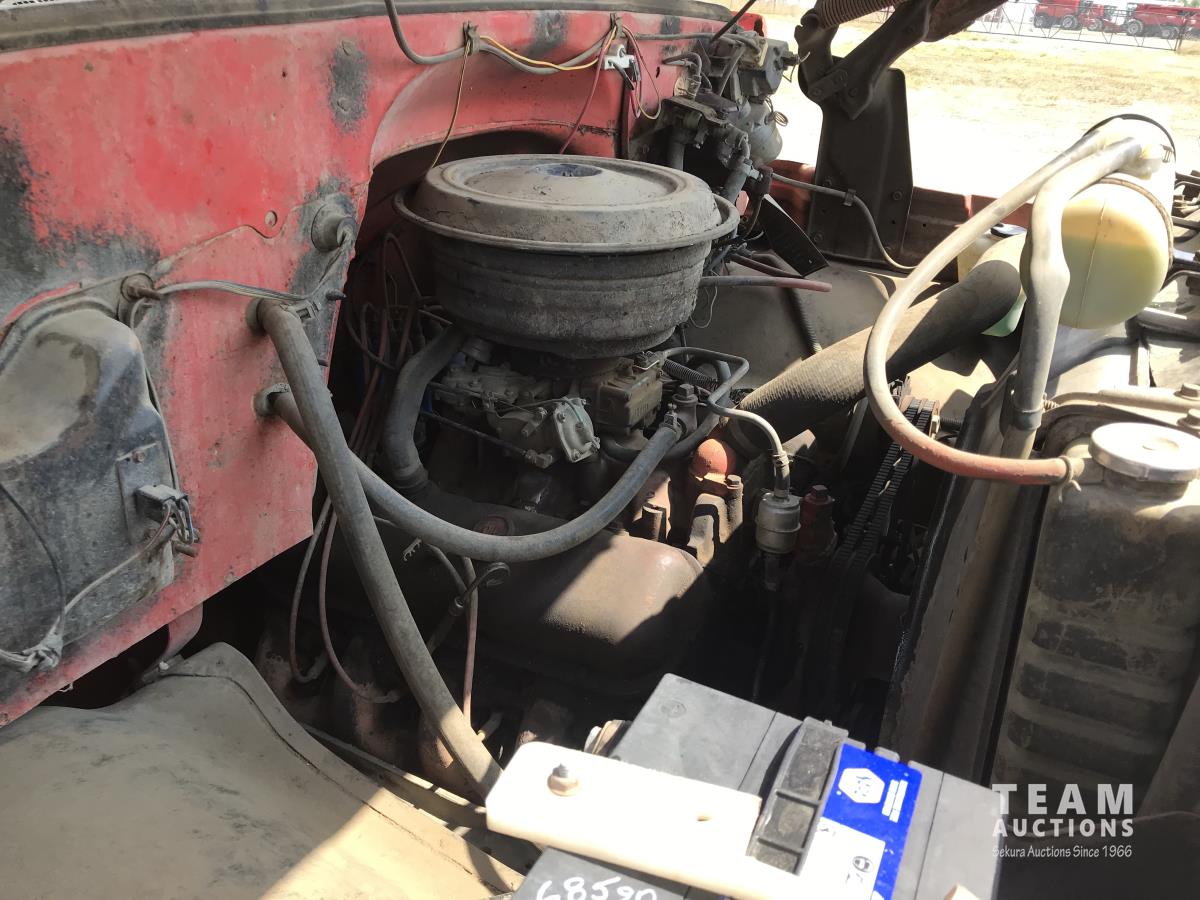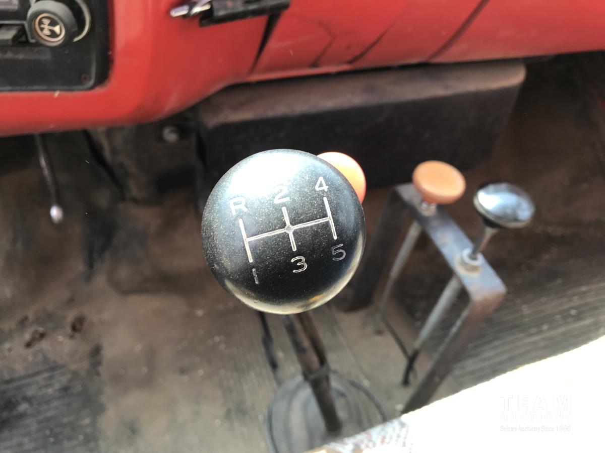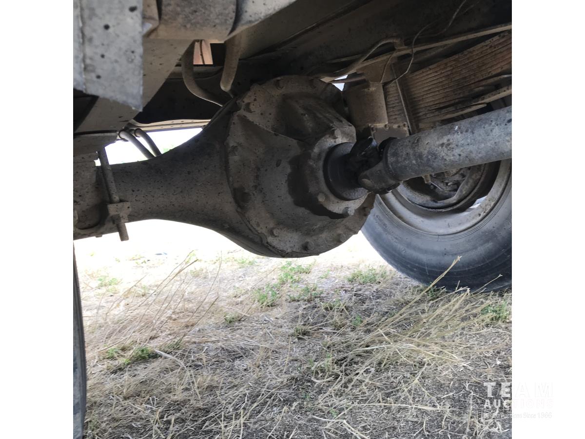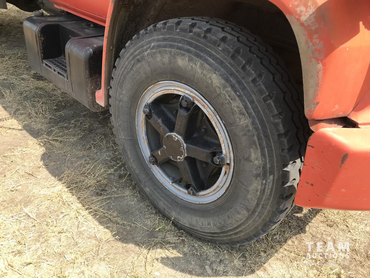 V8 gas engine, 5 speed manual transmission, 2 speed axle, 14 ft box, hoist, roll tarp, spring suspension, 10.00R20 tires
