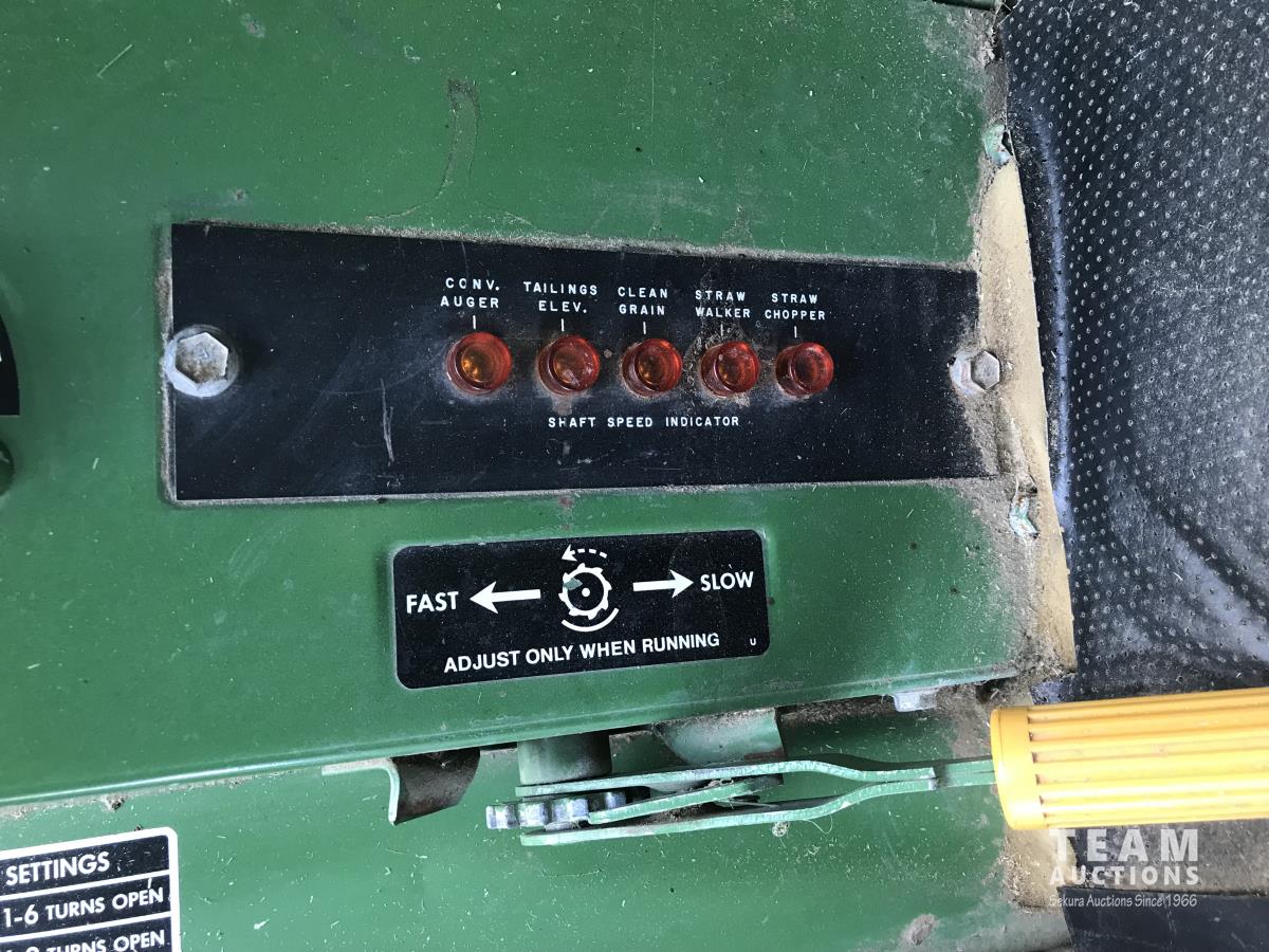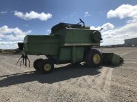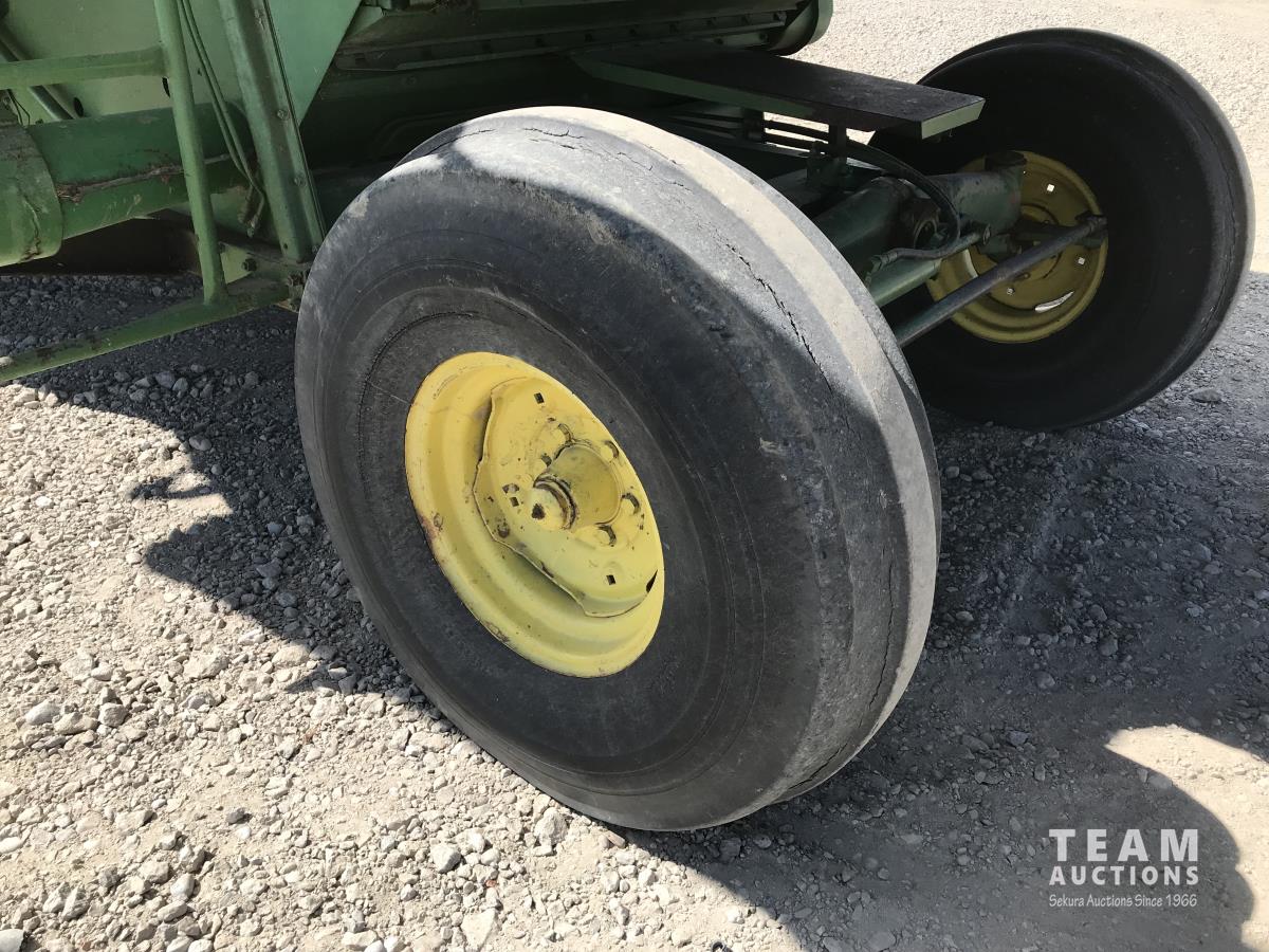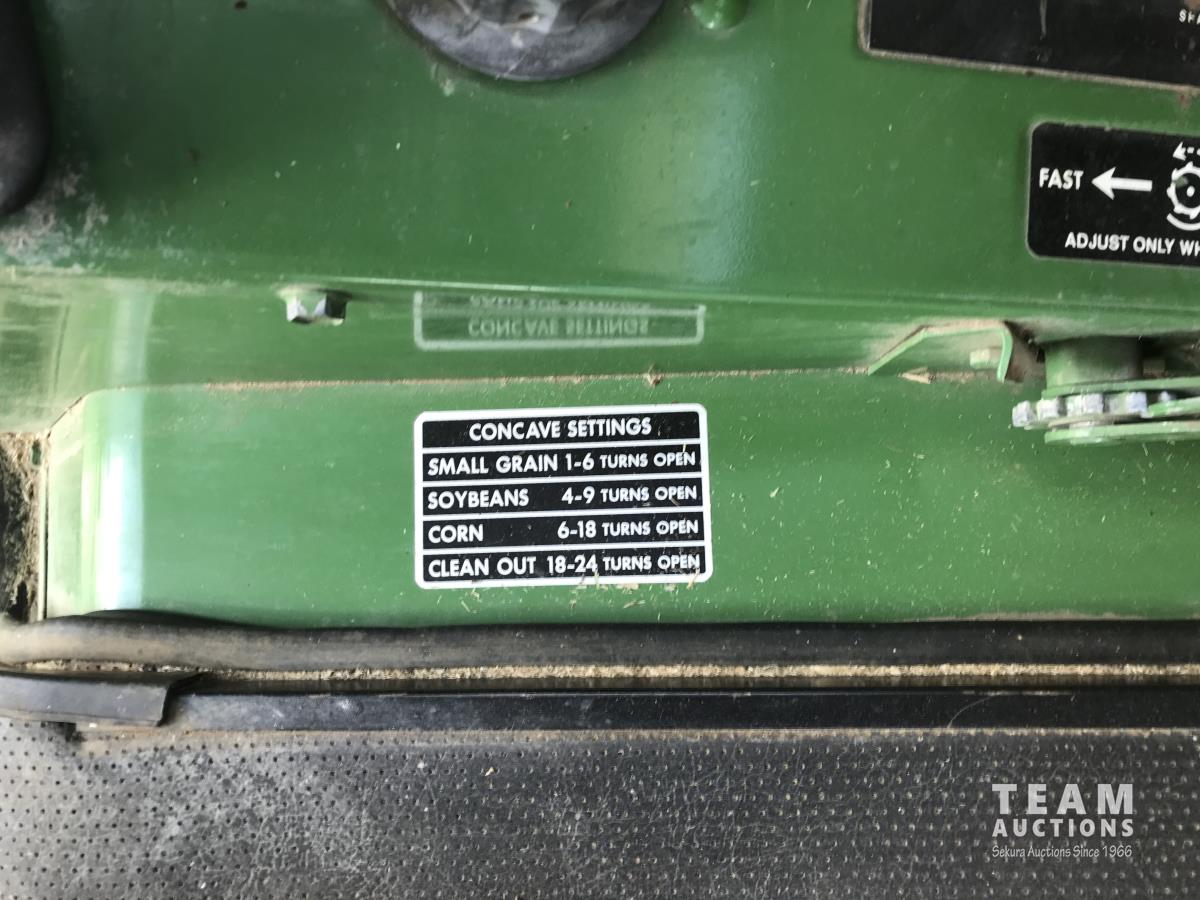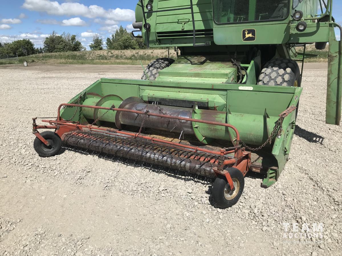 John Deere pick-up header, variable speed reel, rock trap, chaff spreader, 23.1-26 front tires, 11.00-16 rear tires