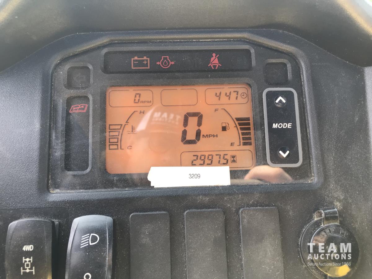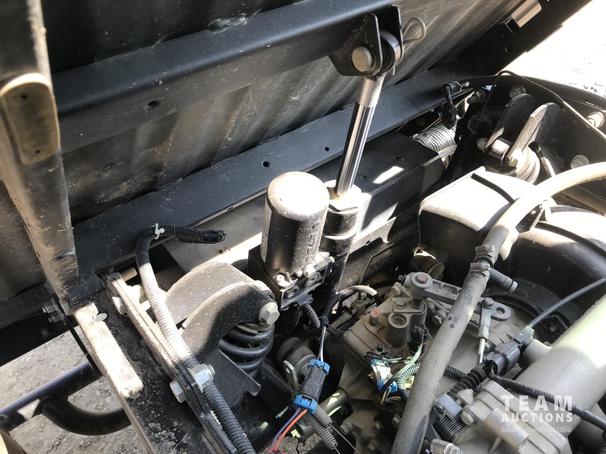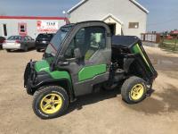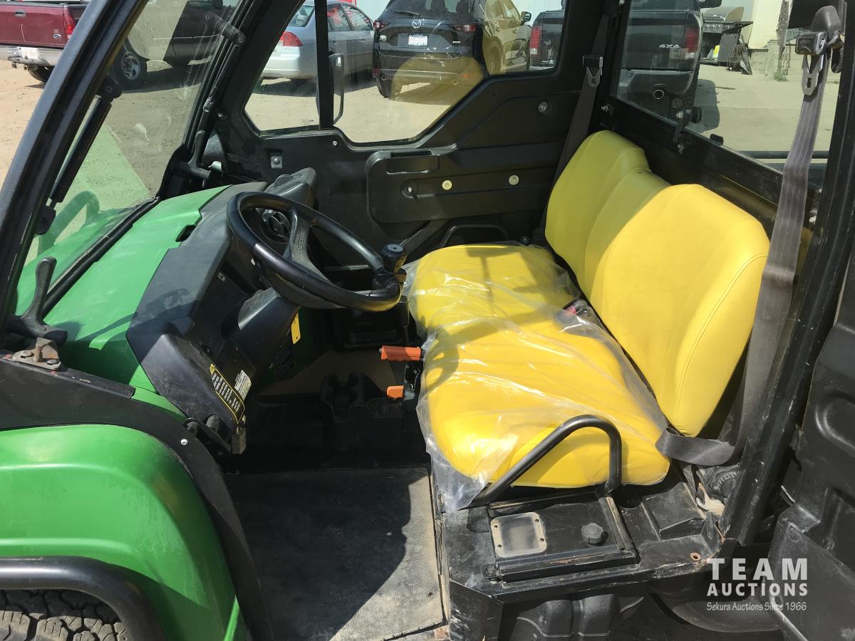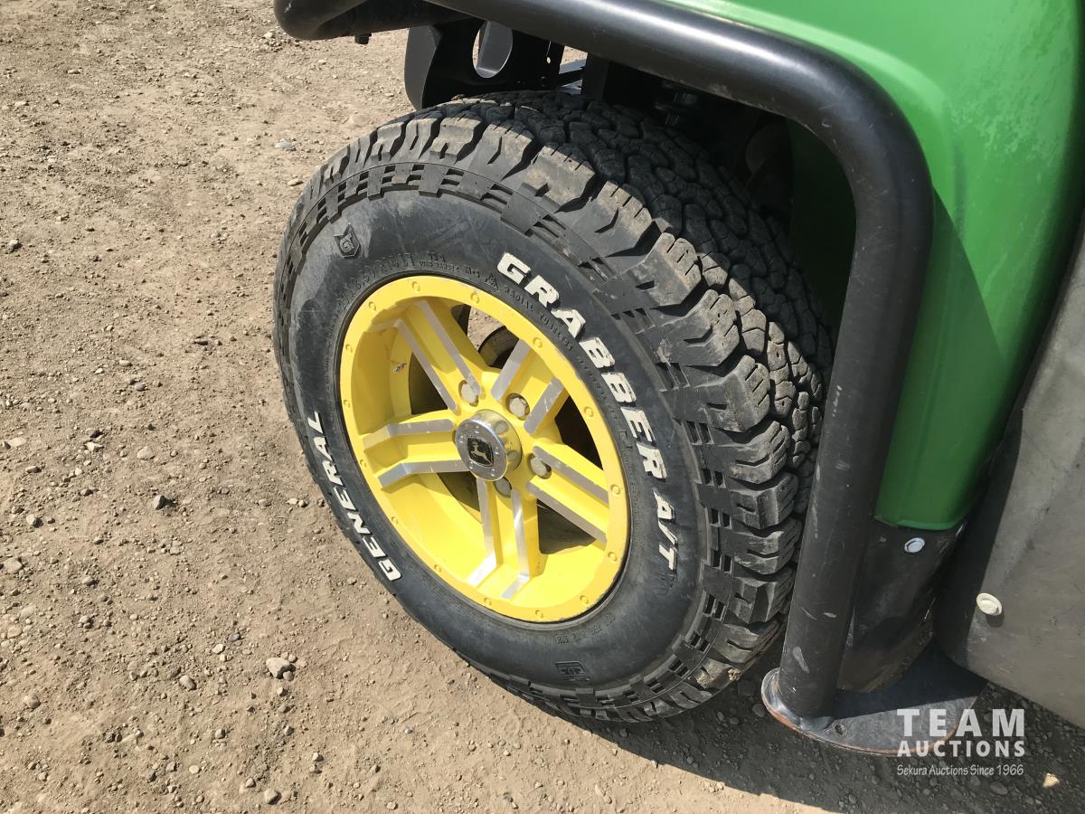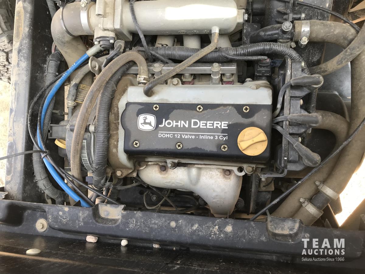 John Deere inline 3 cylinder gas engine, 27 x 8.50R14, hi low gear, enclosed cab, electric box dump