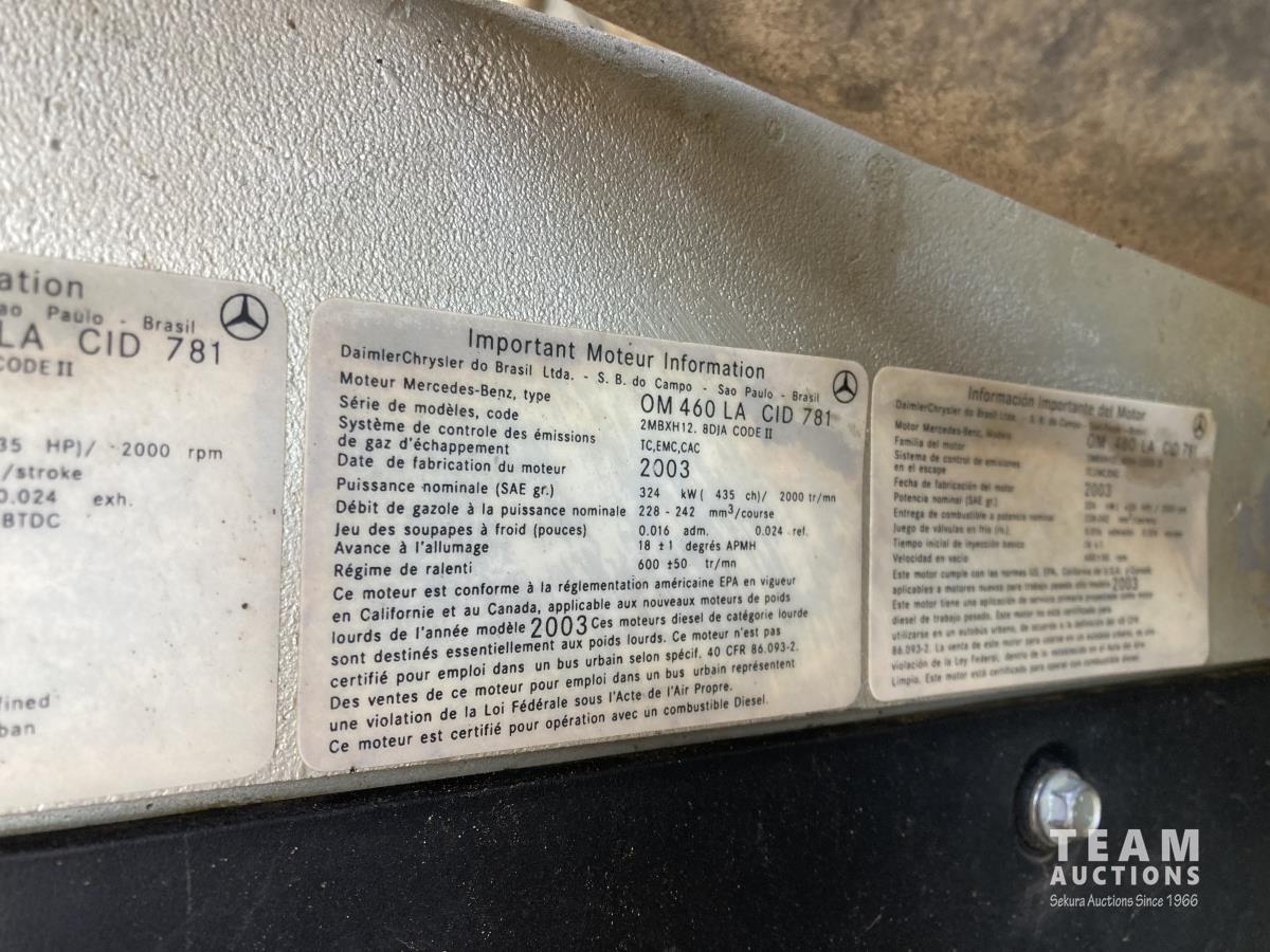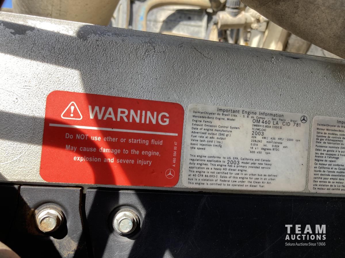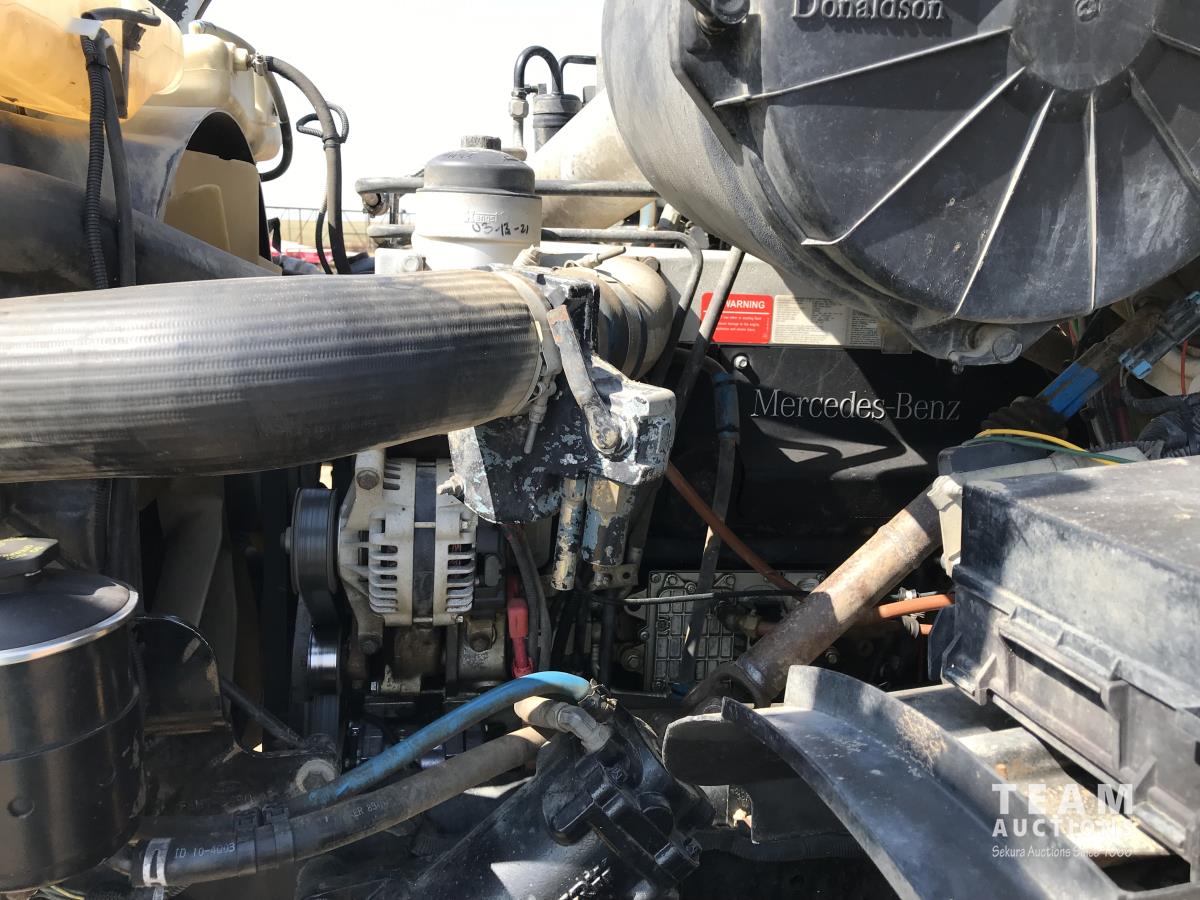 Mercedes-Benz OM460 435 HP engine, Eaton Fuller 18 speed transmission, hydraulic wet kit, air ride suspension, 14,320 lb front axle, 40,000 lb rear axles, diff lock, 236 inch WB, 11R24.5 tires