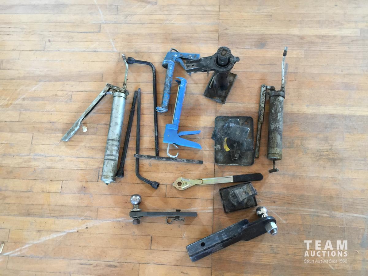(2) Grease Guns, (2) Tow Hitches, (2) Caulking Guns, (3) Wheel Braces, (1) Jack