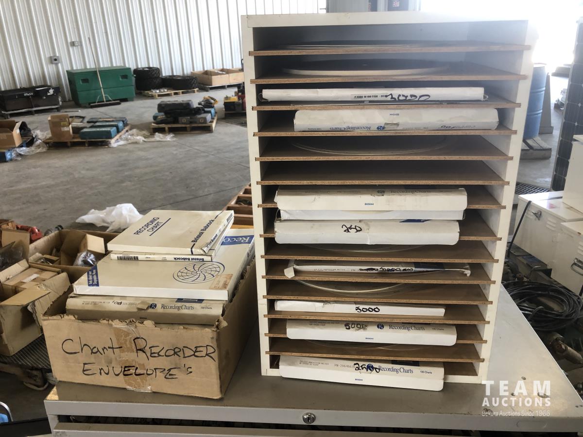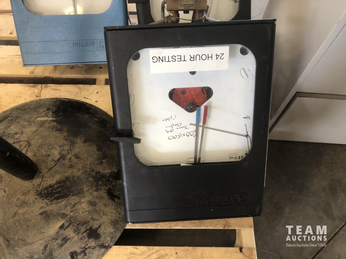 2498 (3) Barton Meters, Metal Stand and Three Drawer Filing Cabinet with Qty of Recording Charts