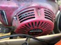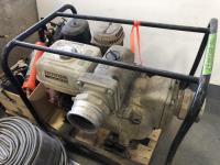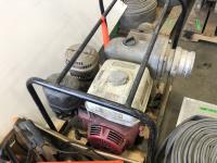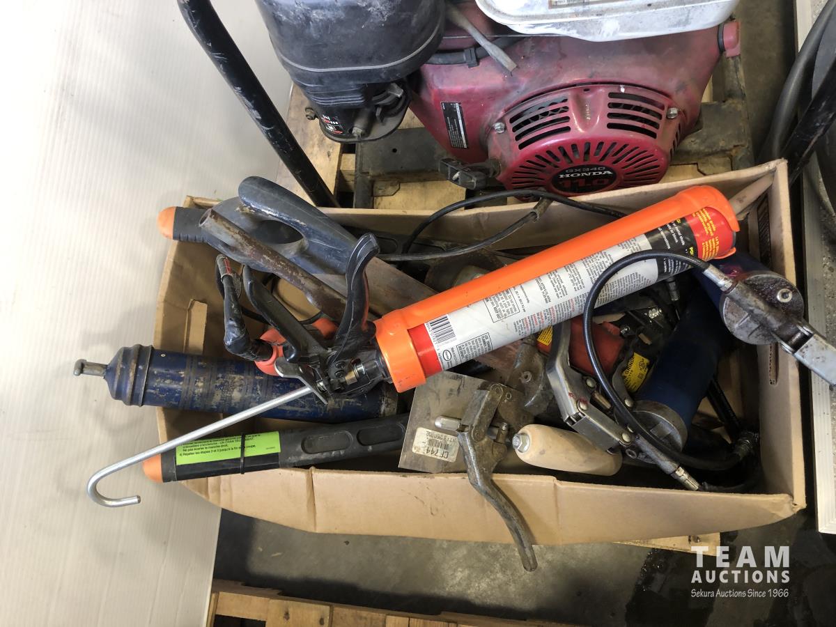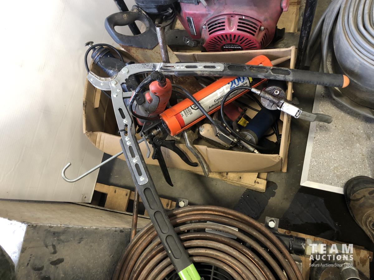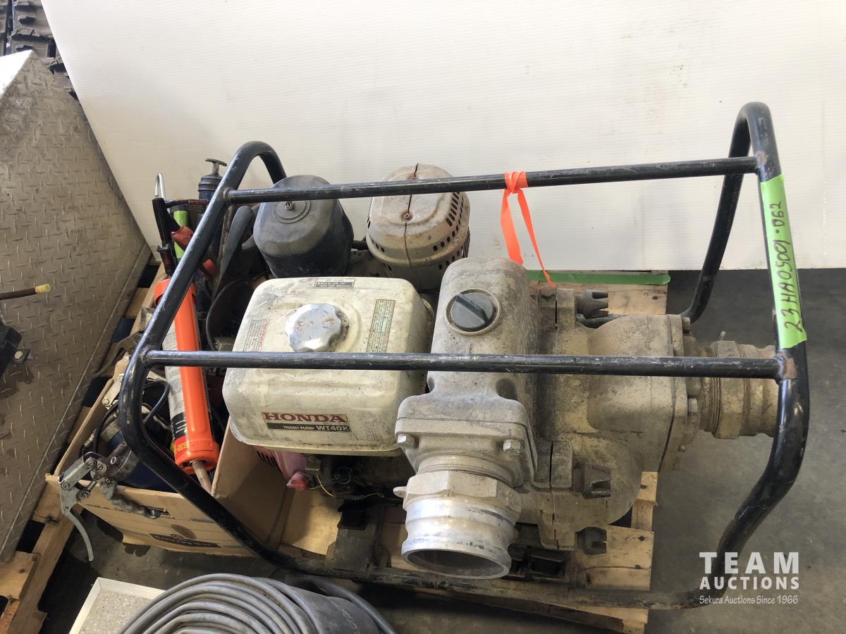Trash pump has 11 HP Honda GX340 engine, assorted tools, grease guns, caulking gun, angle grinders