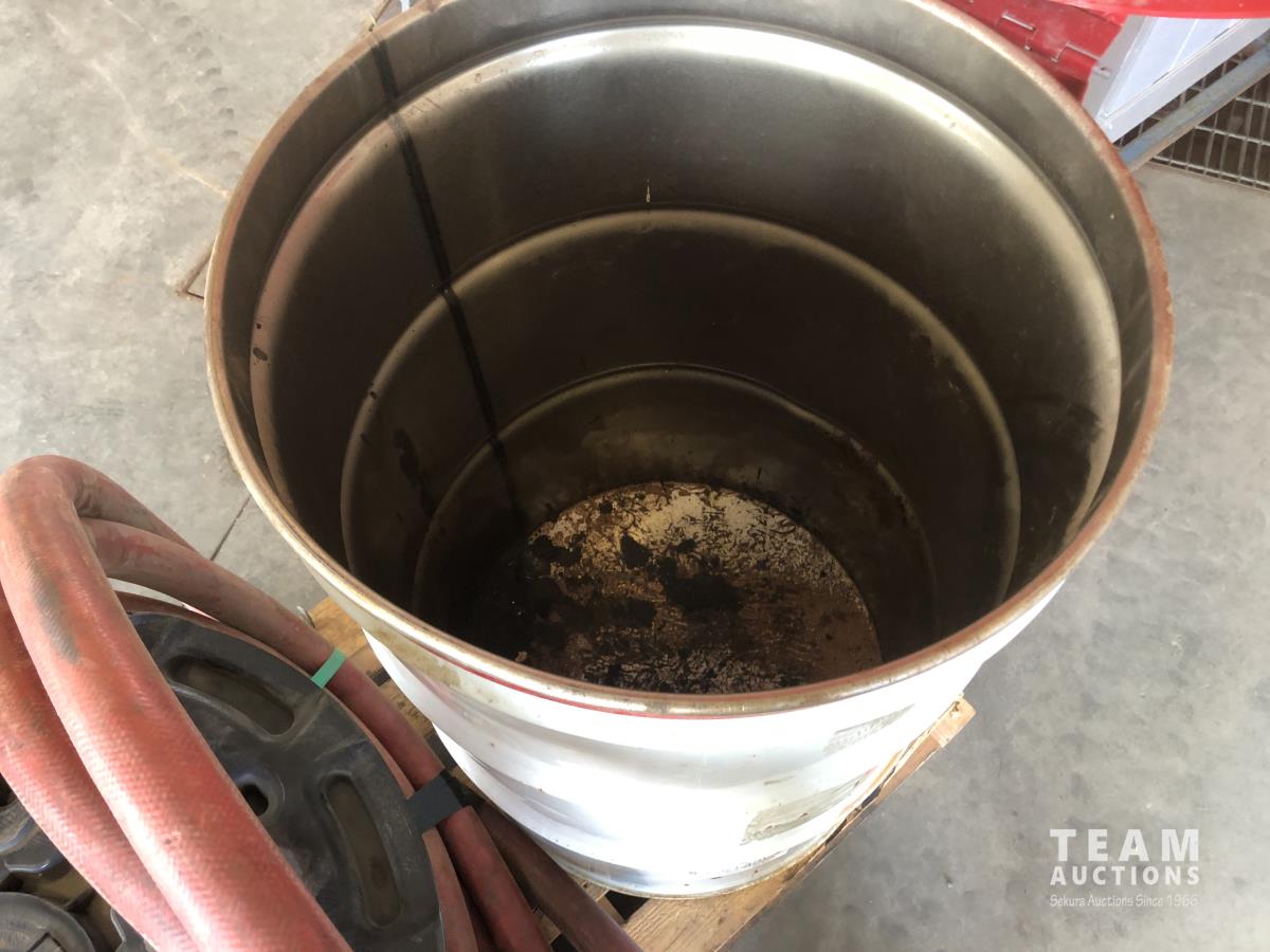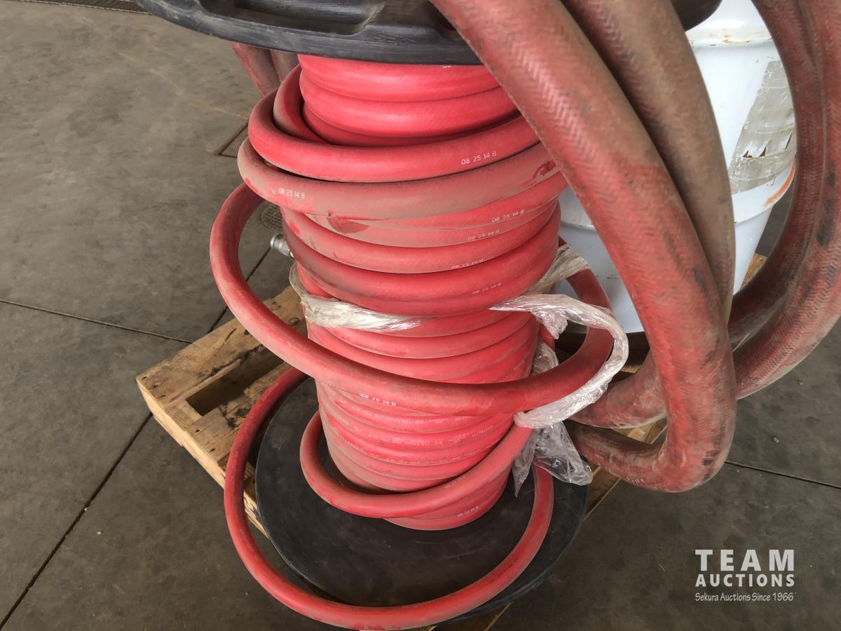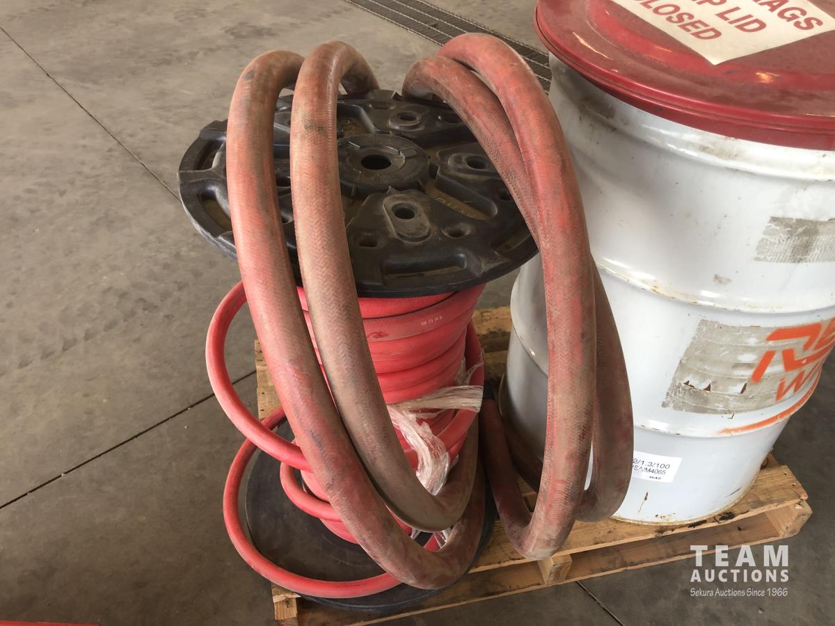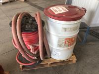 2502 45 Gallon Bin with Hinged Lid, Spool of 1 Inch Rubber Hose and 2 Inch Rubber Hose with Pump Connection