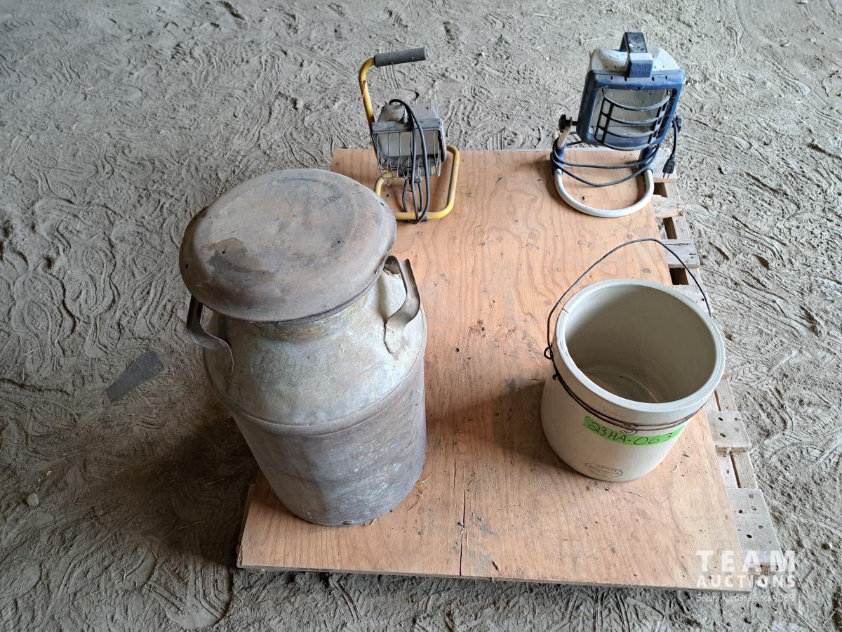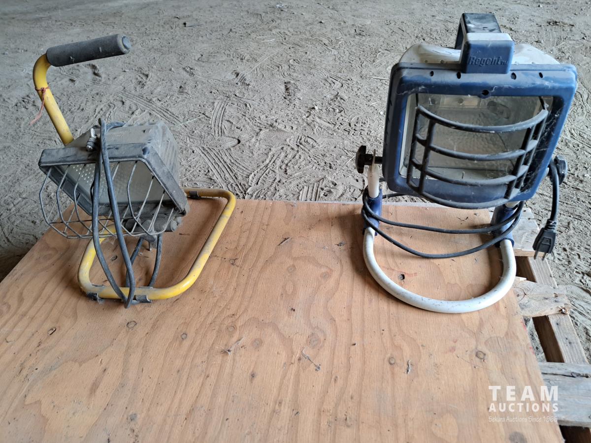 2 halogen work lights, 1 ceramic pottery container with handle
