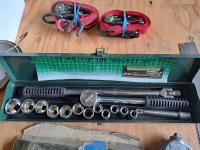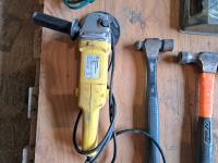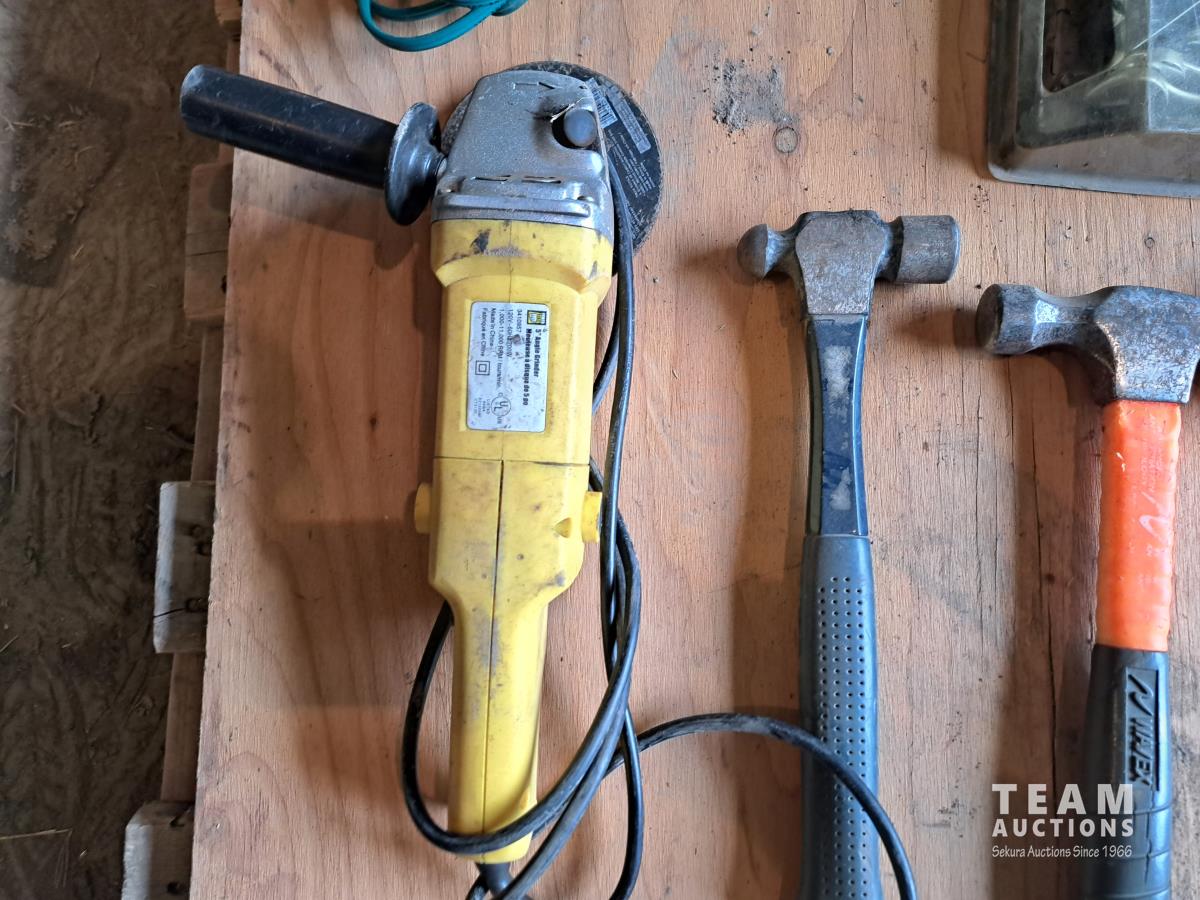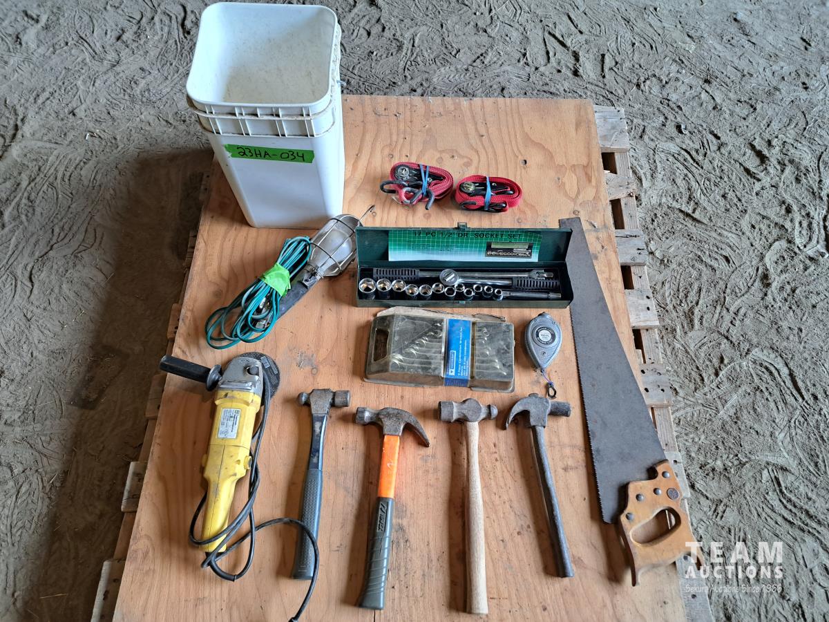 4 hammers, carpenter saw, corded grinder, standard open end wrenches, trouble light, chalk line, socket set, 2 ratchet straps