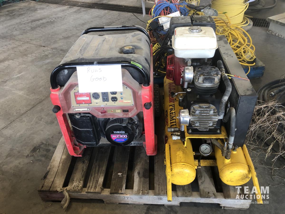 Generator: electric ignition, single phase, 120/240V, Yamaha MZ300 motor, serial number E35500400B Air compressor: Honda 9.0 GX270 motor, gas powered, Model TT90G, serial number HO12474