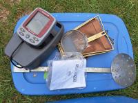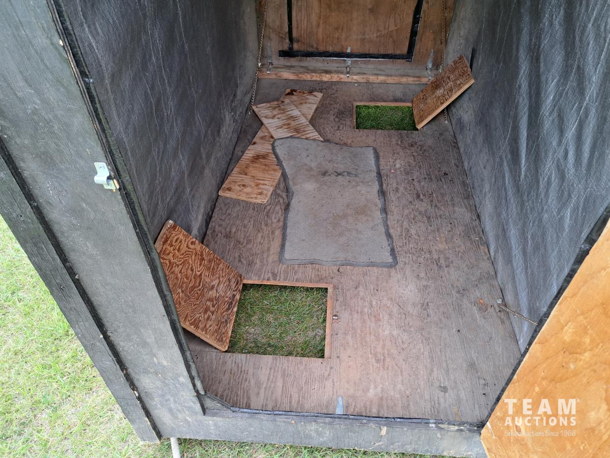 Portable collapsible ice fishing shack on skids for pull behind, 2 doors, assorted ice fishing equipment, fish finder