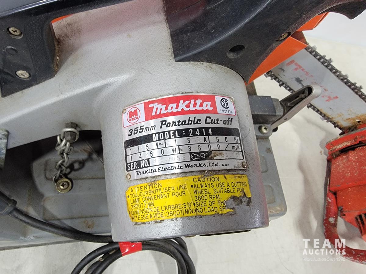 1635 Makita 355mm Portable Cut-off, Homelite Chain Saw and Motormaster 6 Ton Bottle Jack