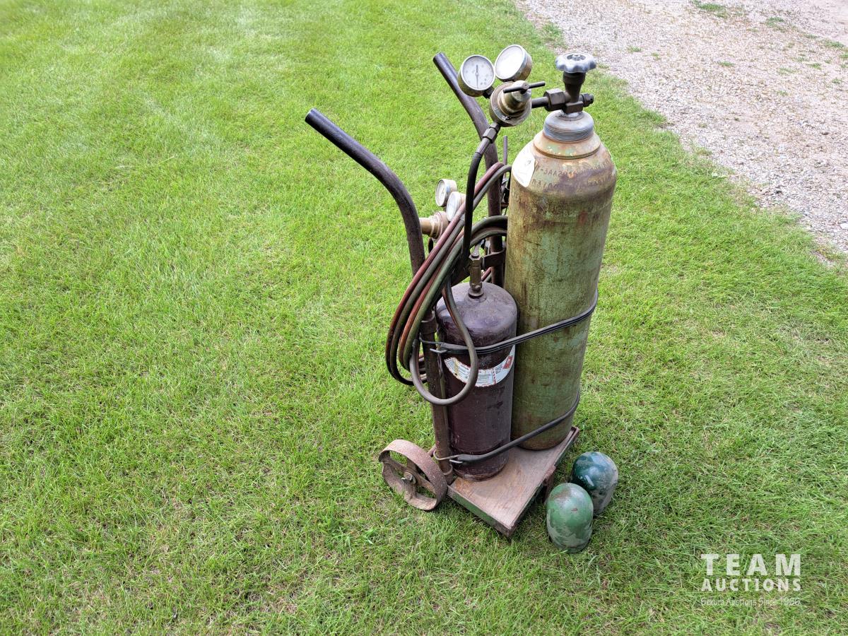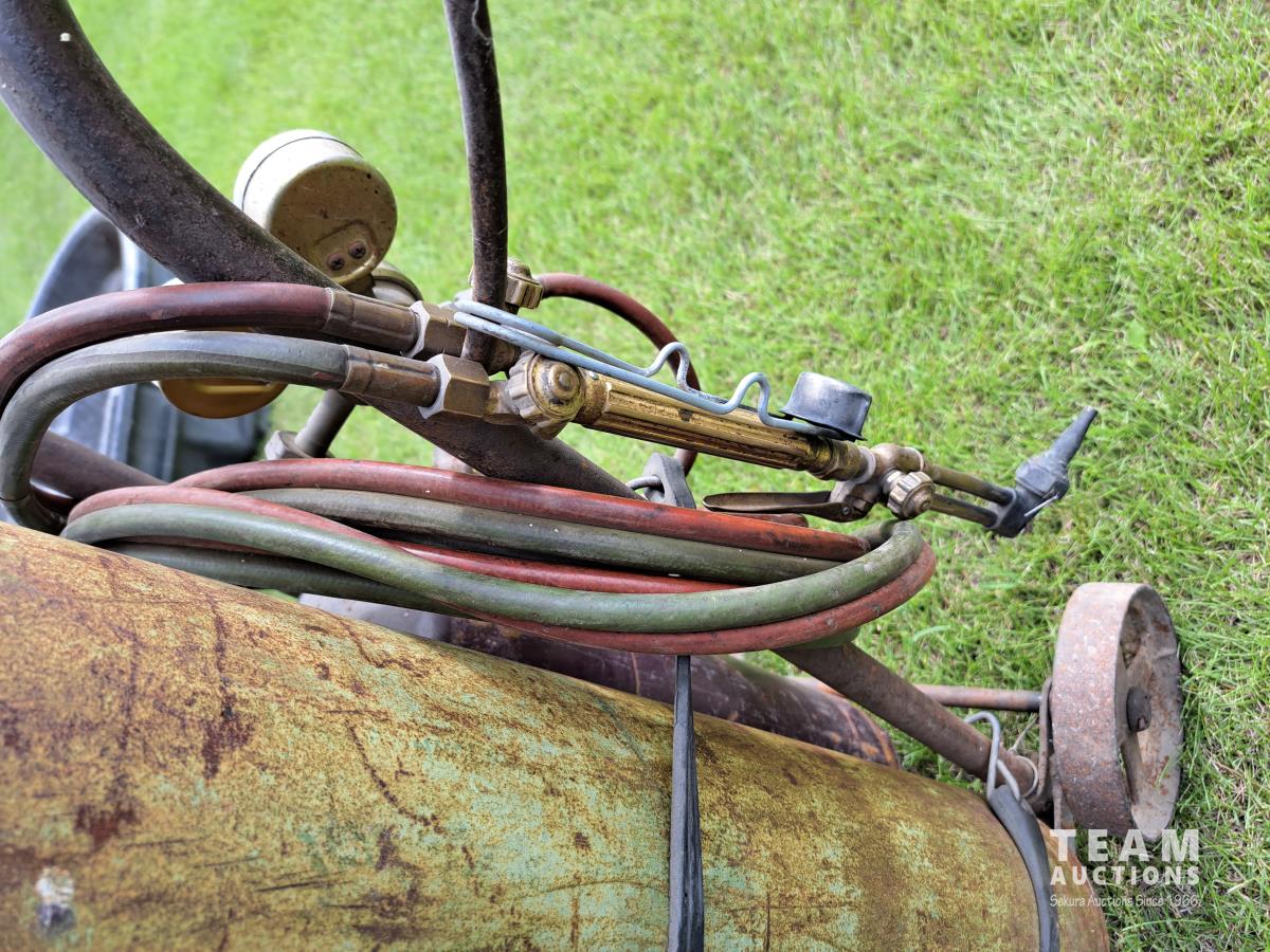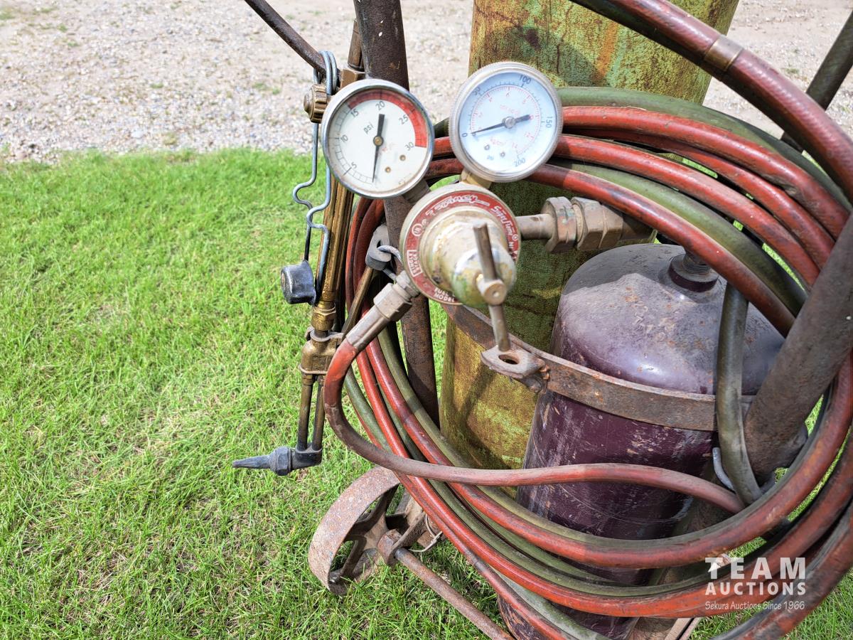 Wheeled cart, cutting torch, hoses and gauge assembly.