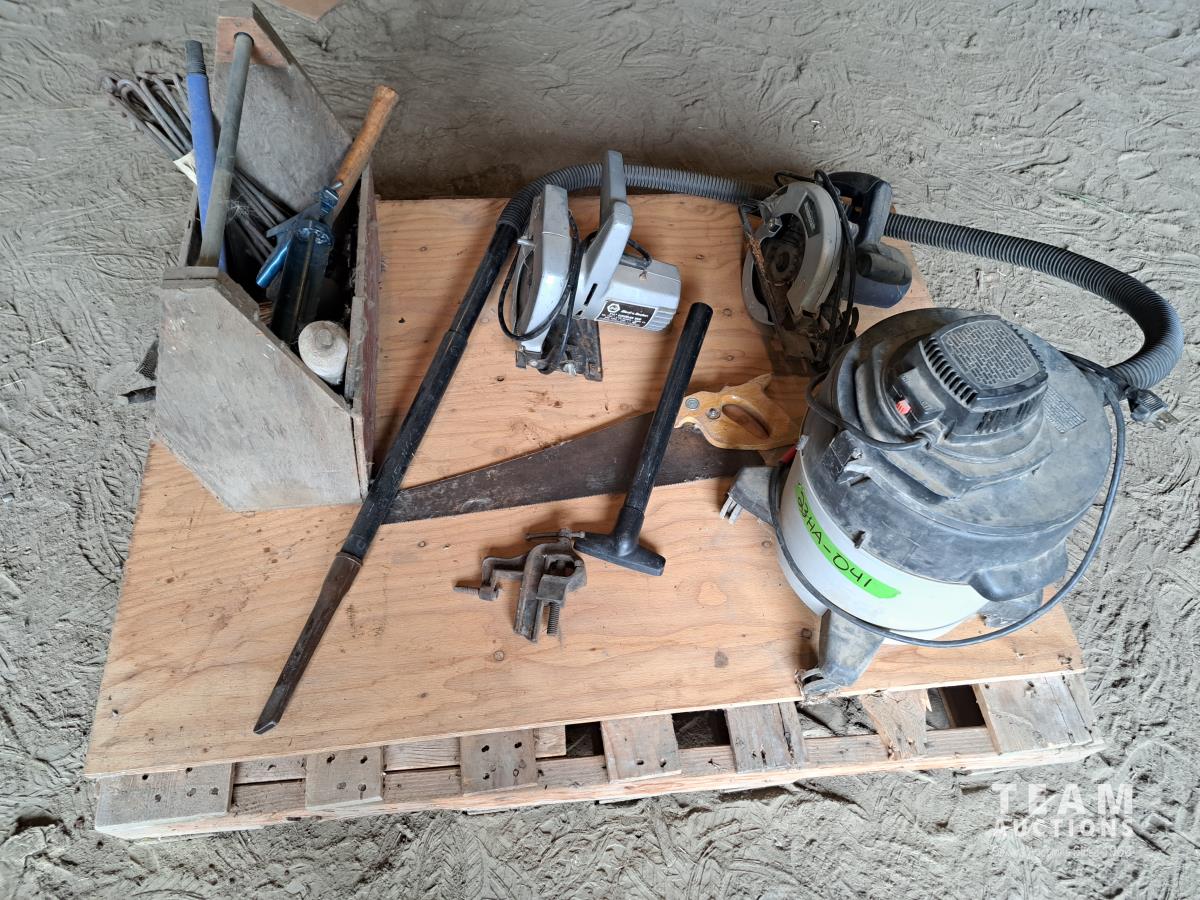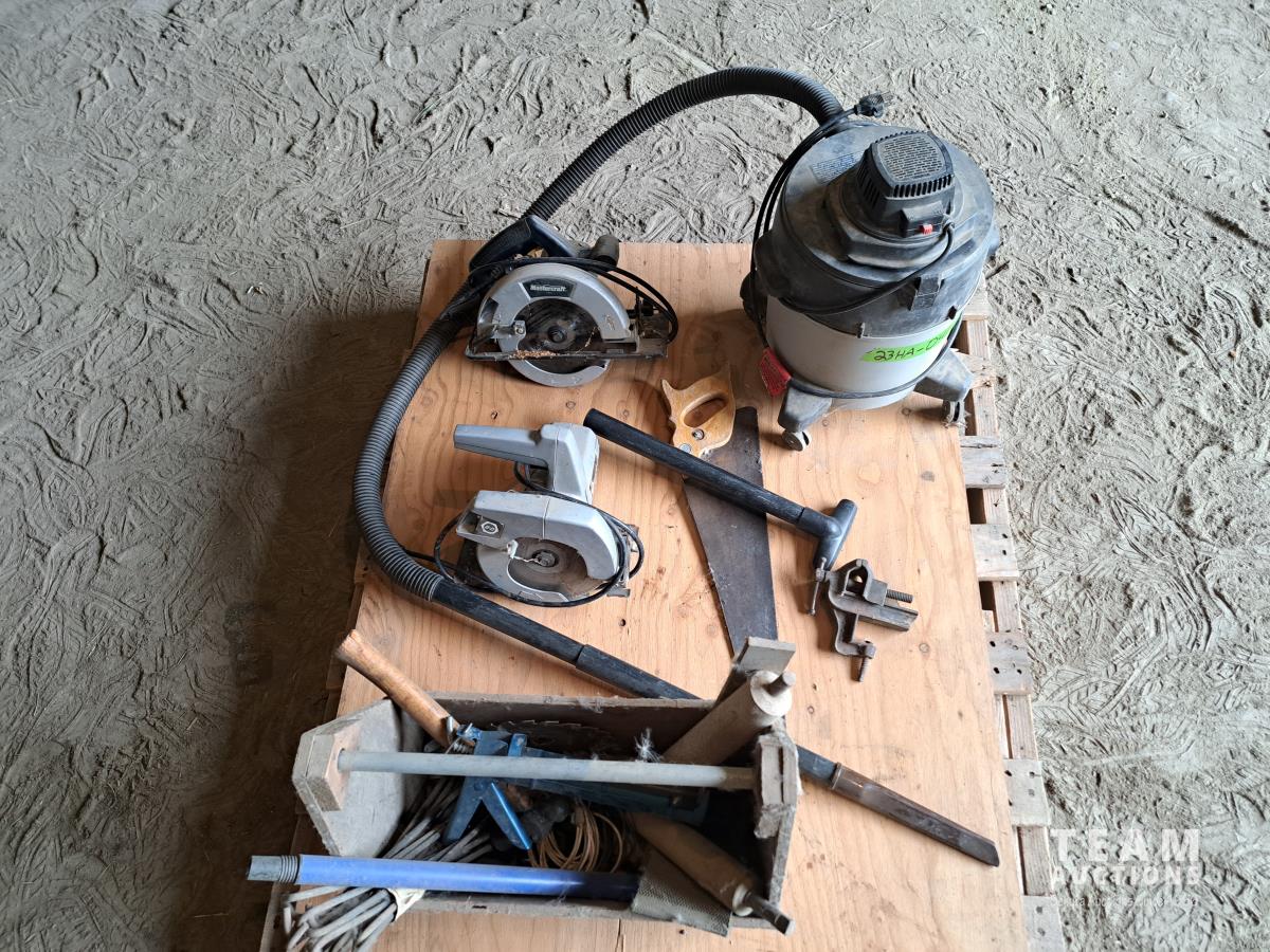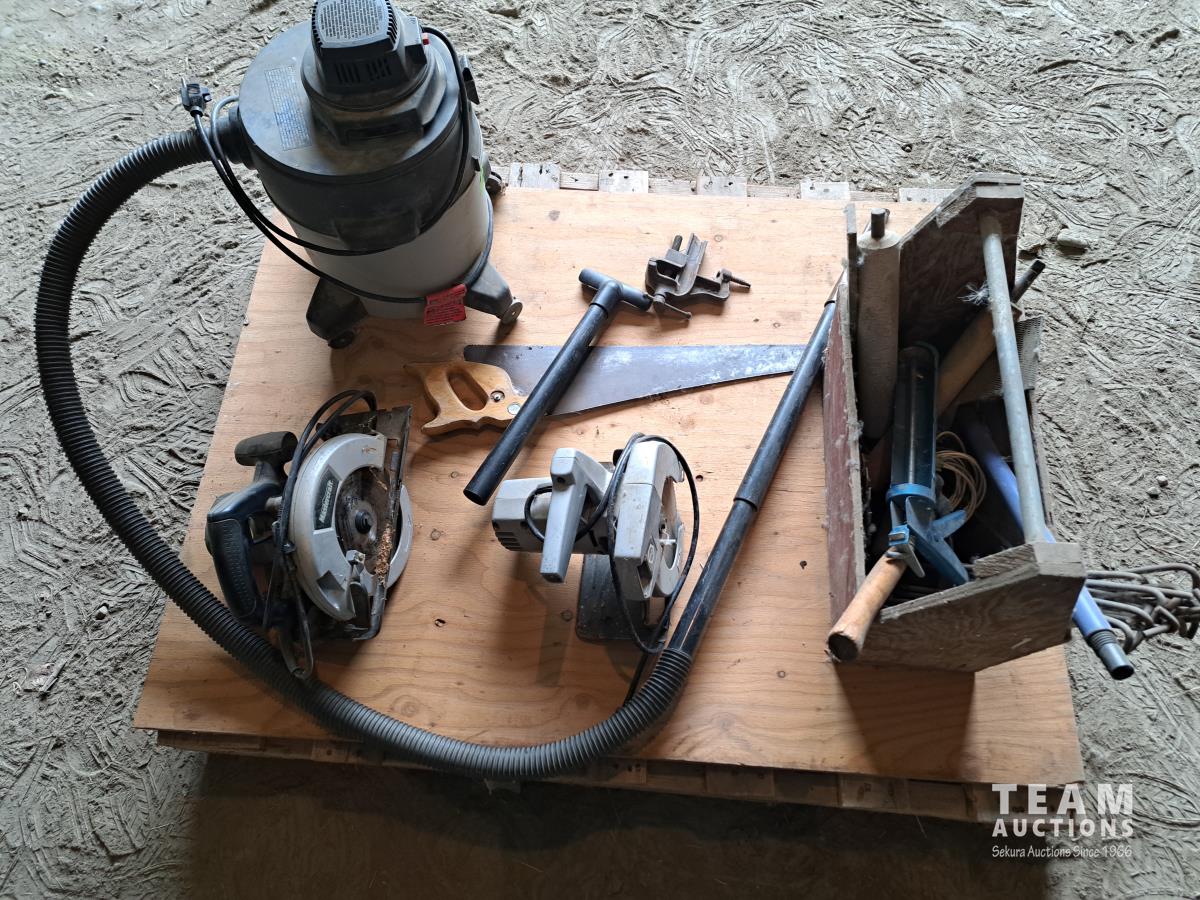 Shop vac, 2 skill saws, hand saws, tool box with miscellaneous.