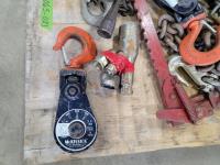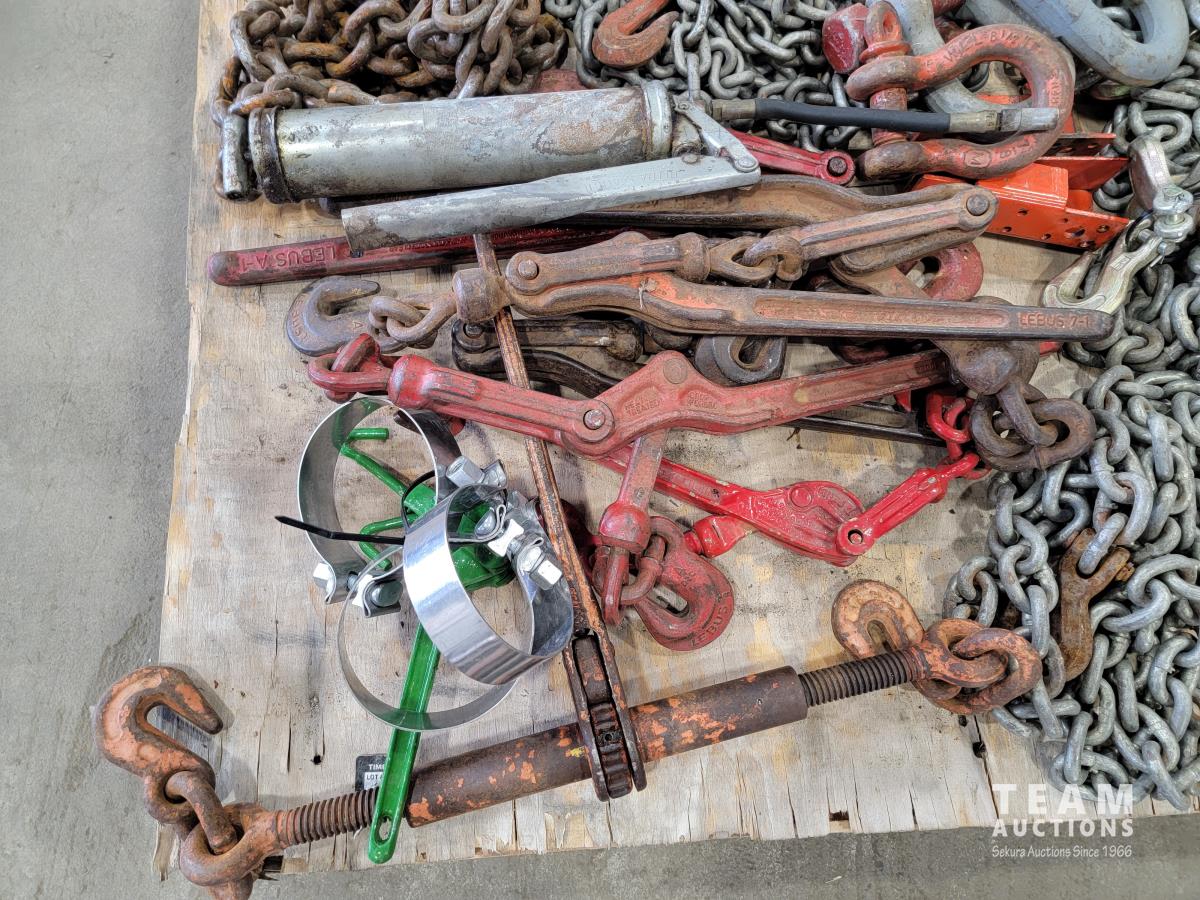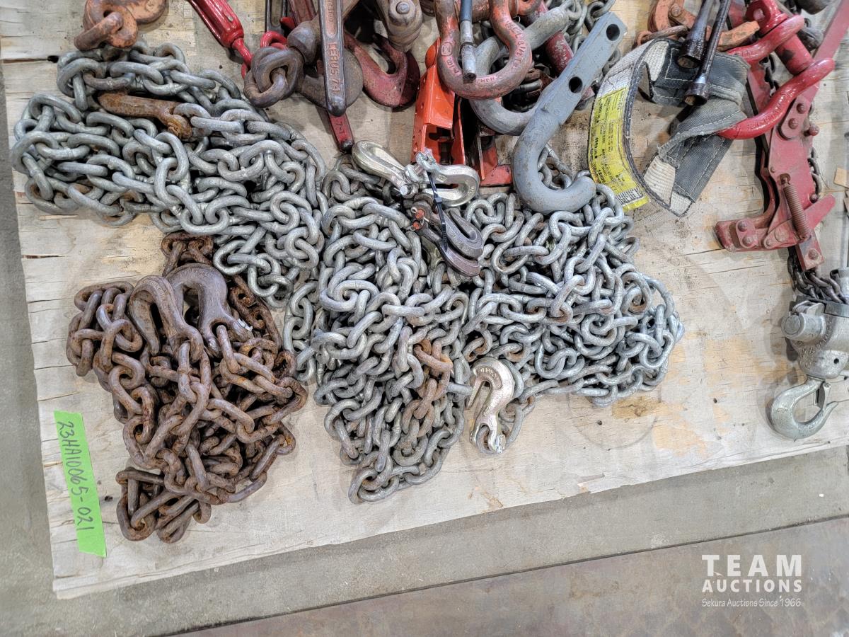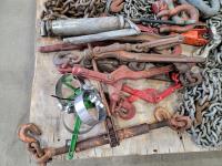 2024 Qty of Chains and Hooks, Assorted Boomers, Clamps, Chain Hoist and Grease Gun