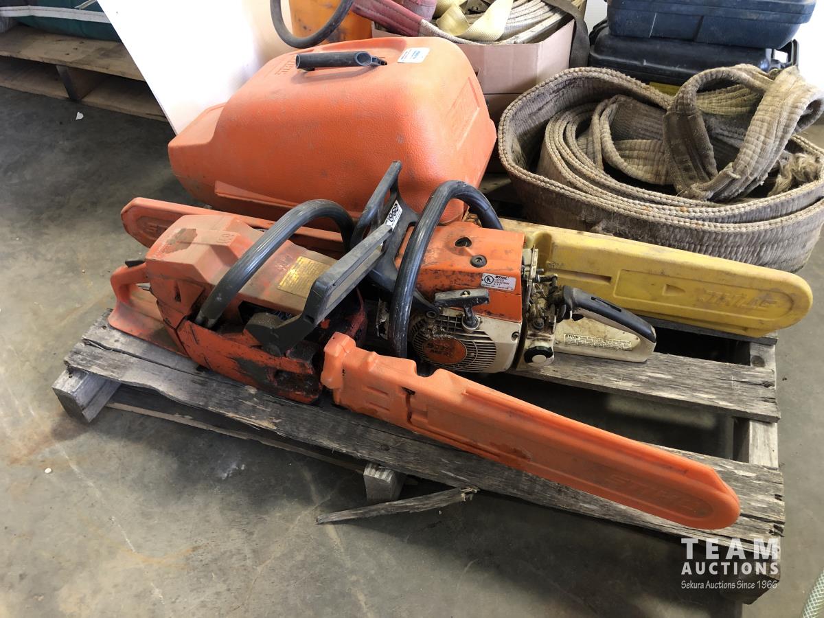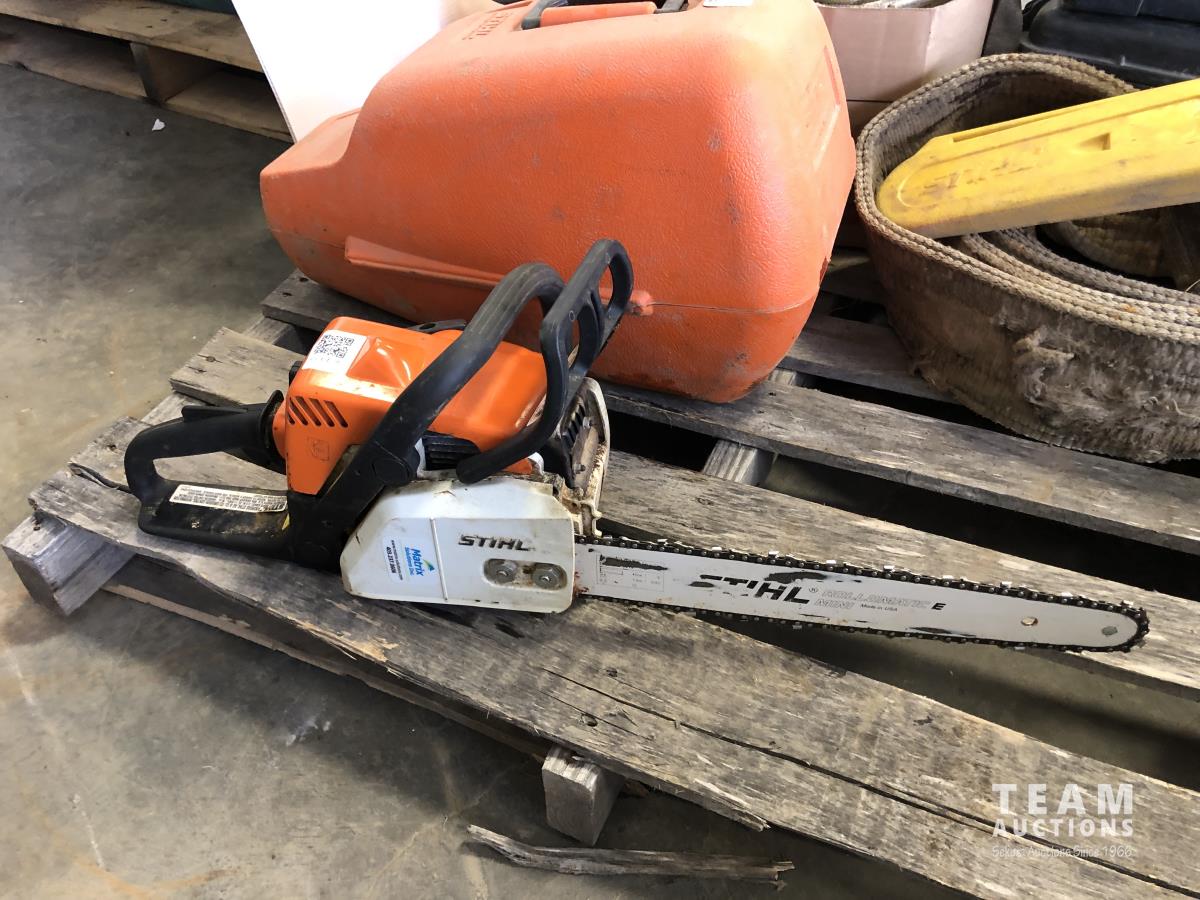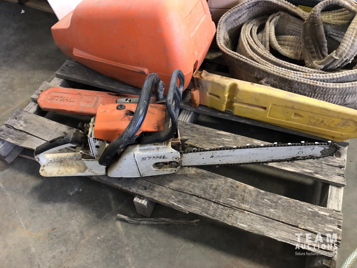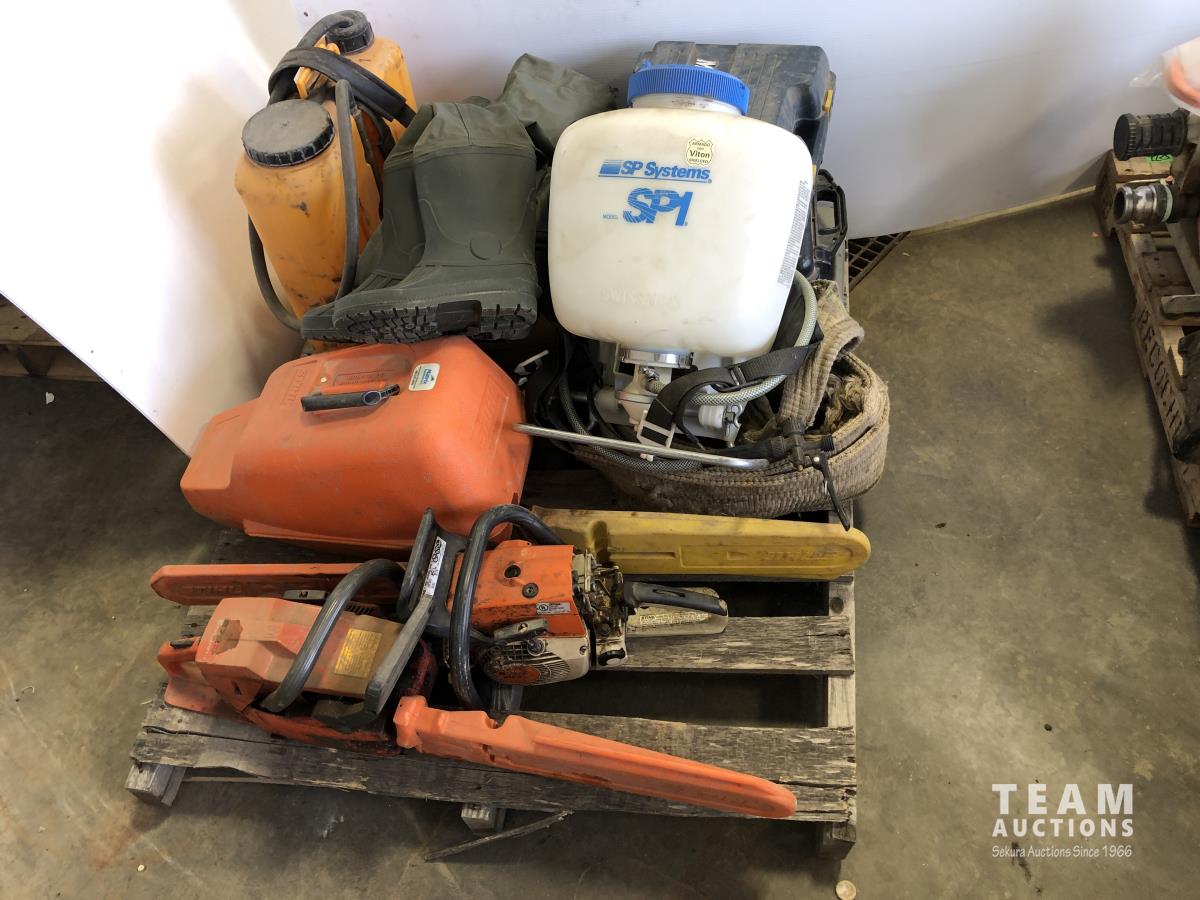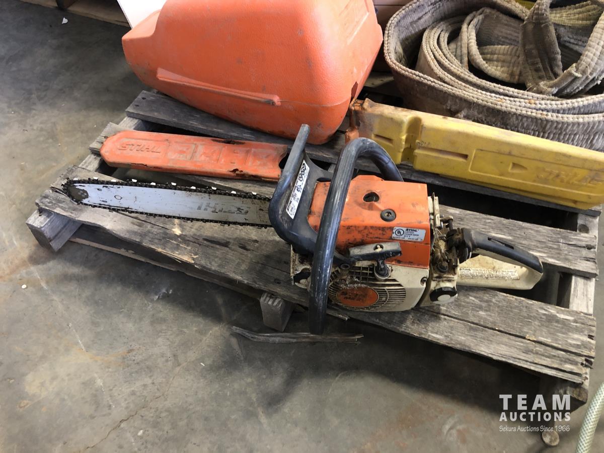 Back pack water pump, slings, straps, backpack sprayer, size 10 hip waders, Husqvarna 272XP chainsaw with 20 inch bar, Stihl MS170 chainsaw with 14 inch bar and case, Stihl MS260 chainsaw with 16 inch bar, drill bit set, pelican case, 1/2 inch drive impact sockets