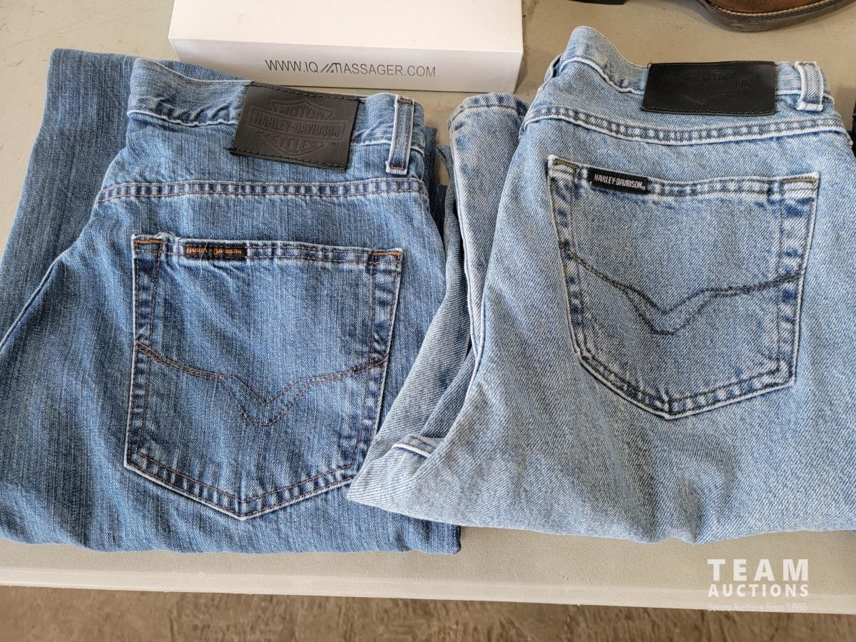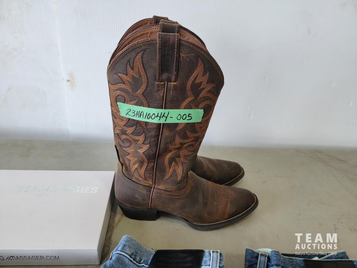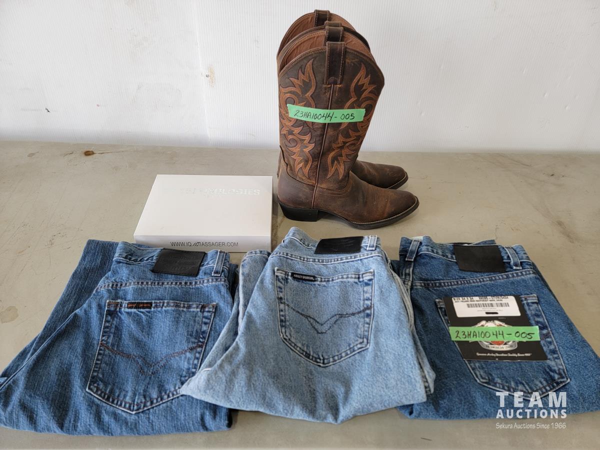 Justin size 9.5EE cowboy boots, IQ technologies muscle stimulator, (3) pairs of Harley Davidson jeans size 34X34