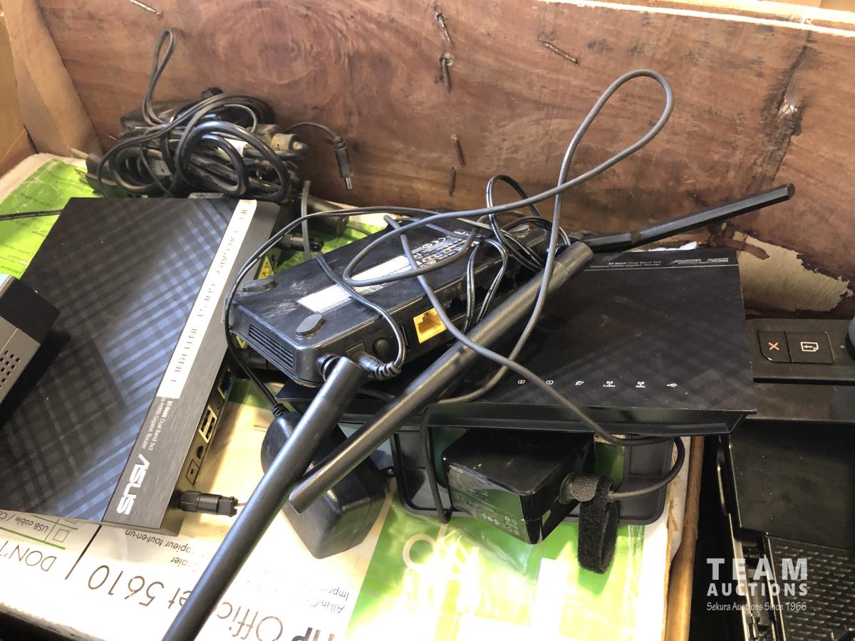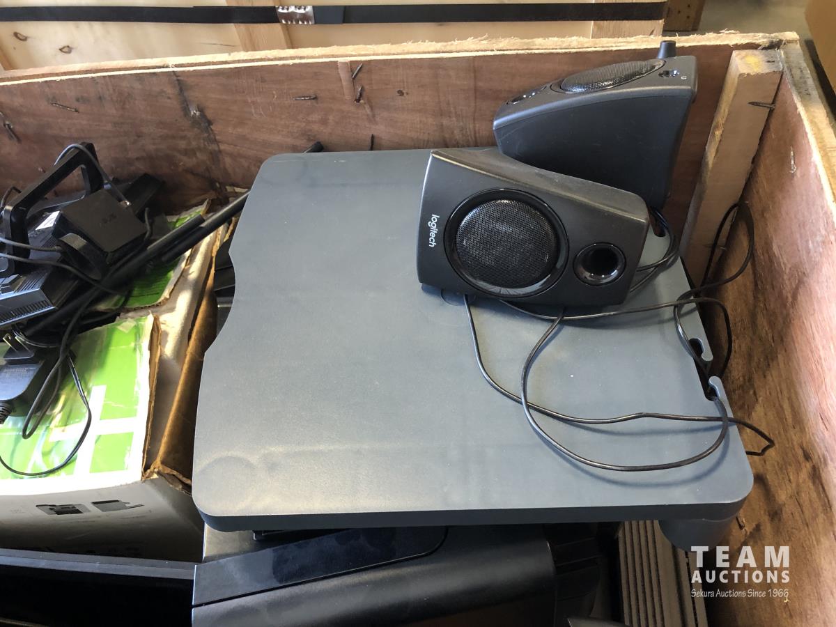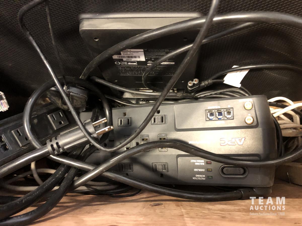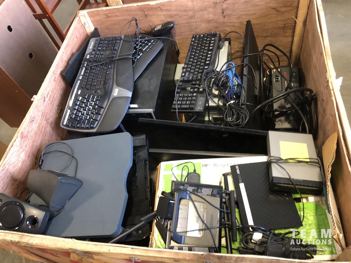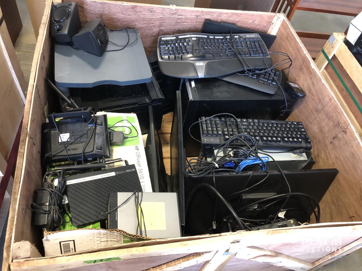 Computers, printers, keyboards, monitors and miscellaneous related equipment. Three tier shelf: 29.5 inch l x 11.5 inch d x 43.5 inch h, includes contents