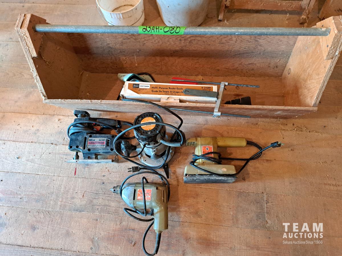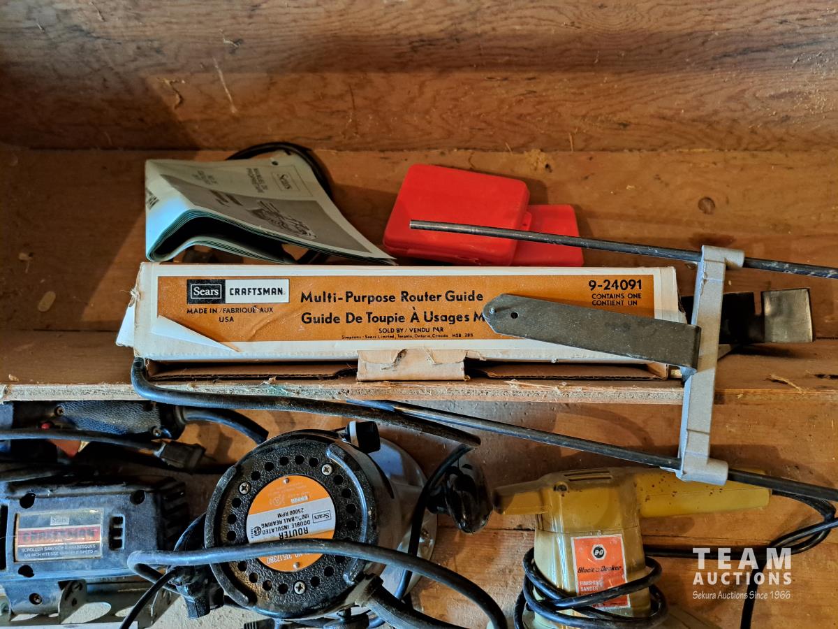 Sander, jig saw, router, some non operable, carpenter toolbox.