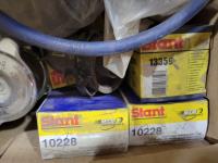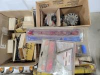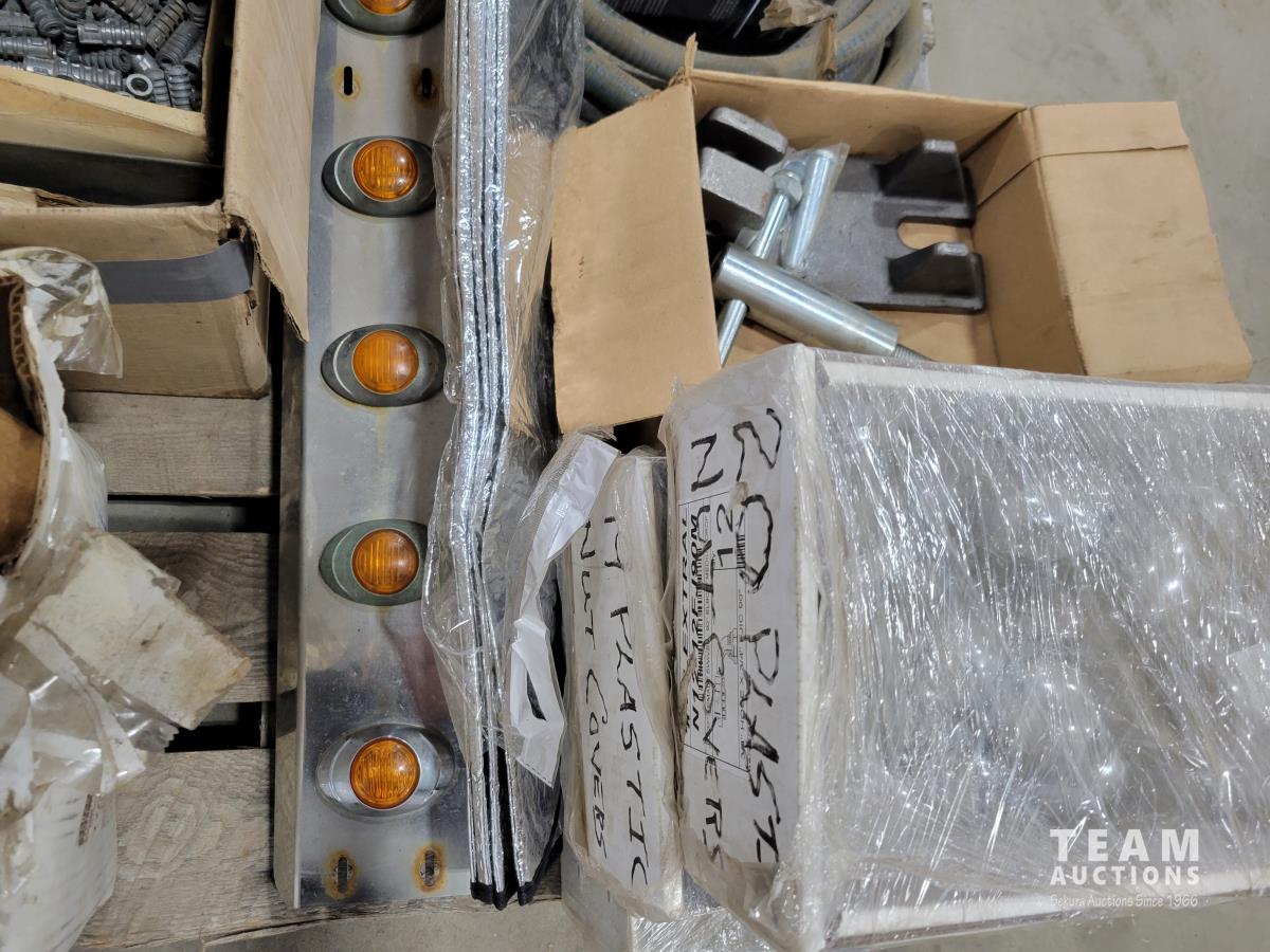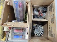 Qty of gauges, various truck flags, Gladhand grips, various sized threadfasts, rad caps, Torctite 4 inch exhaust clamp, plastic lug covers
