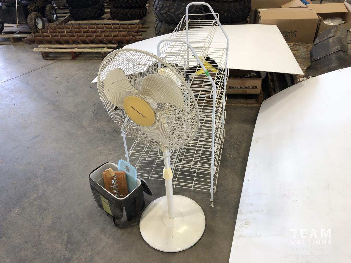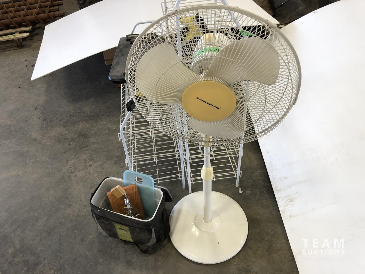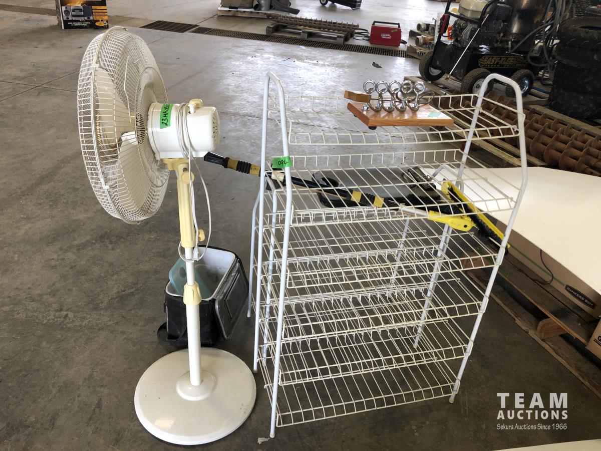 Durabrand oscillating electric fan, set of 4-wire shelves: (1) 26 inch w x 11 inch d x 28h, (1)26 inch w x 11 inch d x 42 inch h, cooler, puzzle game, clip board with calculator, (2) vehicle brushes