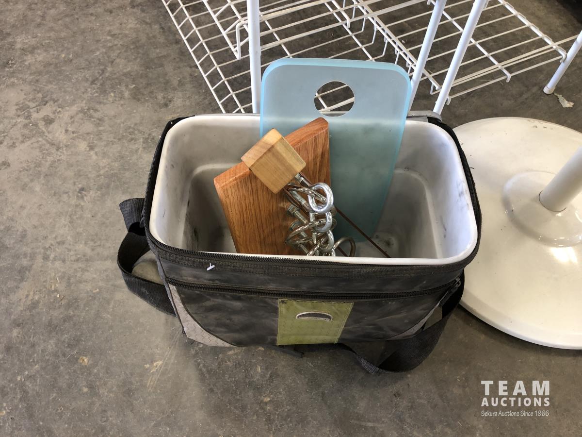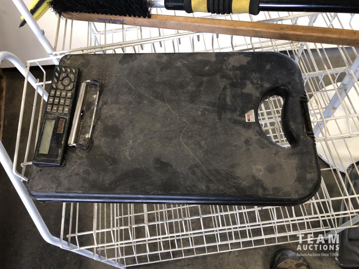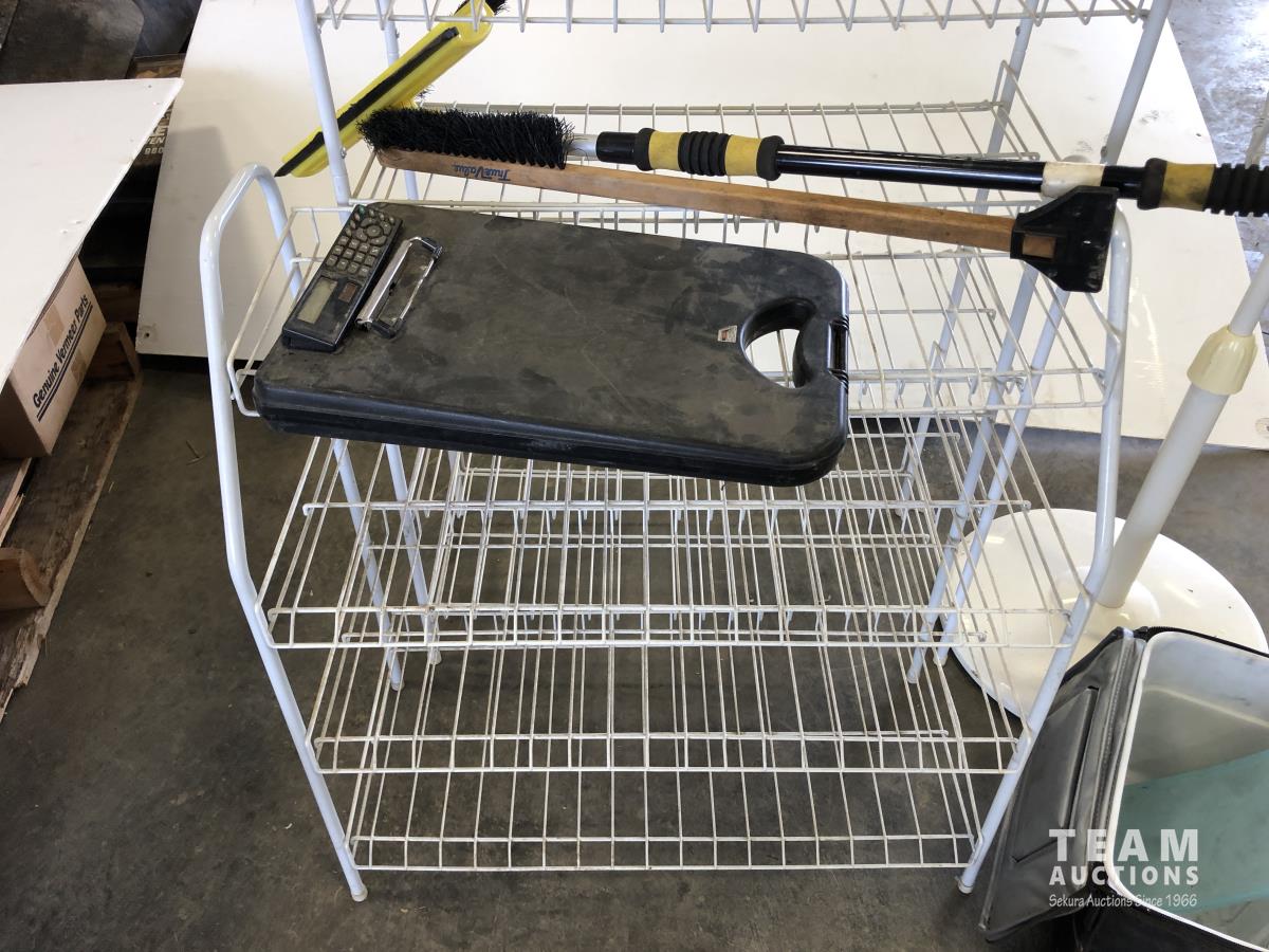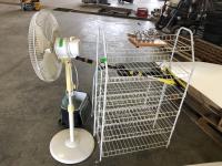 Durabrand oscillating electric fan, set of 4-wire shelves: (1) 26 inch w x 11 inch d x 28h, (1)26 inch w x 11 inch d x 42 inch h, cooler, puzzle game, clip board with calculator, (2) vehicle brushes