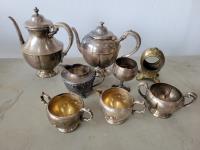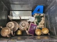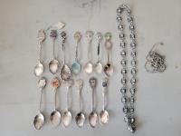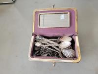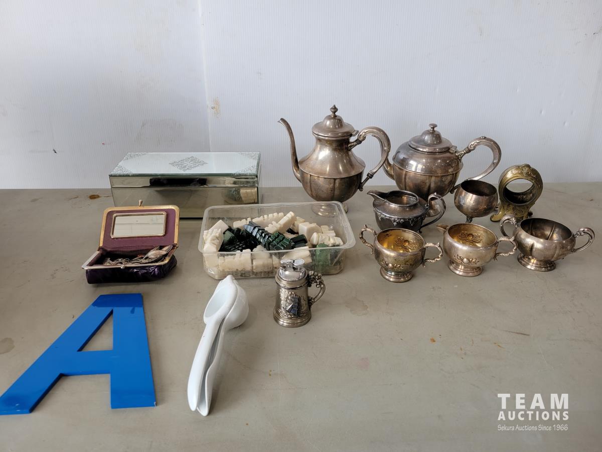 Copper tea set, qty of collectable spoons, mirrored box with costume jewelry, carved chess pieces