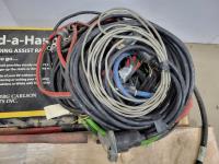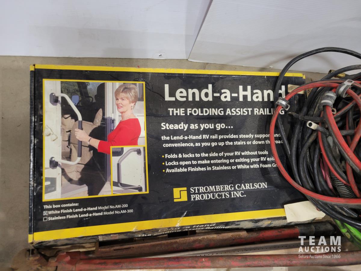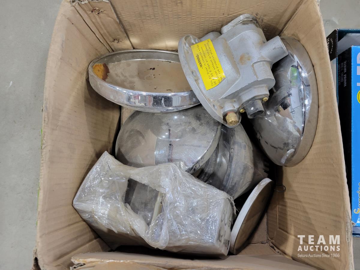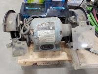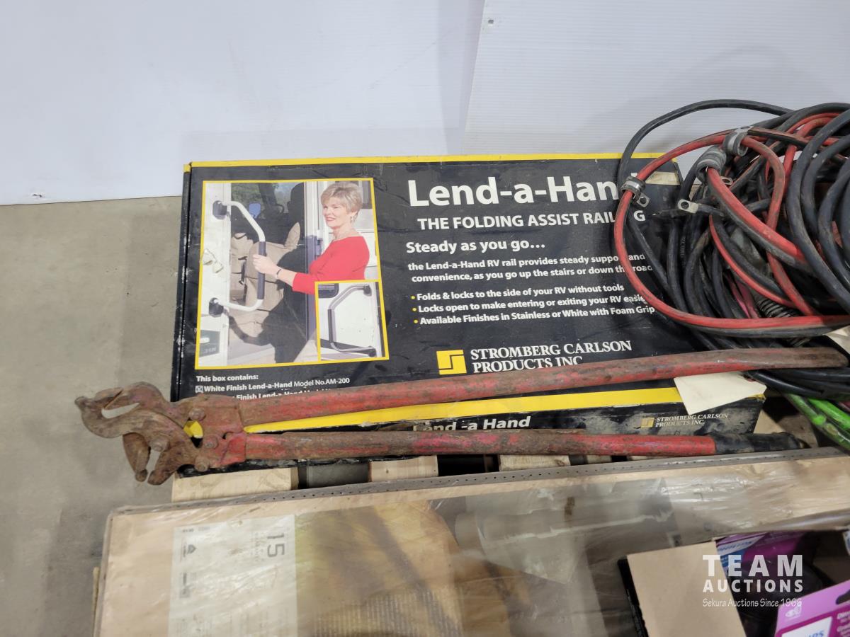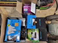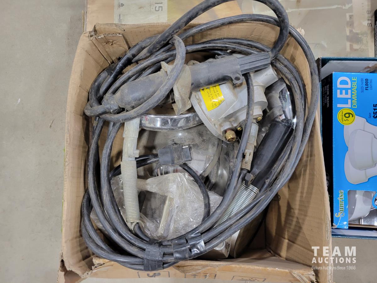Brico 8 inch bench grinder, qty of light bulbs, miscellaneous truck parts, RV folding handle, chain pliers